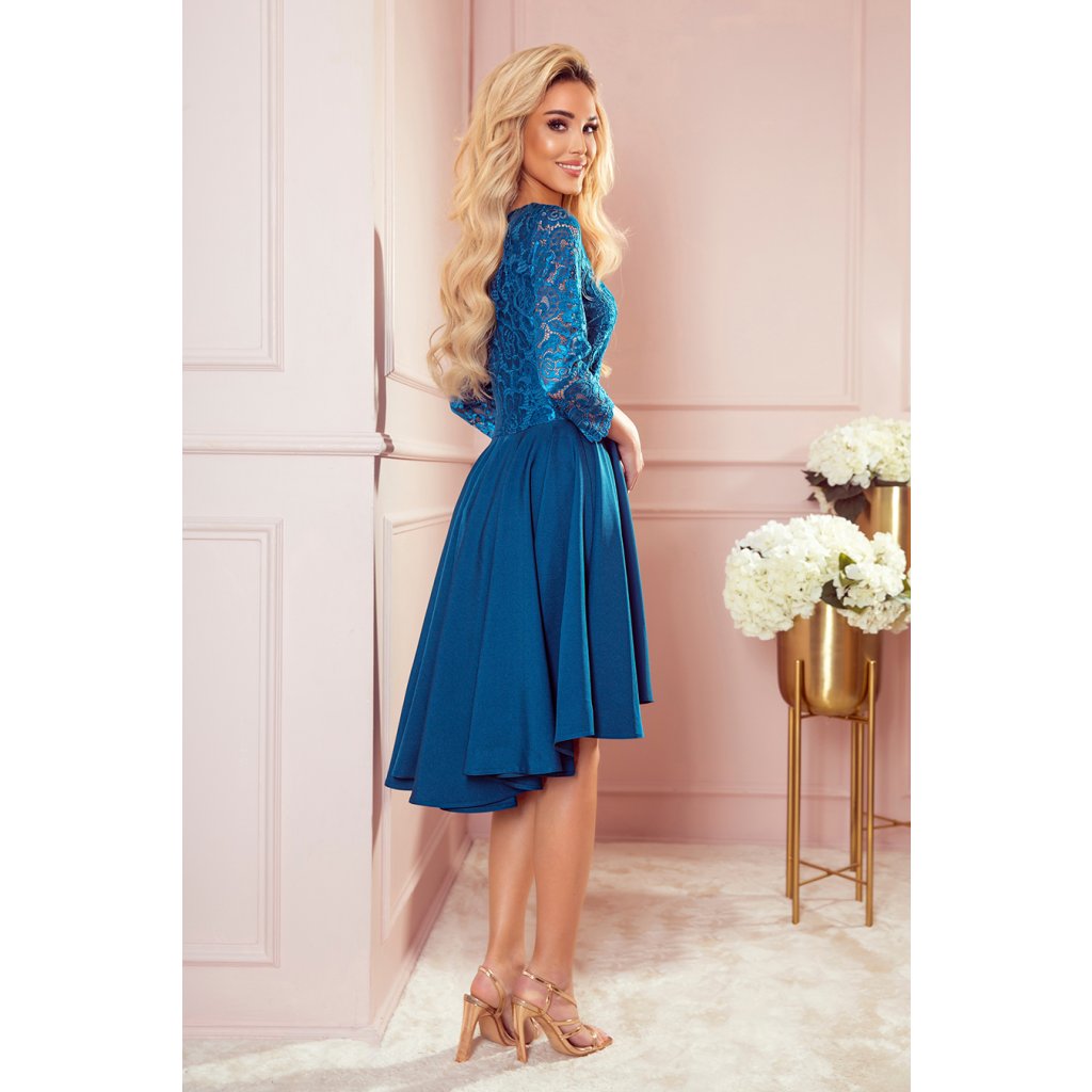 Nicolle - asymetrické exkluzívne šaty s dlhším chrbtom, 3/4 rukávy, výstrih a čipka. Farba mora. Sukňa s dlhším chrbtovým volánom bude ideálna na tanec. Poľská produkcia. Numoco
