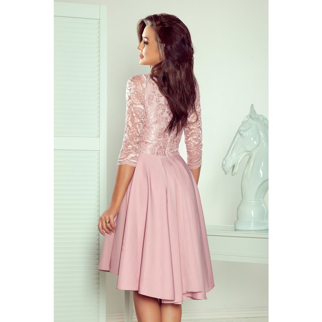 Nicolle - asymetrické exkluzívne šaty s dlhším chrbtom, 3/4 rukávy, výstrih a čipka - púdrovo ružová. Sukňa s dlhším chrbtovým volánom bude ideálna na tanec. Poľská produkcia. Numoco