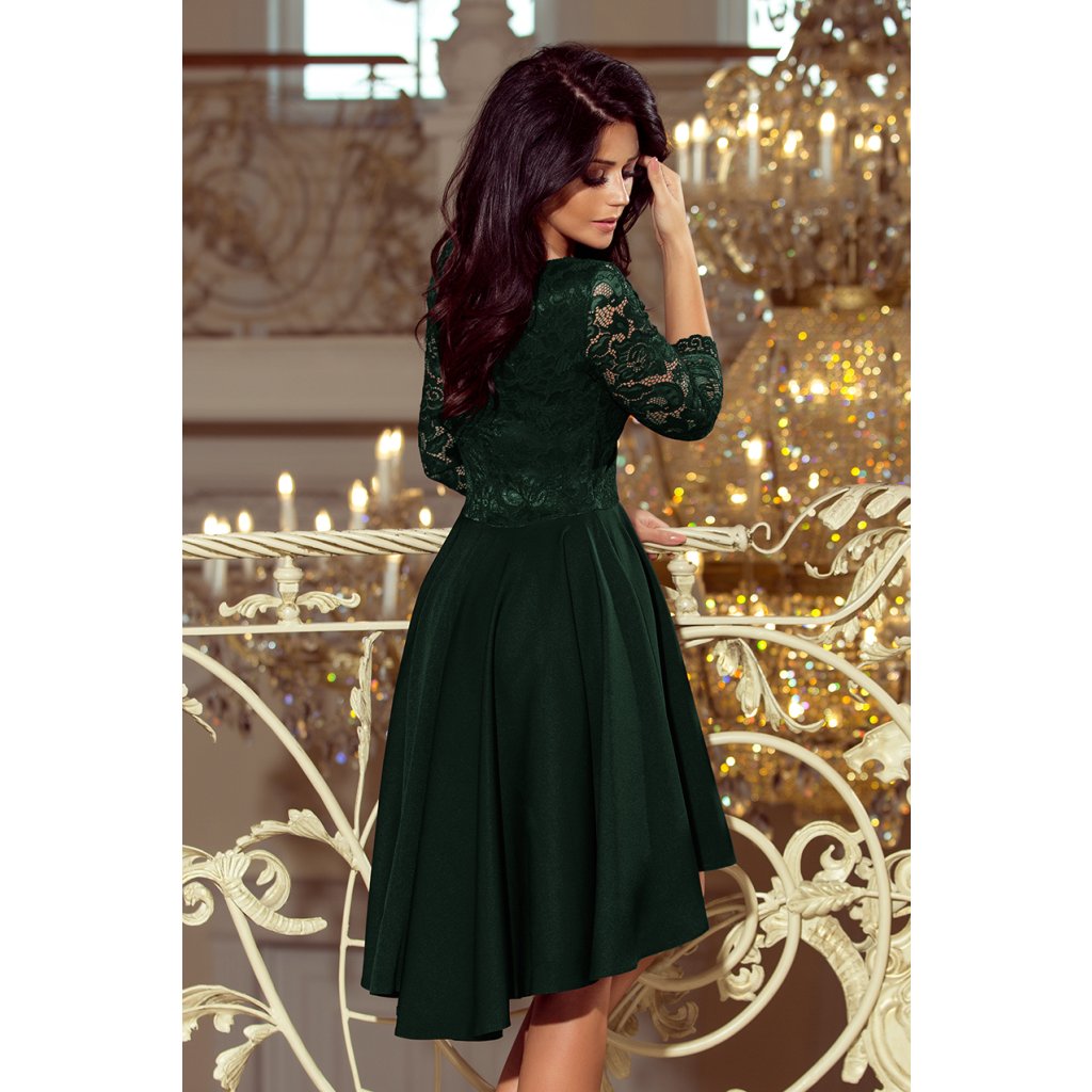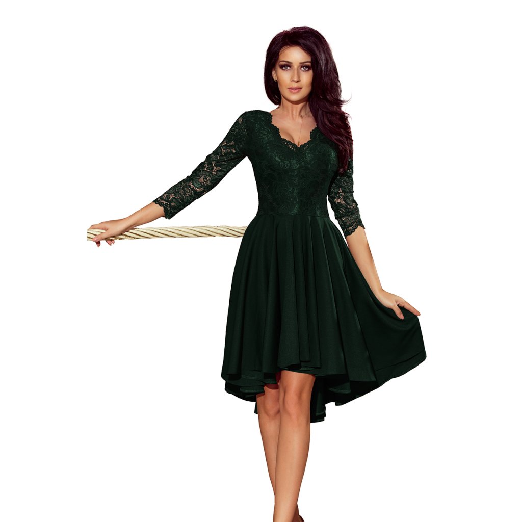 Nicolle - asymetrické exkluzívne šaty s dlhším chrbtom, 3/4 rukávy, výstrih a čipka. Tmavozelenej farby. Sukňa s dlhším chrbtovým volánom bude ideálna na tanec. Poľská produkcia. Numoco