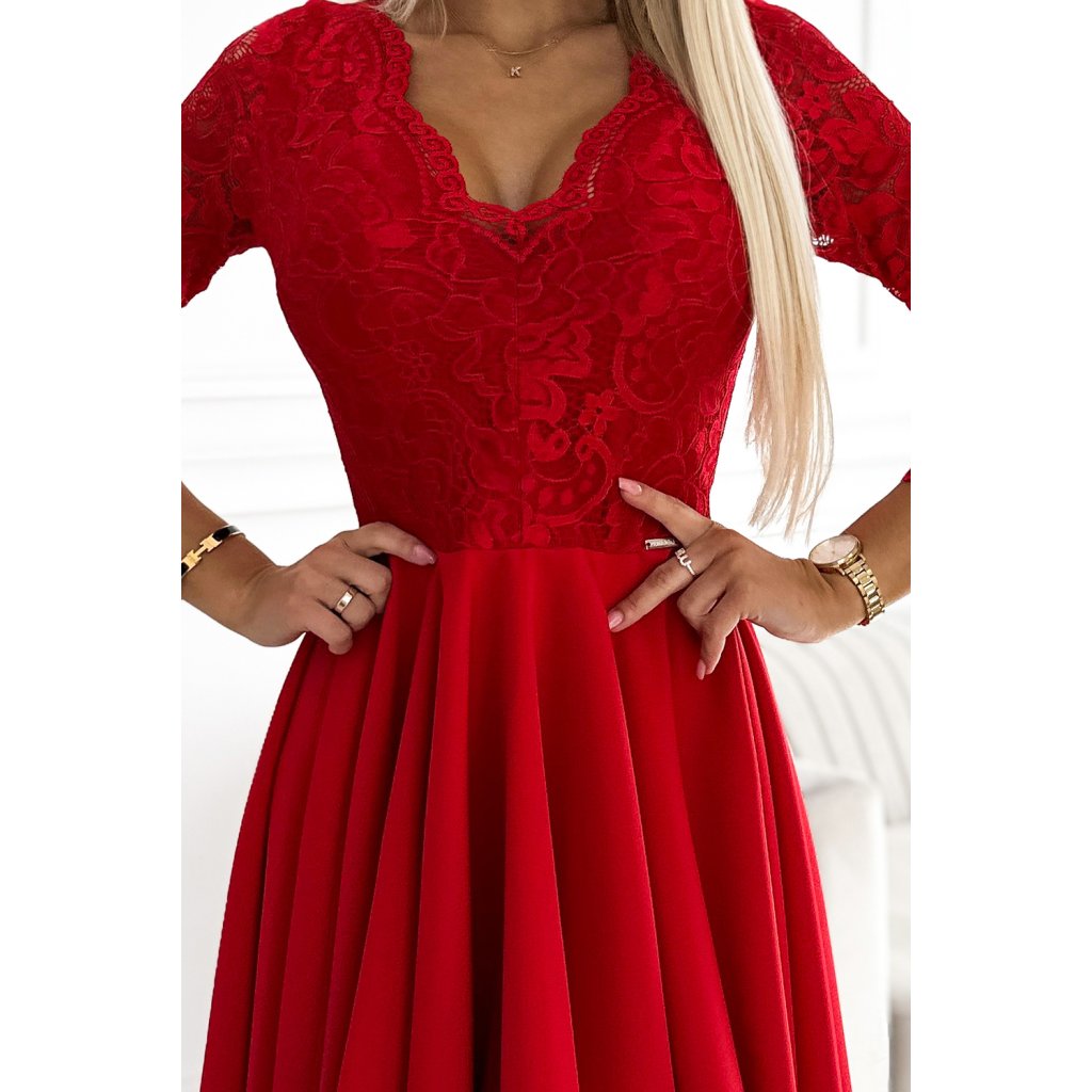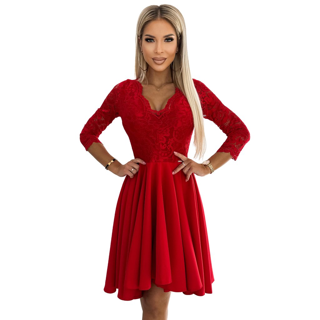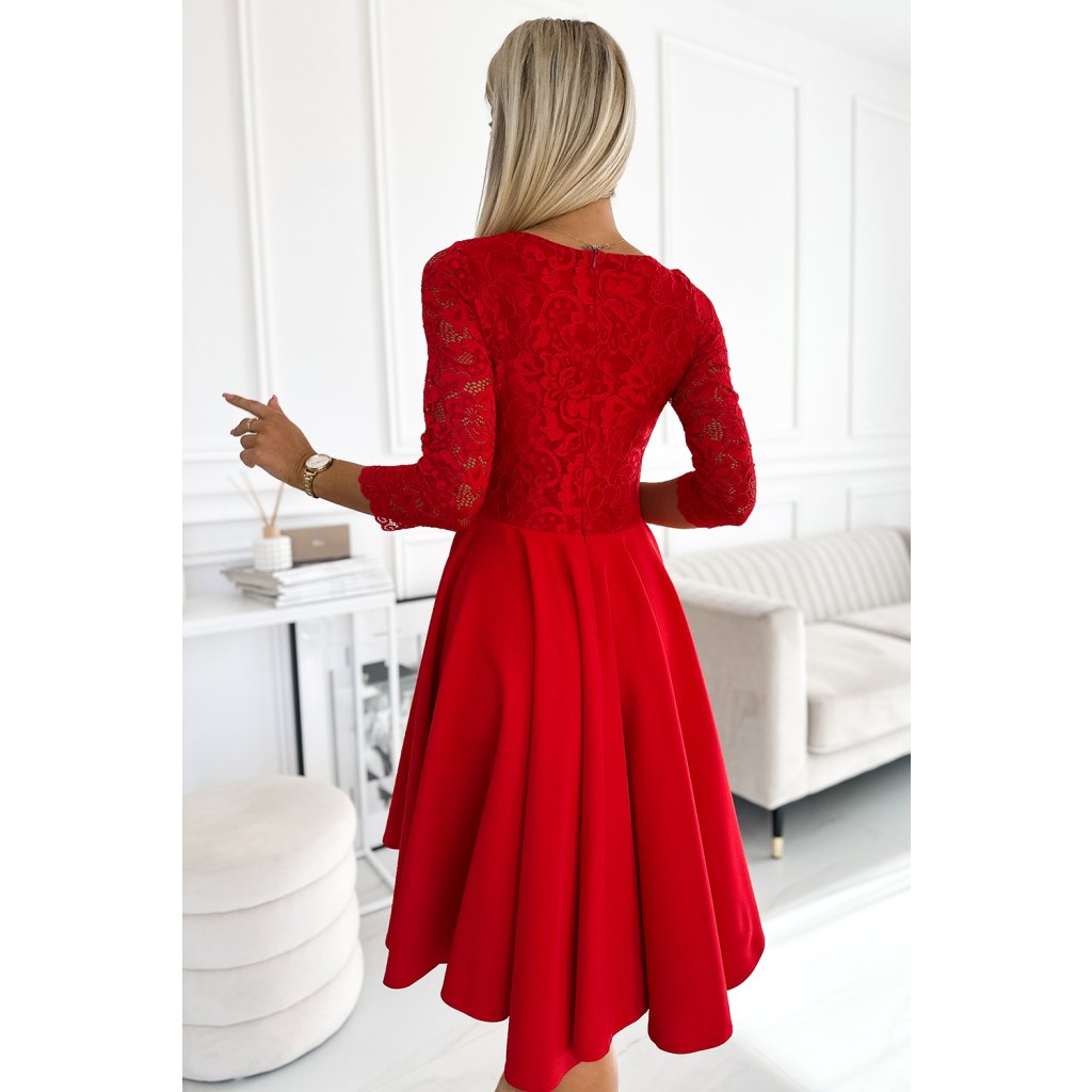 Numoco NICOLLE - šaty s čipkovaným výstrihom a dlhším zadným dielom - červené 210-16