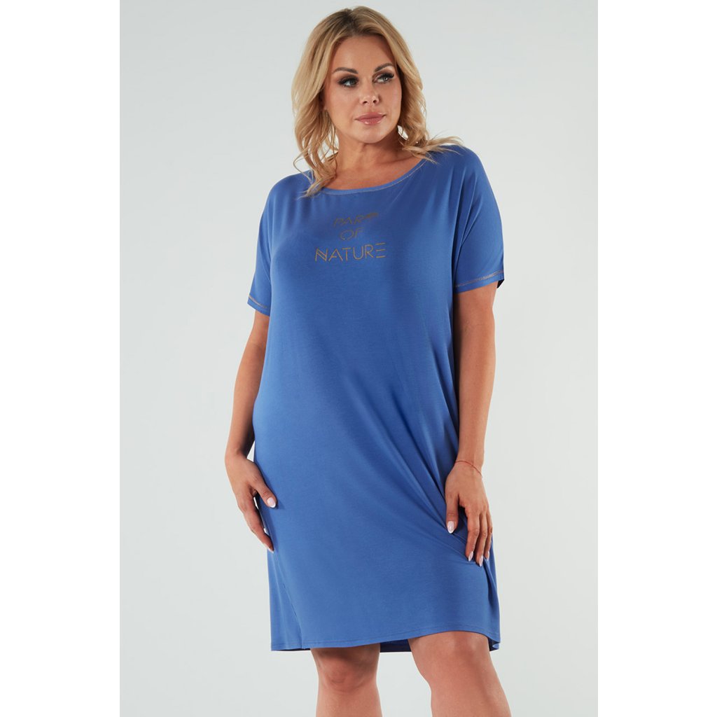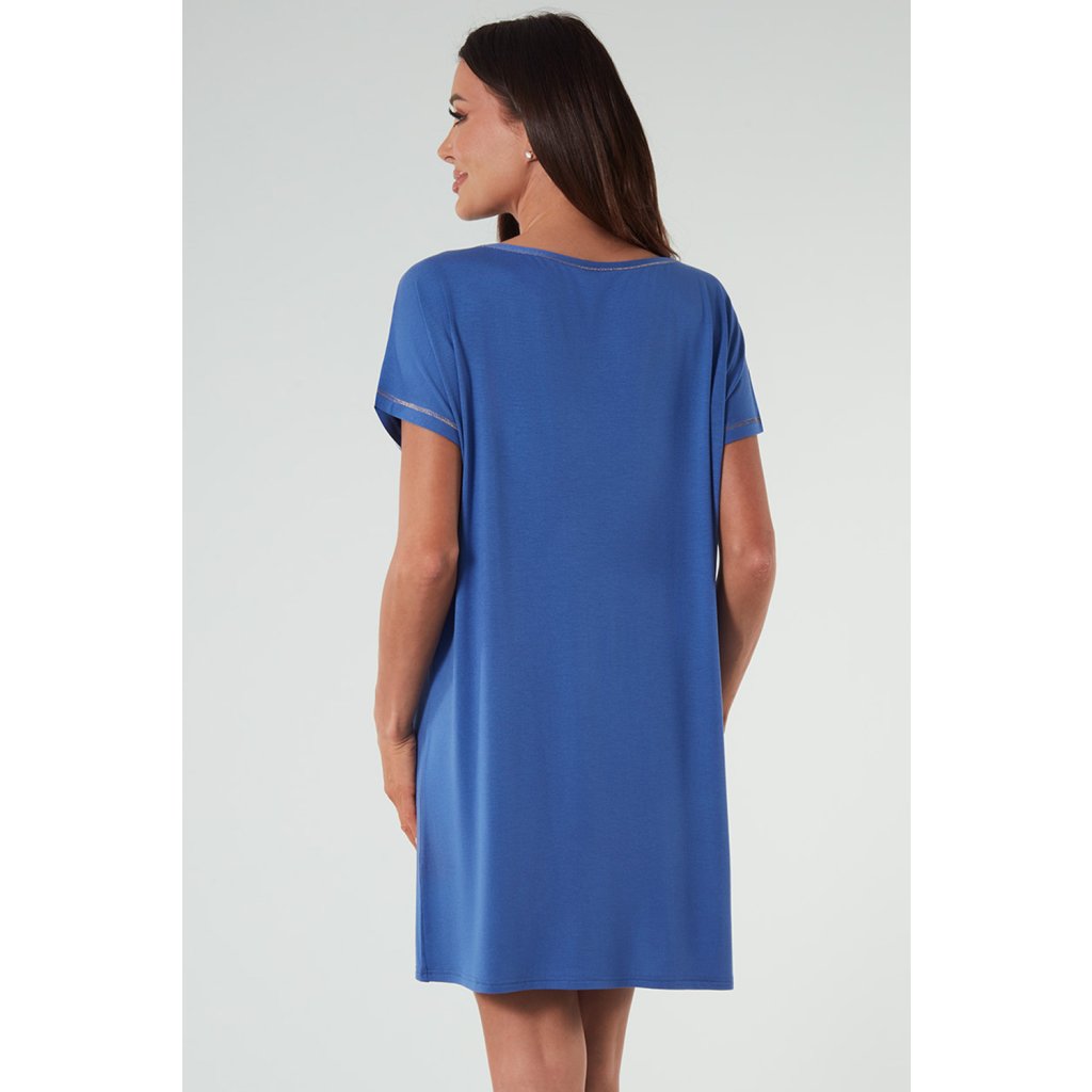 Hladká nočná košeľa z jedinečnej viskózy príjemnej na dotyk. Bude vašu pokožku rozmaznávať a vy sa budete cítiť výnimočne.Strih je výrazne voľný, splývavý. Okrúhly výstrih a krátke rukávy zdobí kontrastné prešívanie a nenápadný nápis na prednej strane. Košeľa je dlhšia, siaha po kolená.