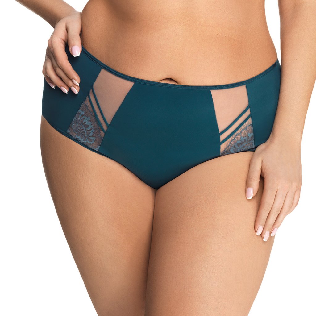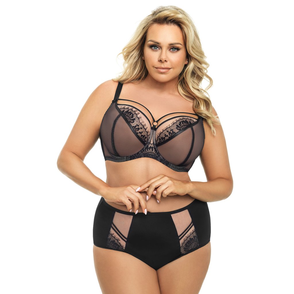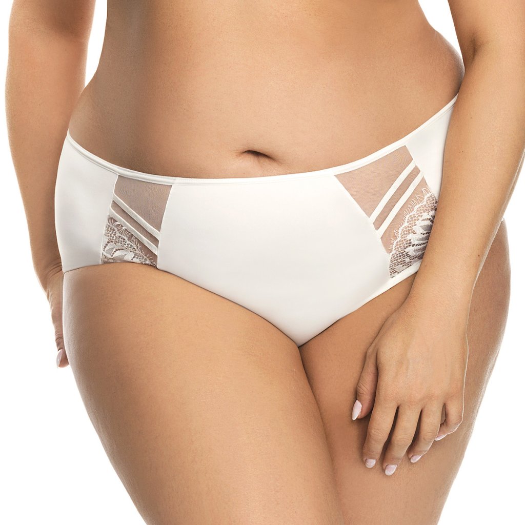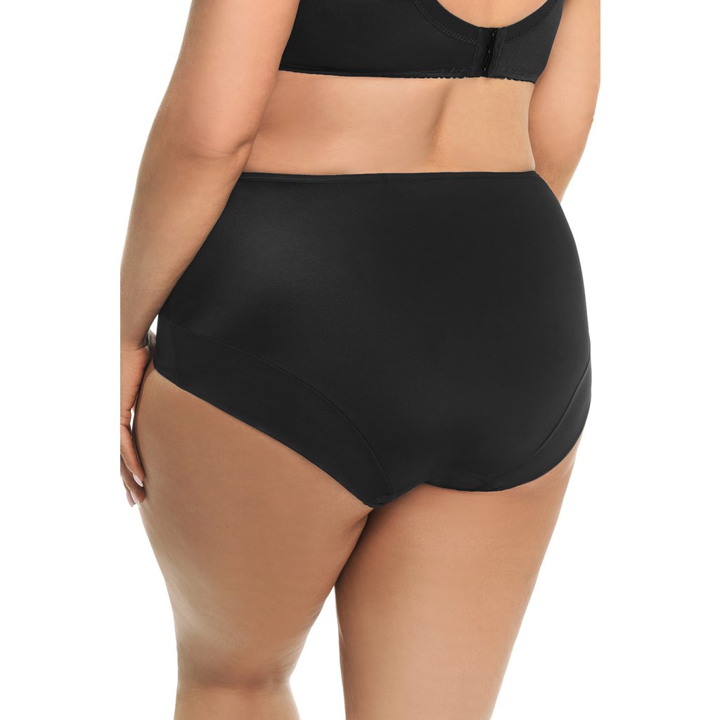 Elegantné vysoké dámske nohavičky, ktoré sú vyrobené z mäkkého mikrovlákna. Model je vpredu zdobený dvoma vložkami z béžového tylu a jemnej čiernej čipky. Zadná časť nohavičiek je hladká. Nohavičky sú vpredu olemované hladkou, tenkou gumičkou. Zadná časť nohavičiek je podšitá hladko skladaným dvojitým elastickým tylom.