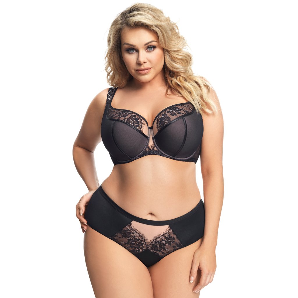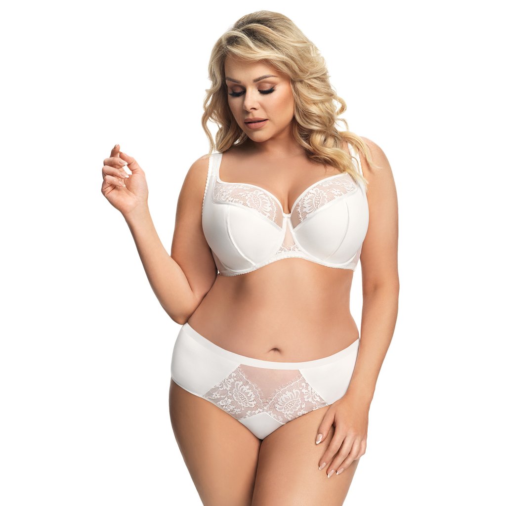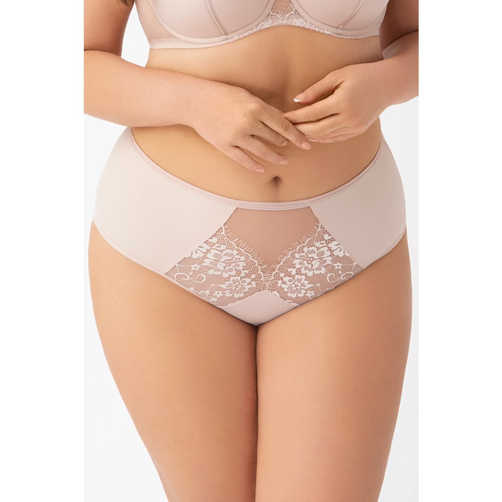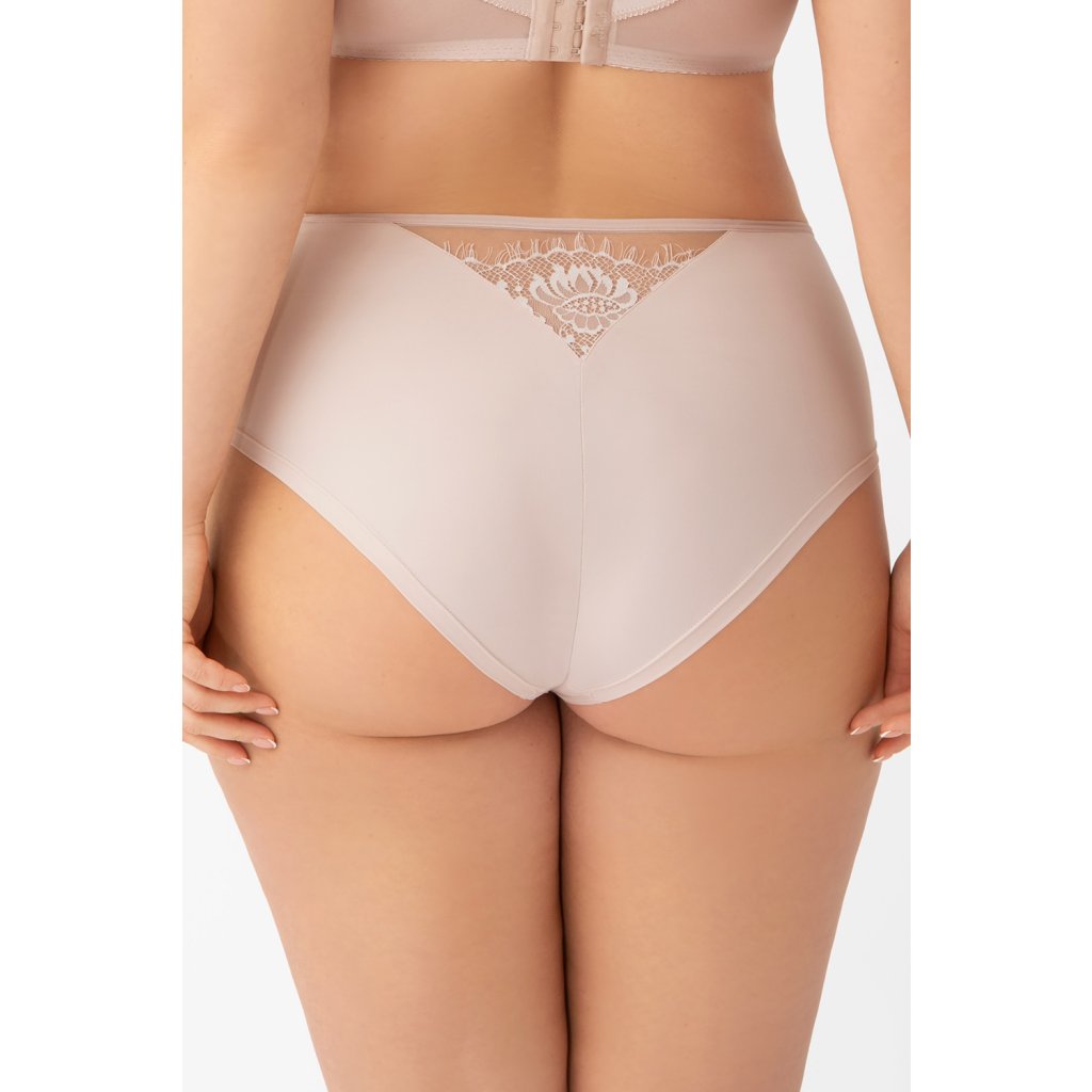 Elegantné nohavičky s vysokým pásom. Je vyrobená z mäkkého mikrovlákna zdobeného tylom a jemnými čipkovanými vložkami na prednej a zadnej strane. Späť hladko. Nožičky na prednej strane sú zakončené hladkou gumičkou. Zadné nohy sú zakončené hladkou dvakrát skladanou tylovou gumou.