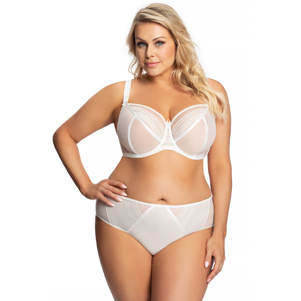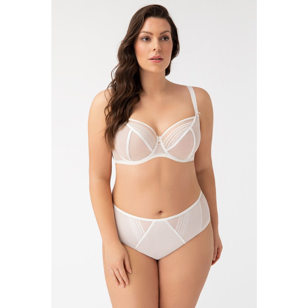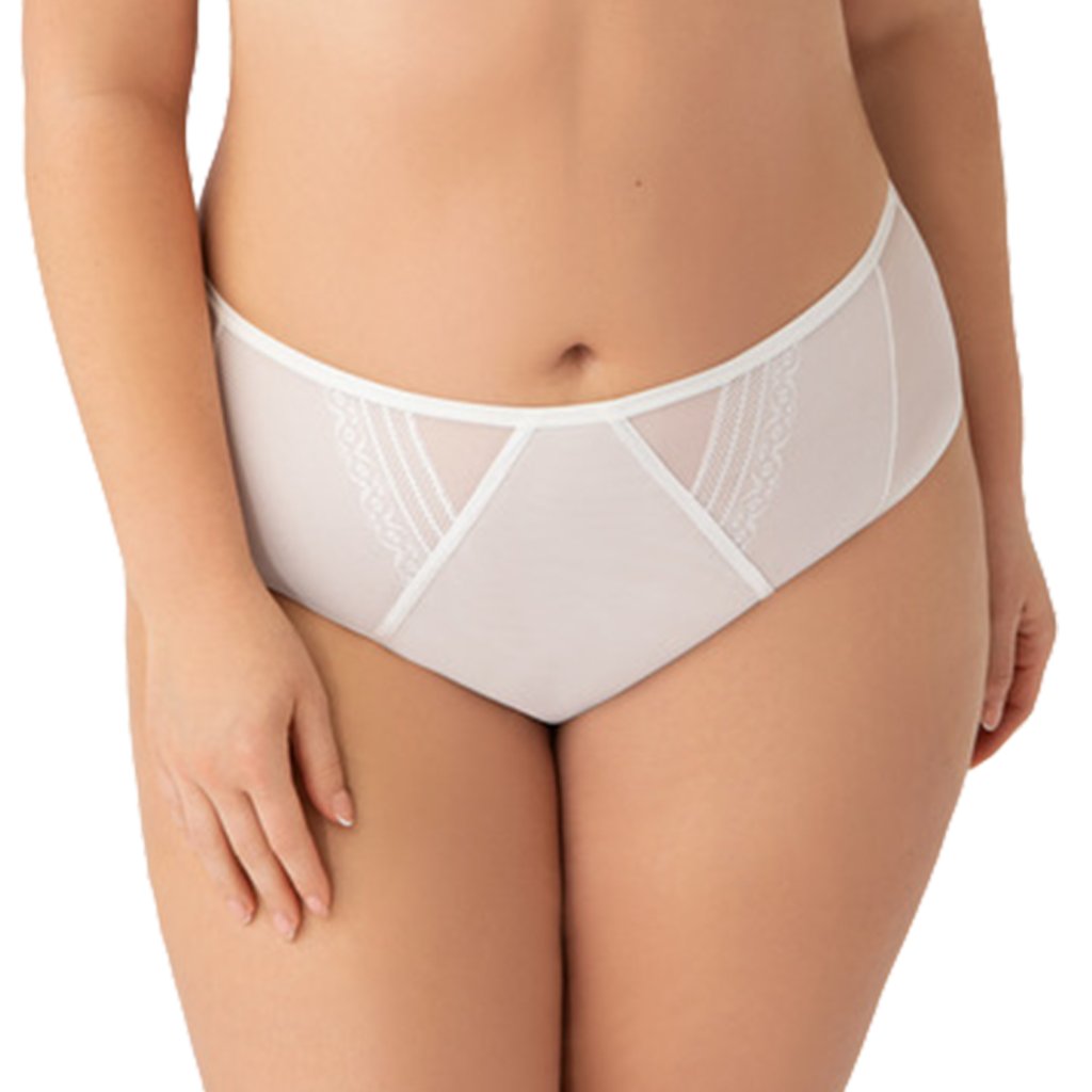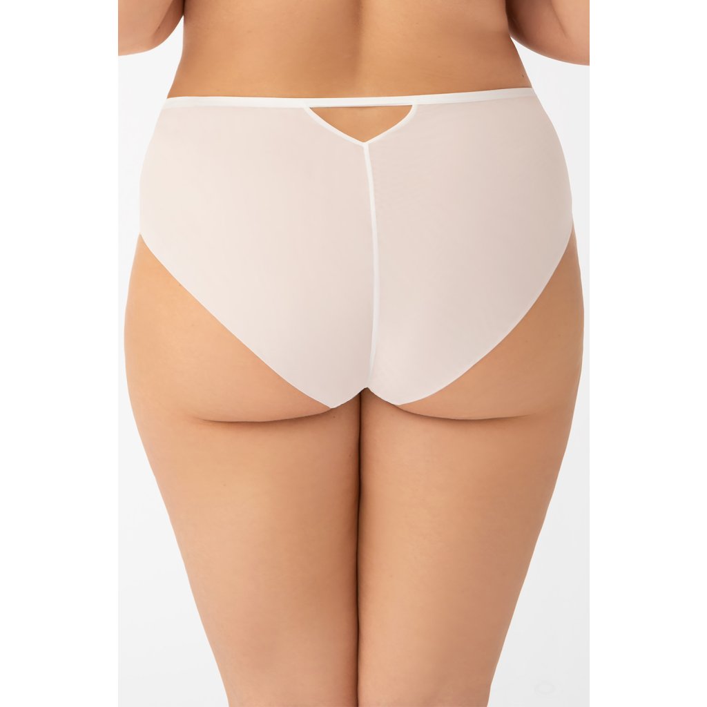 Elegantné, plné nohavičky. Vyrobené z elastického tylu, vpredu zdobené dvoma minimalistickými čipkovanými vsadkami. Švy vložiek sú tiež lemované saténovým lemom. Ozdobný trojuholníkový výrez na zadnej strane. Nohavičky sú vpredu lemované hladkou tenkou gumou a vzadu zakončené dvojitým skladaným tylom.