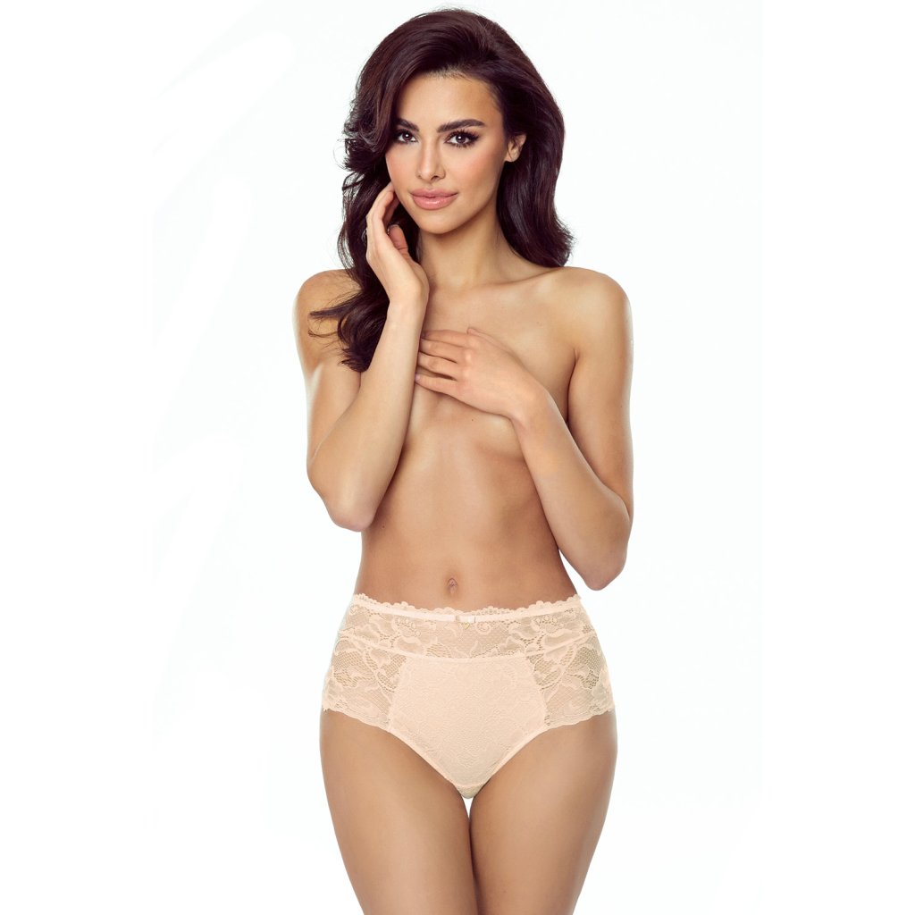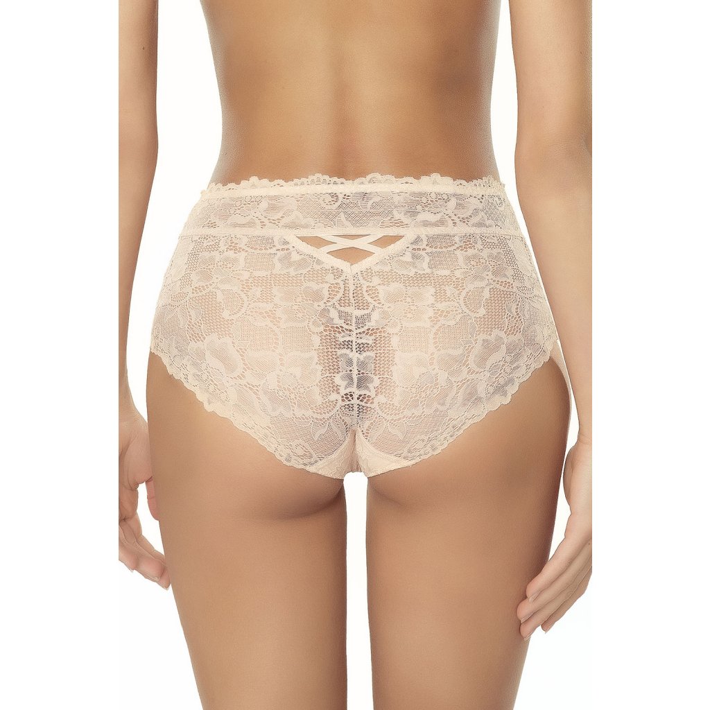 Dámske nohavičky Zula. - plný strih - vysoký pás - z jemnej čipky s kvetinovým motívom - predná časť je podšitá sieťovinou - predná časť zdobená srdiečkovou mašľou - výrez a ozdobné pruhy na zadnej strane - vycpávka v rozkroku zo 100 % bavlny Zloženie: 90 % polyamid, 10 % elastan.