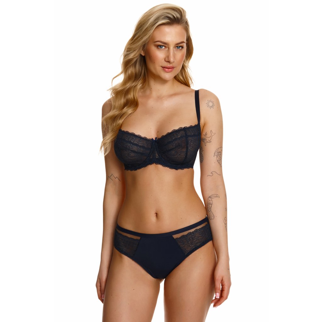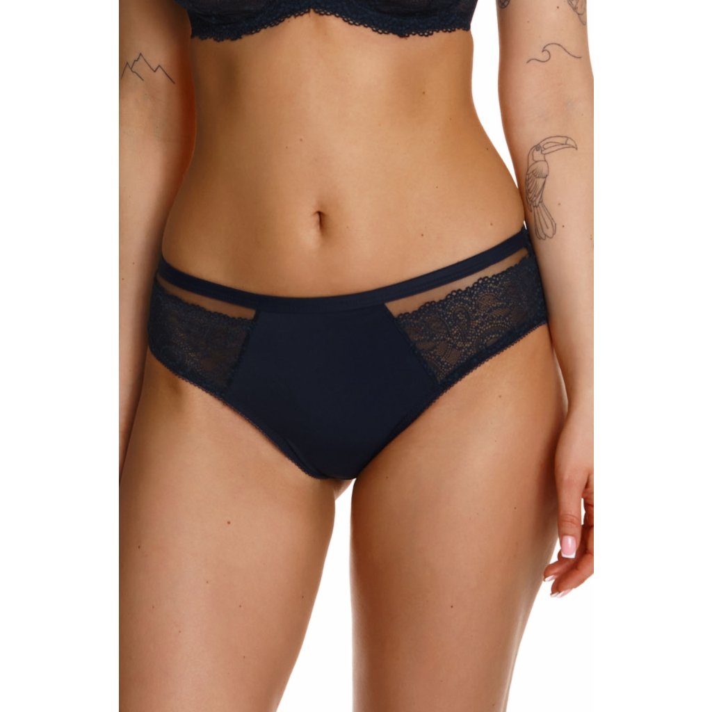 Dámske nohavičky v tmavomodrej farbe - klasický strih - vyrobené z hladkého úpletu - čipkované vsadky na prednej strane - nohavičky sú vzadu z čipky - do súpravy odporúčame podprsenku 2400 alebo 2401 Zloženie: 70% polyamid, 20% elastan, 10% bavlna.Dodatočné parametre