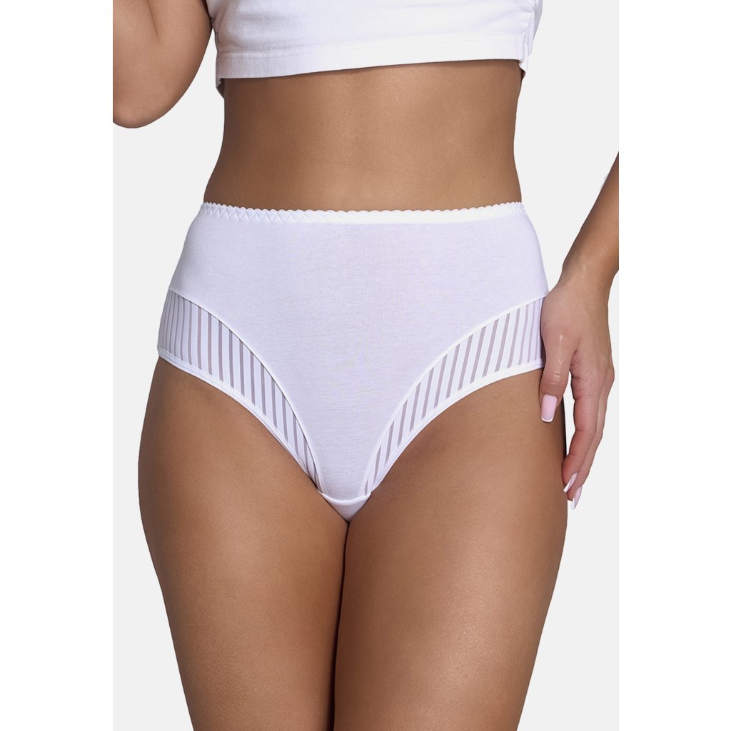 Wol-Bar Skvelé nohavičky vyššieho strihu Eco-Ql ideálne pre každú ženu, ktorá miluje eleganciu a štýl. Model vpredu z látky s reliéfnym pruhovaným vzorom. Nohavičky s vyšším pásom. Zloženie: 90% bavlna, 7% elastan, 3% polyamid.Dodatočné parametre