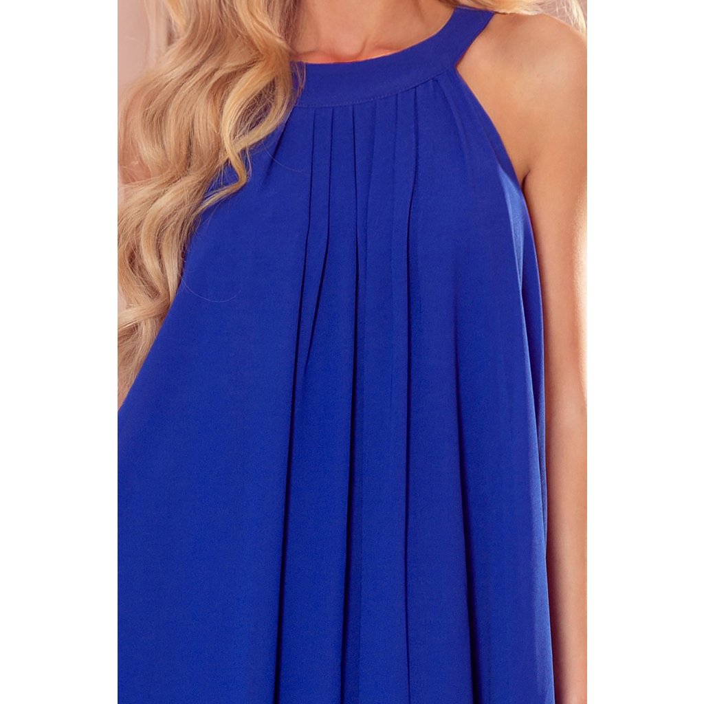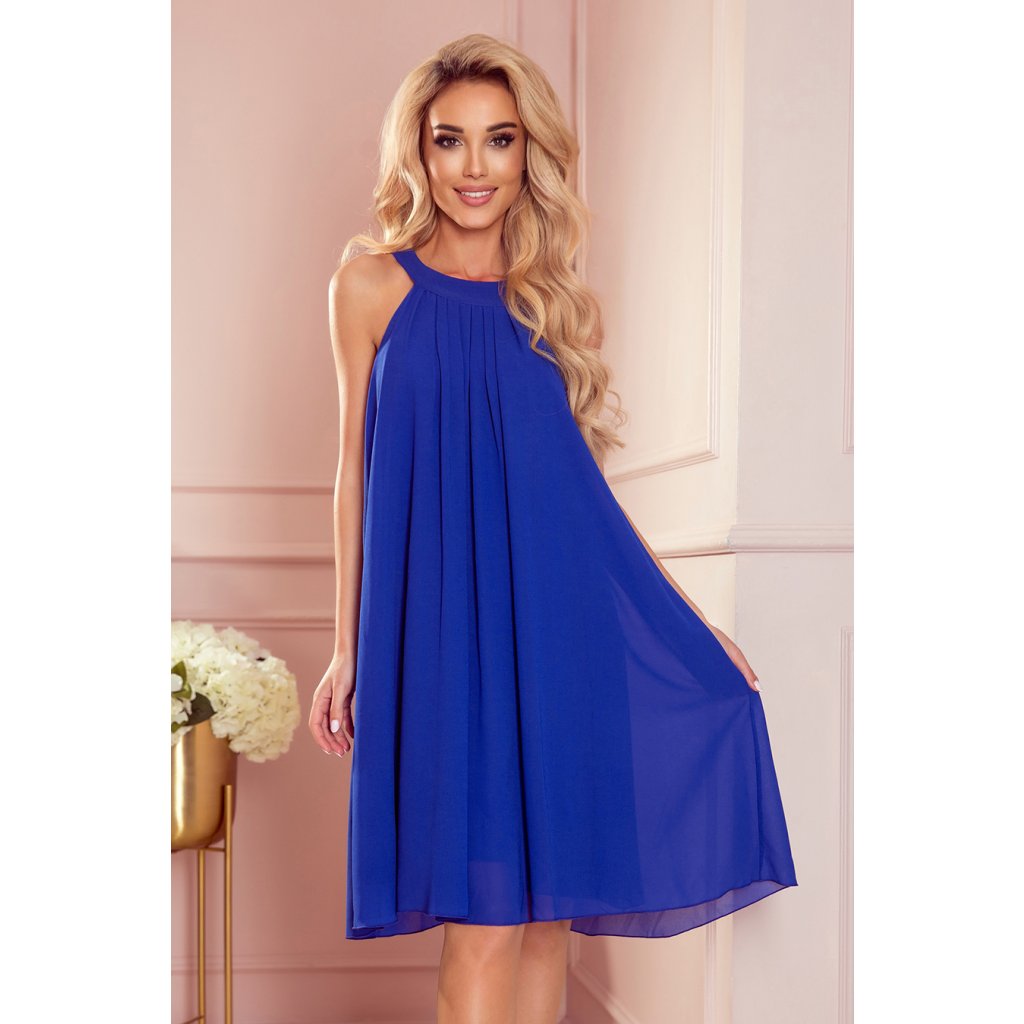 Alizee - šifónové šaty s opaskom a kravatou na chrbte. Farba: modrá. Značka Numoco. Poľská produkcia.