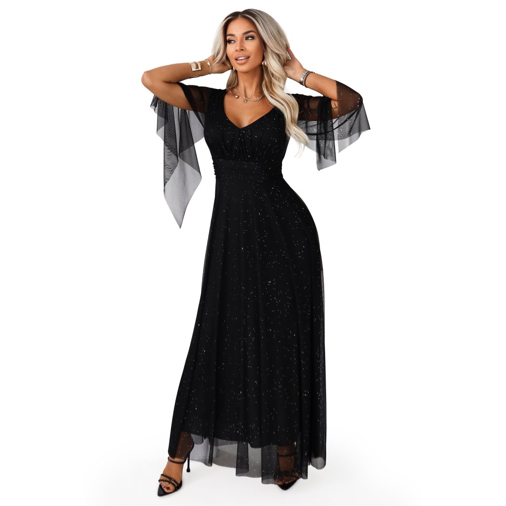 Numoco Dlhé, trblietavé šaty s výstrihom a priehľadnými rukávmi - čierne 655-1 - výpredaj