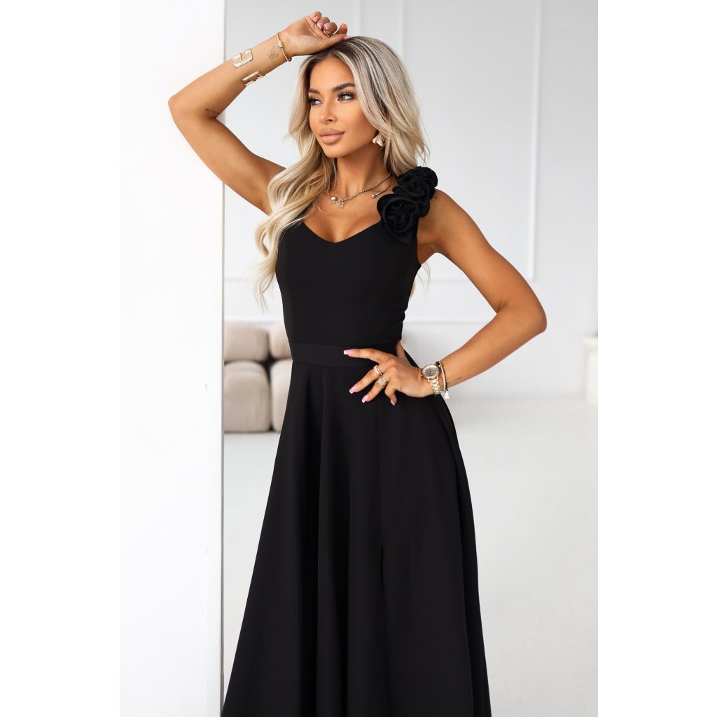 Výstrih v tvare V predlžuje líniu krku a priliehavý vrchný diel tvaruje pás, vytvárajúci efekt proporcií typu presýpacích hodín. Trojrozmerná ruža na ramene nielen pridáva charakter, ale tiež krásne zdôrazňuje líniu kľúčnych kostí a ramien. Tento model je ideálny čierne maxi šaty zoštíhľujúce siluetu, navrhnuté tak, aby každá postava vyzerala elegantne a žensky.