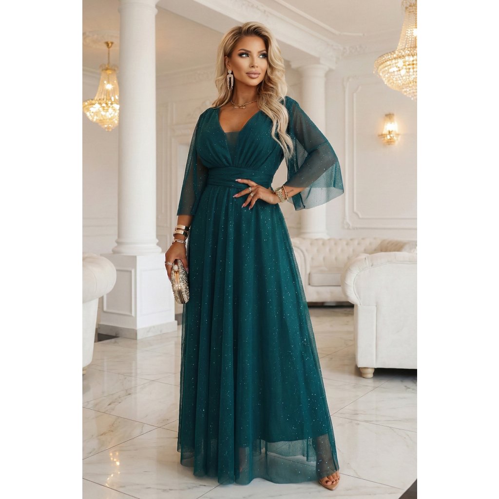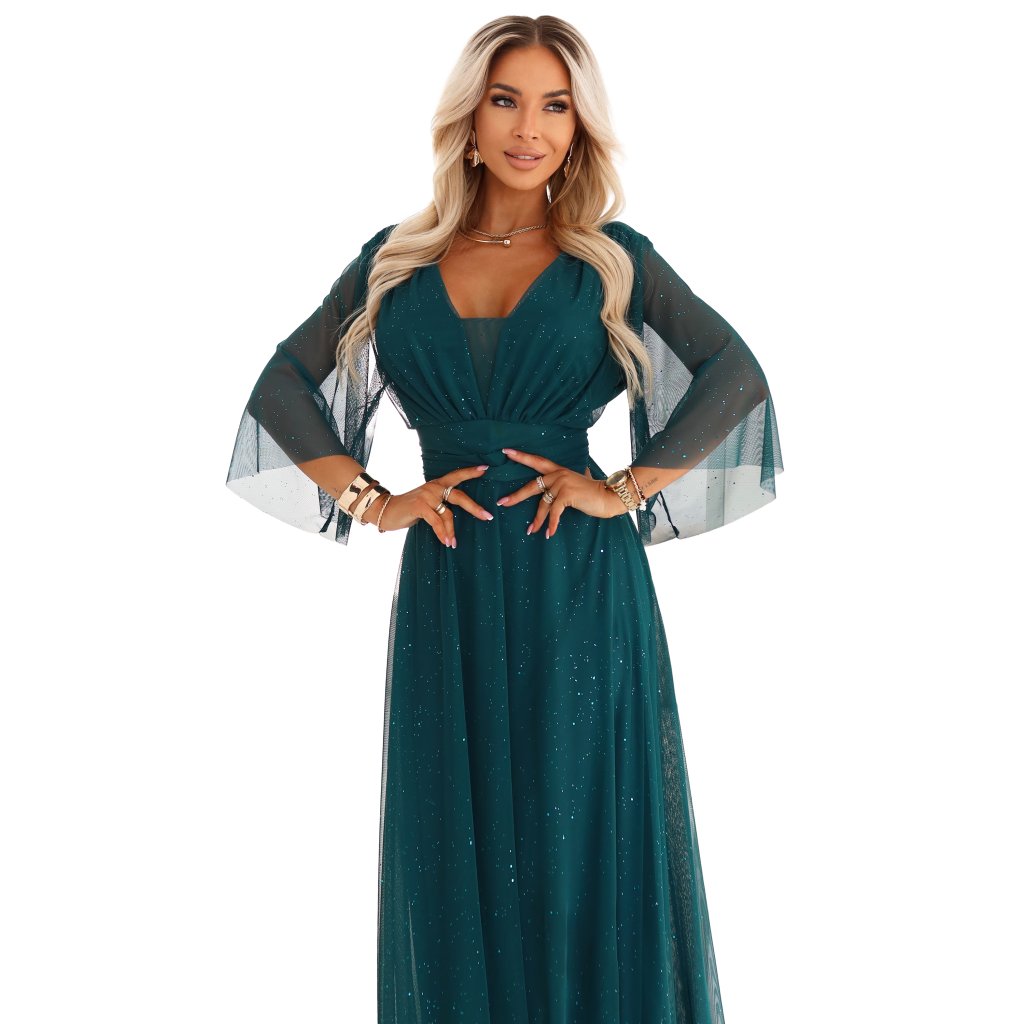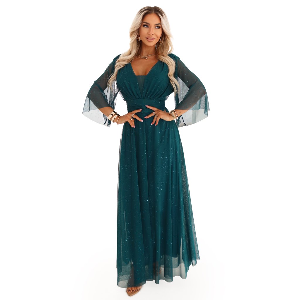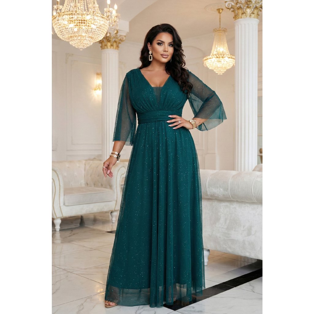 Hlboká fľaškovo zelená je farba, ktorá prirodzene dodáva triedu a opticky zoštíhľuje siluetu. Trblietavý tyl zachytáva svetlo jemným a ušľachtilým spôsobom - vďaka čomu sú šaty ideálne ako elegantné maxi šaty pre plnoštíhle na svadby, plesy, gala, rodinné oslavy alebo sviatočné večery.