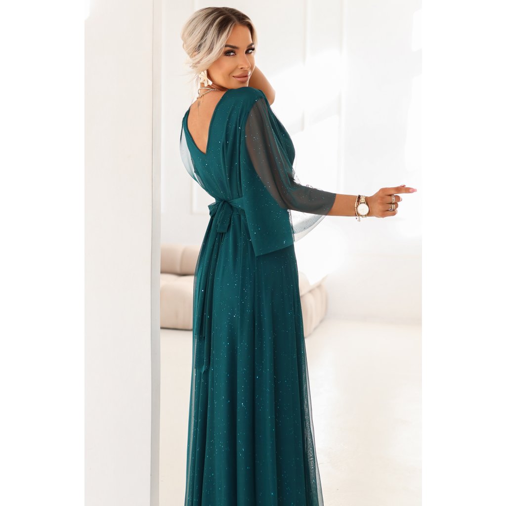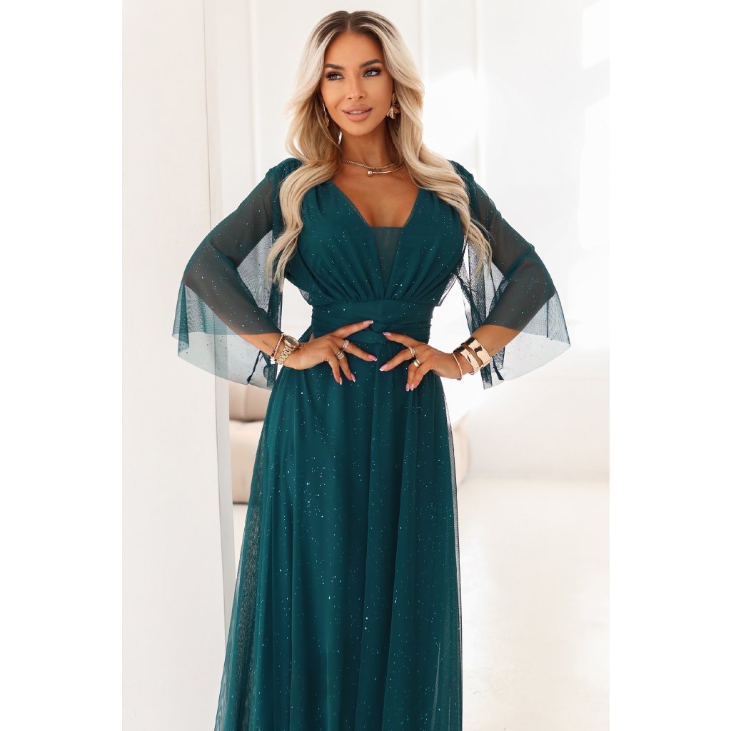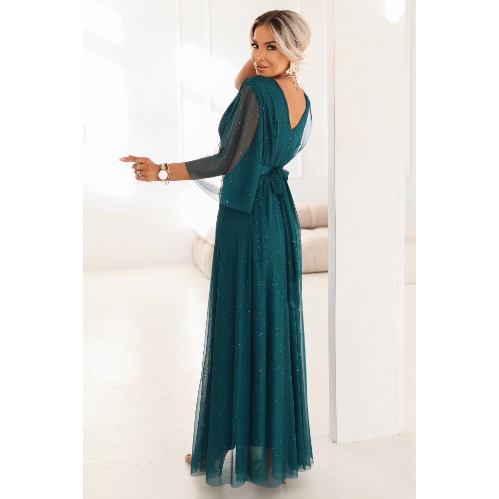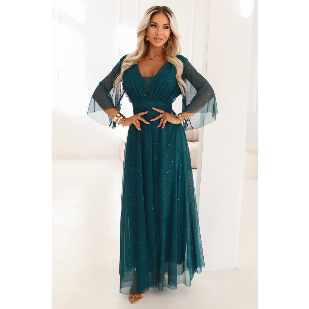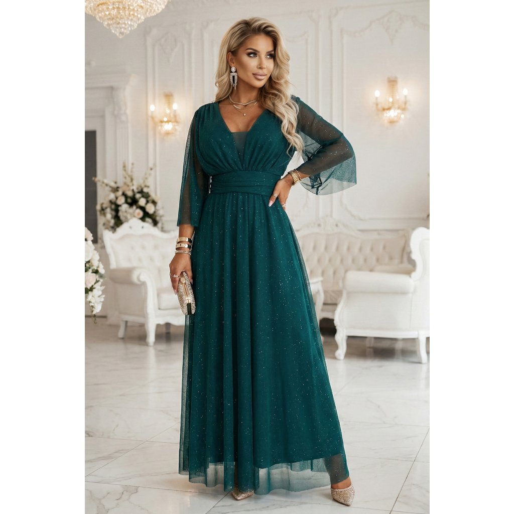 Hlboká fľaškovo zelená je farba, ktorá prirodzene dodáva triedu a opticky zoštíhľuje siluetu. Trblietavý tyl zachytáva svetlo jemným a ušľachtilým spôsobom - vďaka čomu sú šaty ideálne ako elegantné maxi šaty pre plnoštíhle na svadby, plesy, gala, rodinné oslavy alebo sviatočné večery.