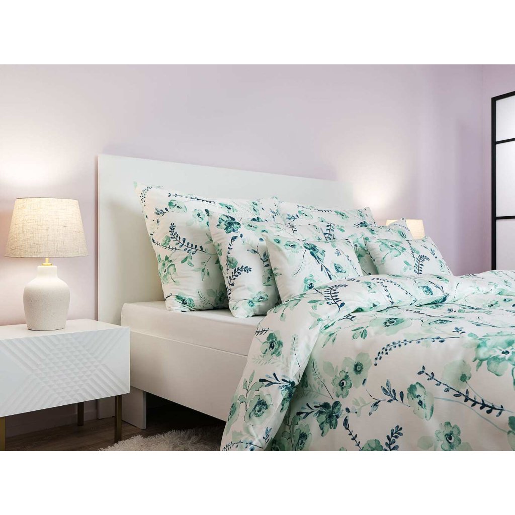 Luxusná bavlnená saténová obliečka na vankúš Kvítí mätové na bielom je vyrobená z vysoko kvalitného bavlneného saténu s modernou nežehlivou úpravou. Tento materiál si zákazníci obľúbili pre jeho hodvábnu jemnosť, vysokú savosť a výbornú priedušnosť, vďaka ktorým je spánok ešte príjemnejší.