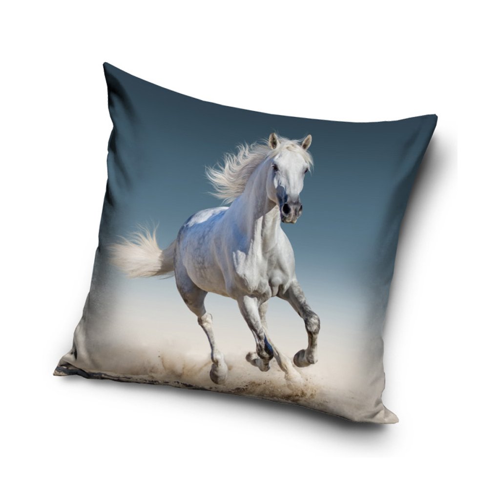 Dekoračná obliečka na vankúš Biely kôň je vyrobená zo 100 % polyesteru Obliečka na vankúš s krásnym bielym koňom poteší všetkých milovníkov týchto krásnych zvierat Obliečka na vankúš zobrazuje bieleho koňa bežiaceho v púšti,
