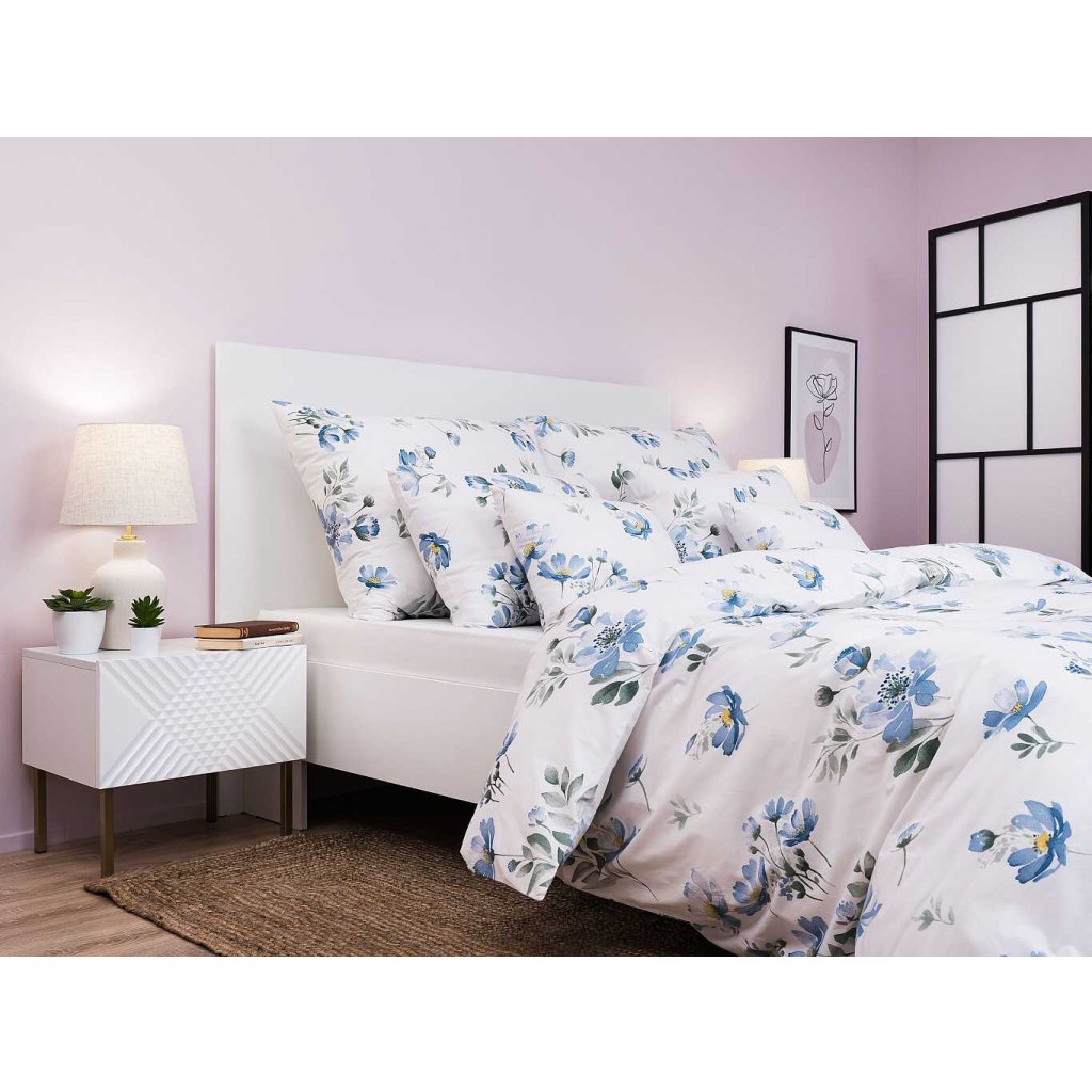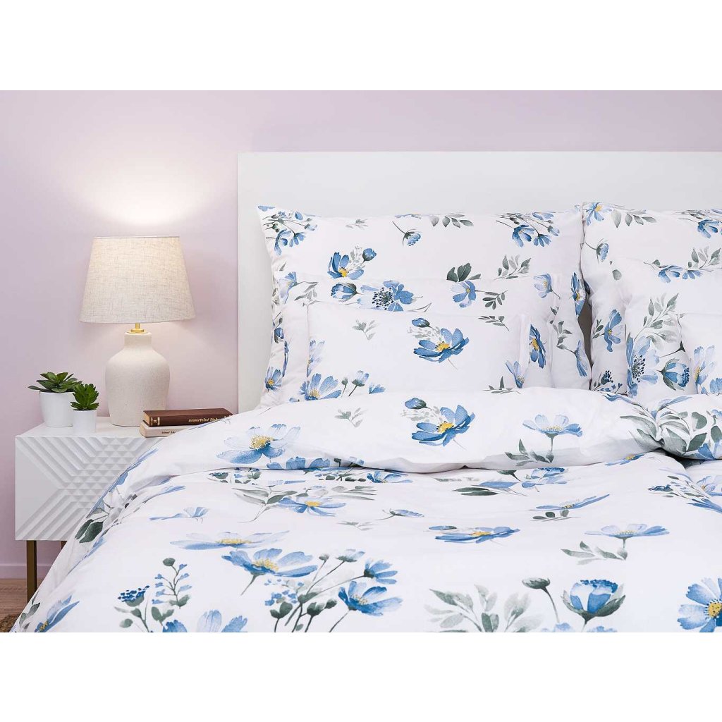 Elegantná posteľná bielizeň Sasanka modrá s jemným kvetinovým motívom v modrých tónoch na bielom podklade prináša do spálne sviežu a pokojnú atmosféru. Najlepšie vynikne v kombinácii s plachtou vo farbe svetlosivá, denim alebo biela. Vyrobené v Českej republike firmou DADKA VRACOV.