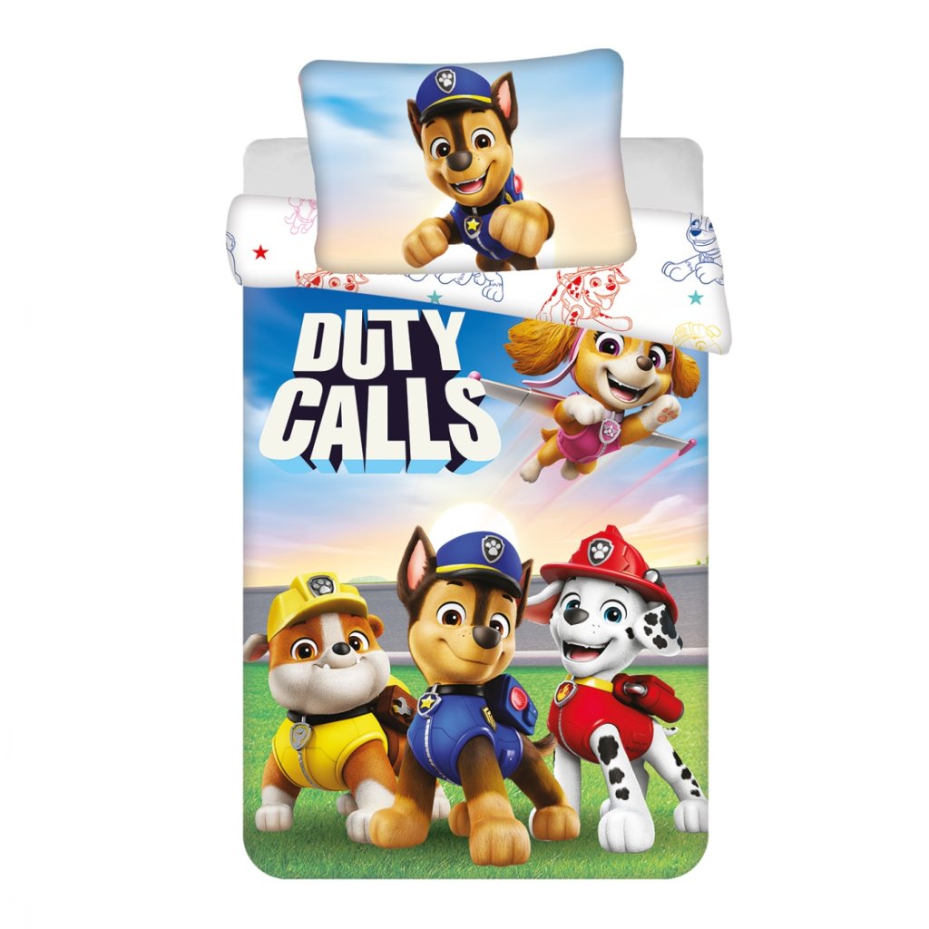 Vyrazte na záchrannú misiu s obliečkami Paw Patrol 556! Tento roztomilý dizajn prináša obľúbených hrdinov z Labkovej patroly – Chase, Rubble, Skye a Marshalla – na farebnom pozadí s nápisom „DUTY CALLS“. Ideálne pre najmenších fanúšikov!