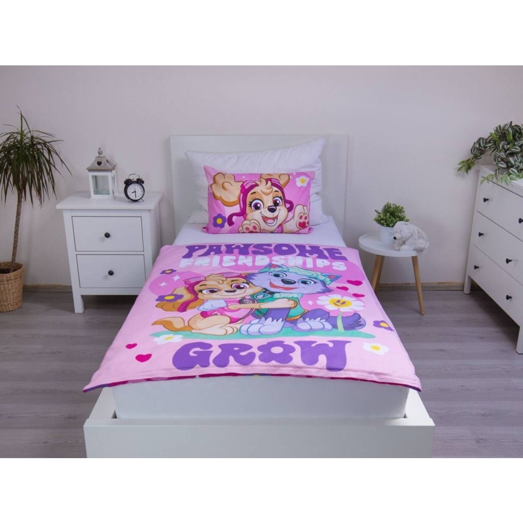 Roztomilé obliečky s motívom Skye a Everest z Tlapkovej patroly na ružovom pozadí s kvetinami potešia každú malú fanúšičku. Nápis „Pawsome Friendships Grow“ dodáva obliečkam pozitívny nádych.