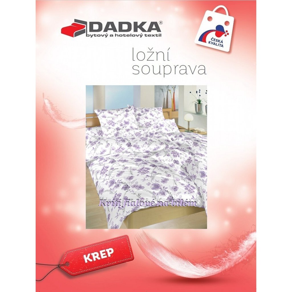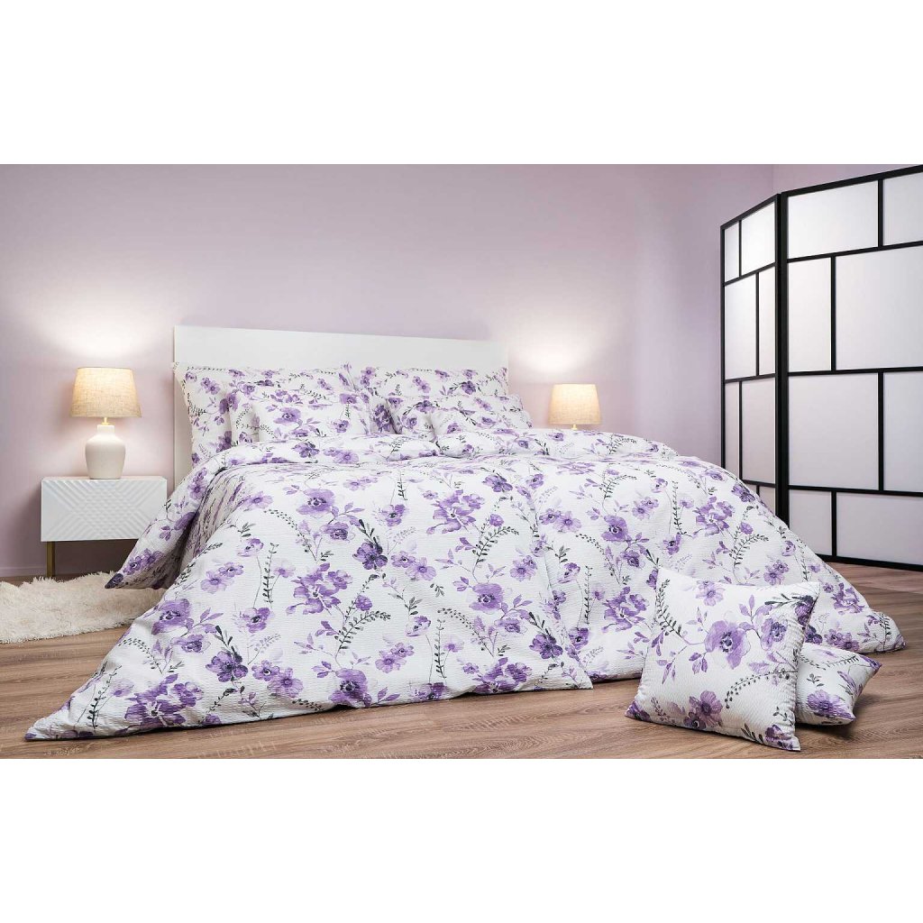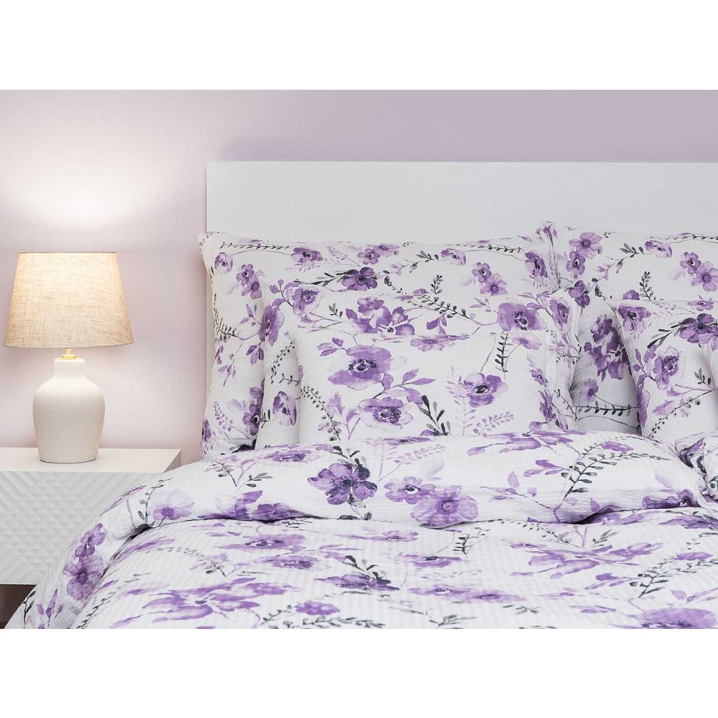 Elegantné krepové obliečky Kvety fialové na bielom s jemným kvetinovým vzorom vo fialových tónoch na bielom podklade sú ideálnou voľbou pre každého, kto ocení pohodlie bez nutnosti žehlenia. Skvele ladia s plachtou vo farbe biela, tmavo sivá, svetlo sivá alebo fialová. Vyrobené v Českej republike firmou DADKA VRACOV.