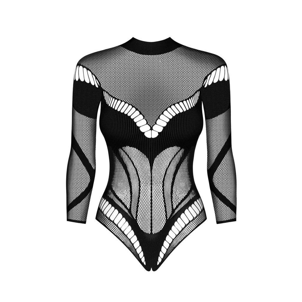 Sexi čierne body s fascinujúcimi geometrickými ozdobami. Jemná sieťovina príjemne obopína postavu a zvýrazňuje každú jej časť. Zmyselný výstrih na chrbte je zvodný a pútavý. Otvorený rozkrok je výrazným prvkom, ktorý umožňuje väčšie potešenie.Geometrické zdobenie - dokonale zvýrazňuje postavu