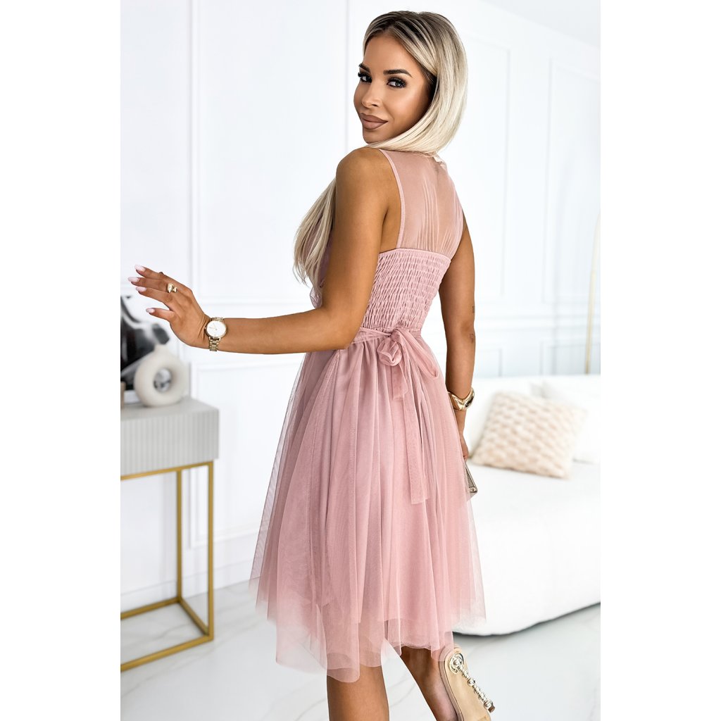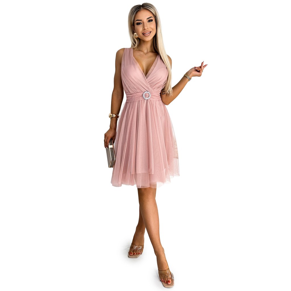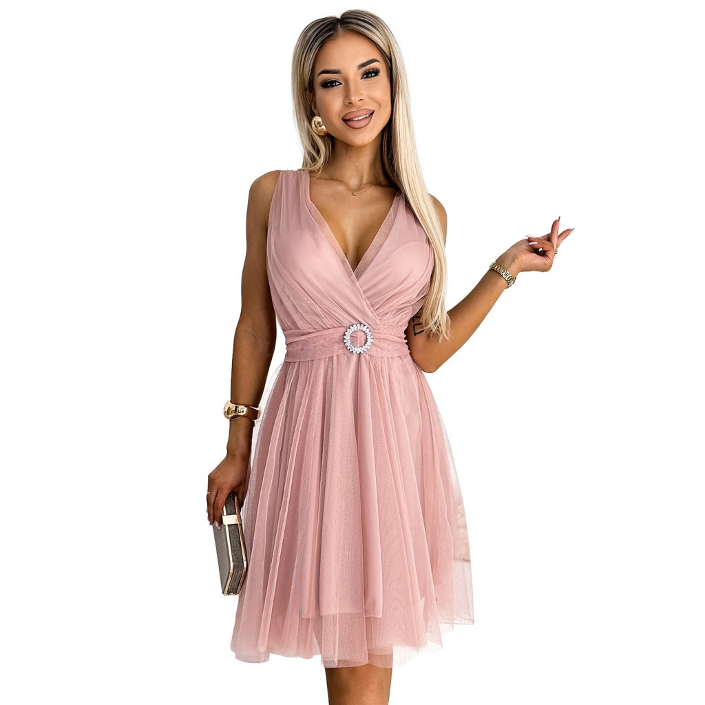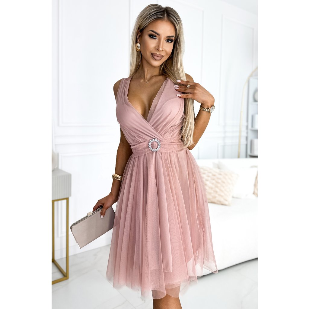OLGA tylové šaty s výstrihom a ozdobnou sponou - špinavo ružové 525-2