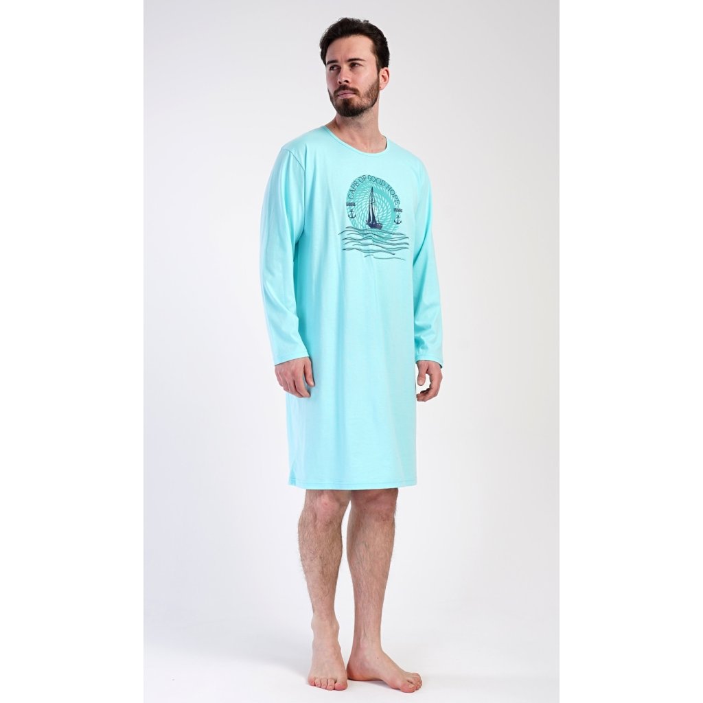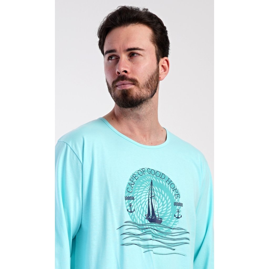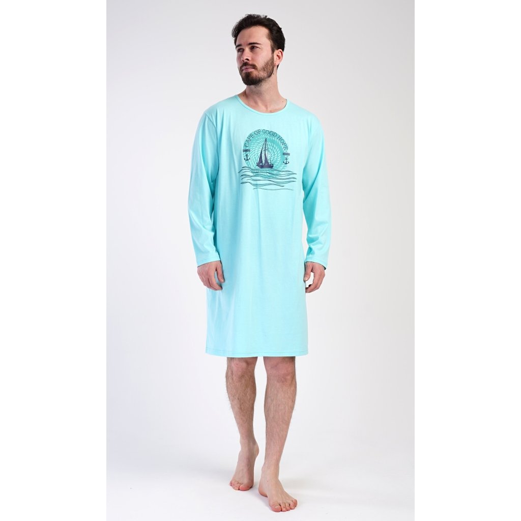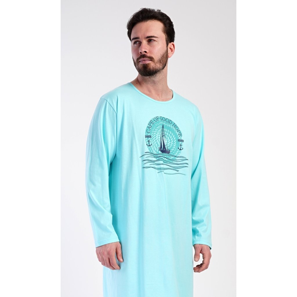 Pánska bavlnená nočná košeľa s dlhým rukávom Jachting. Táto jednofarebná pánska nočná košeľa s okrúhlym výstrihom a dĺžkou po kolená má na hrudi obrázok plachetnice a nápis "Cape of good hope". Nočná košeľa je vhodným darčekom pre všetkých milovníkov mora a diaľok. Materiál zo 100 % bavlny je príjemný a hebký na dotyk.