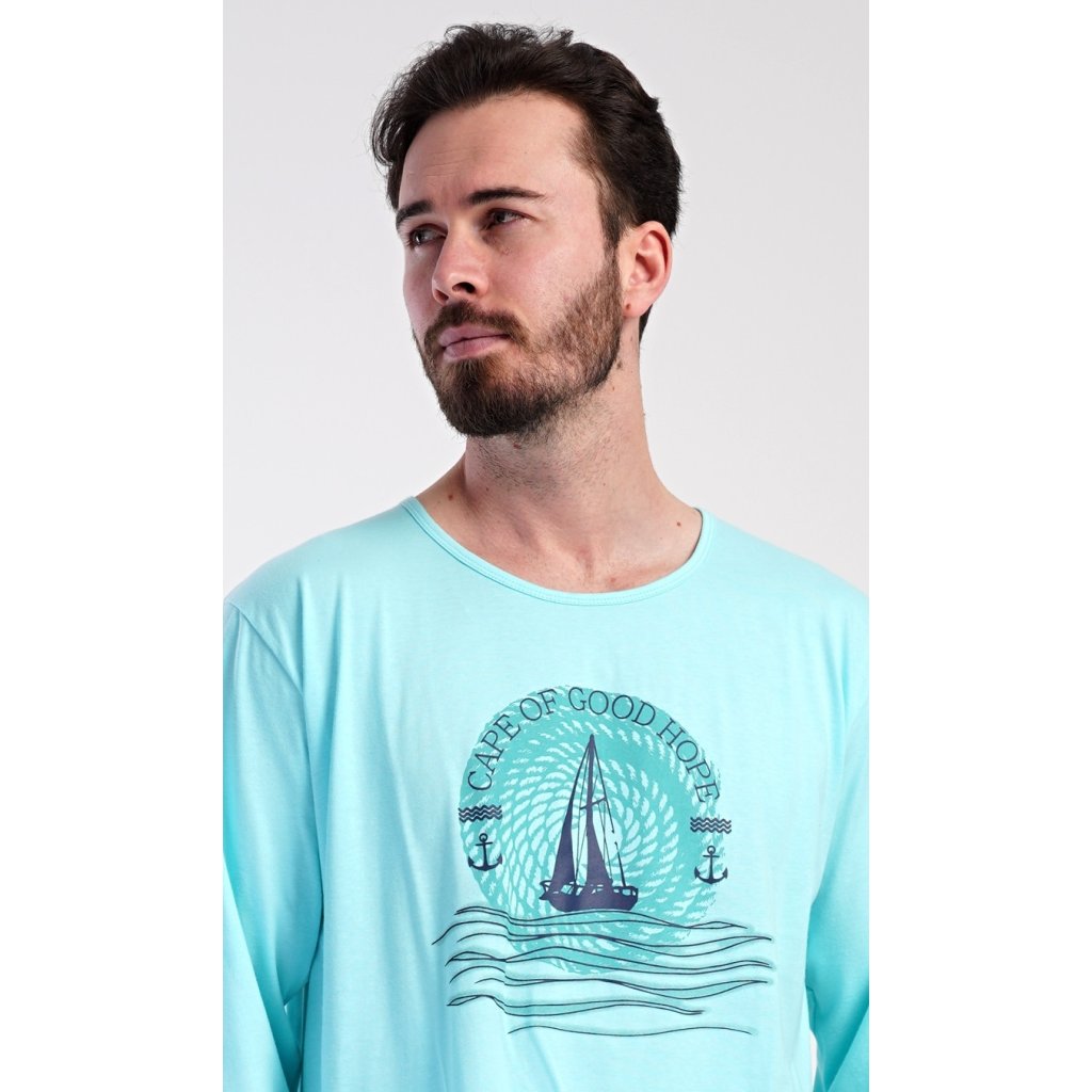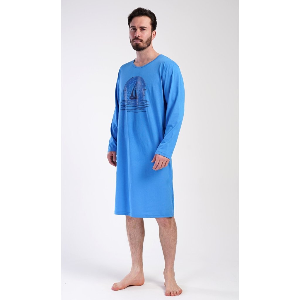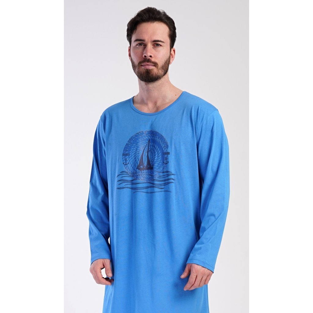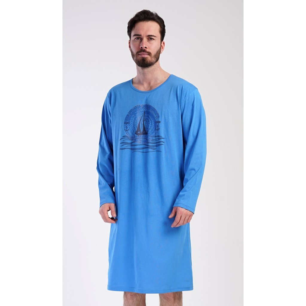 Pánska bavlnená nočná košeľa s dlhým rukávom Jachting. Táto jednofarebná pánska nočná košeľa s okrúhlym výstrihom a dĺžkou po kolená má na hrudi obrázok plachetnice a nápis "Cape of good hope". Nočná košeľa je vhodným darčekom pre všetkých milovníkov mora a diaľok. Materiál zo 100 % bavlny je príjemný a hebký na dotyk.