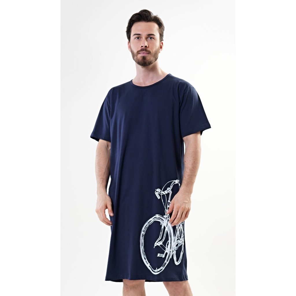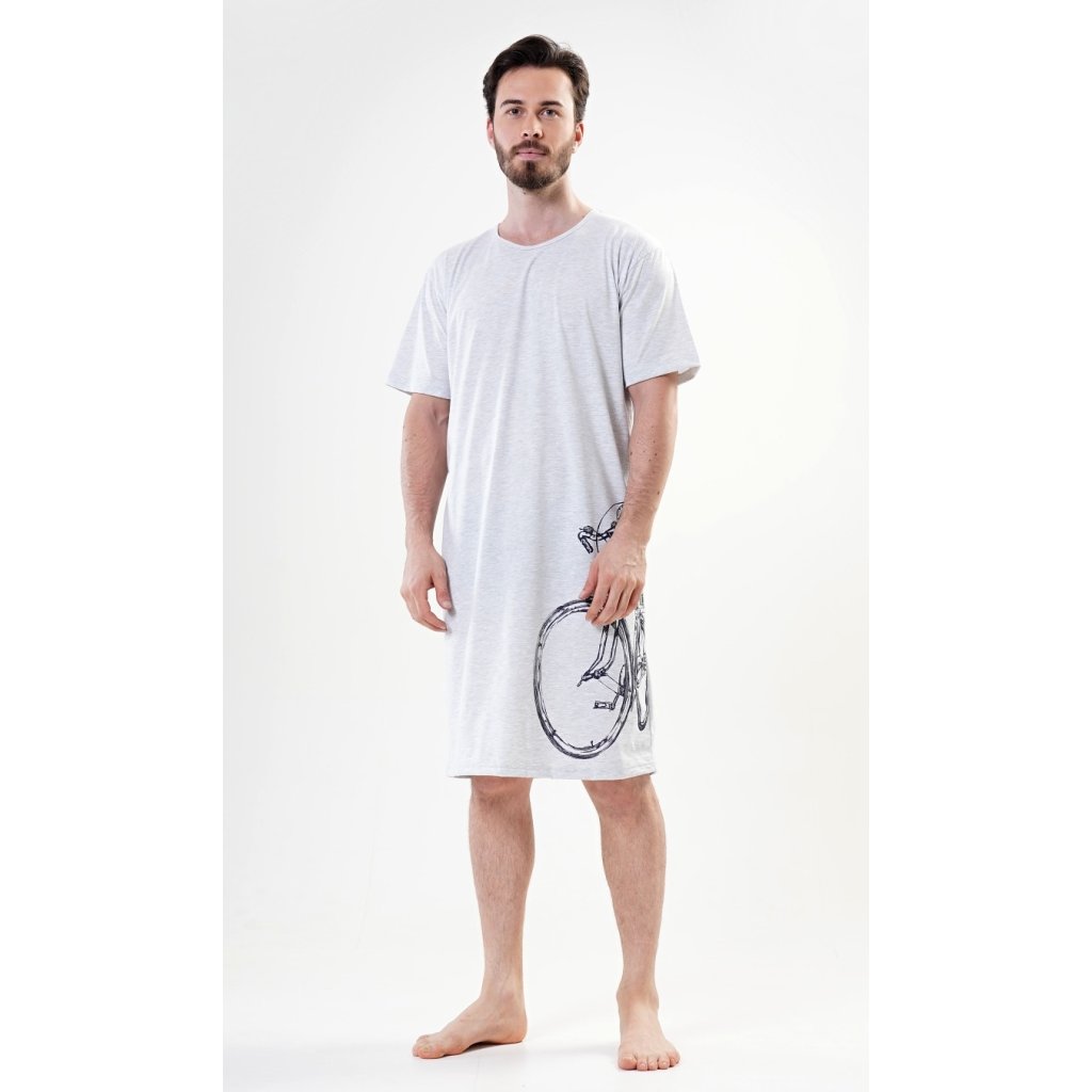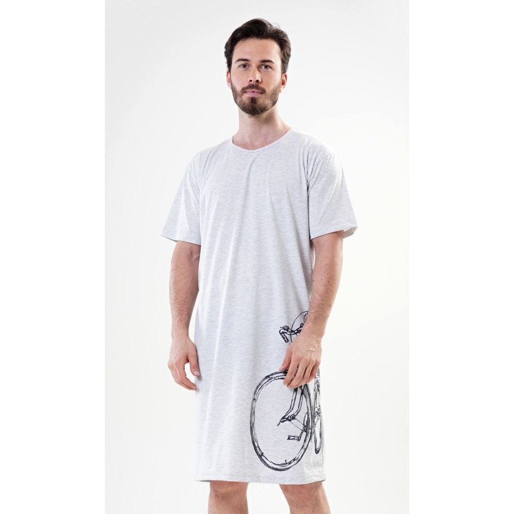 Pánska bavlnená nočná košeľa s krátkym rukávom a veľkým kolesom. Pánska nočná košeľa pre všetkých milovníkov pohodlia s obrázkom veľkého kolesa na leme. Použitý bavlnený materiál je príjemný a pružný na dotyk. Obsah bavlny je 100 %, len svetlosivá farba je 70 %.