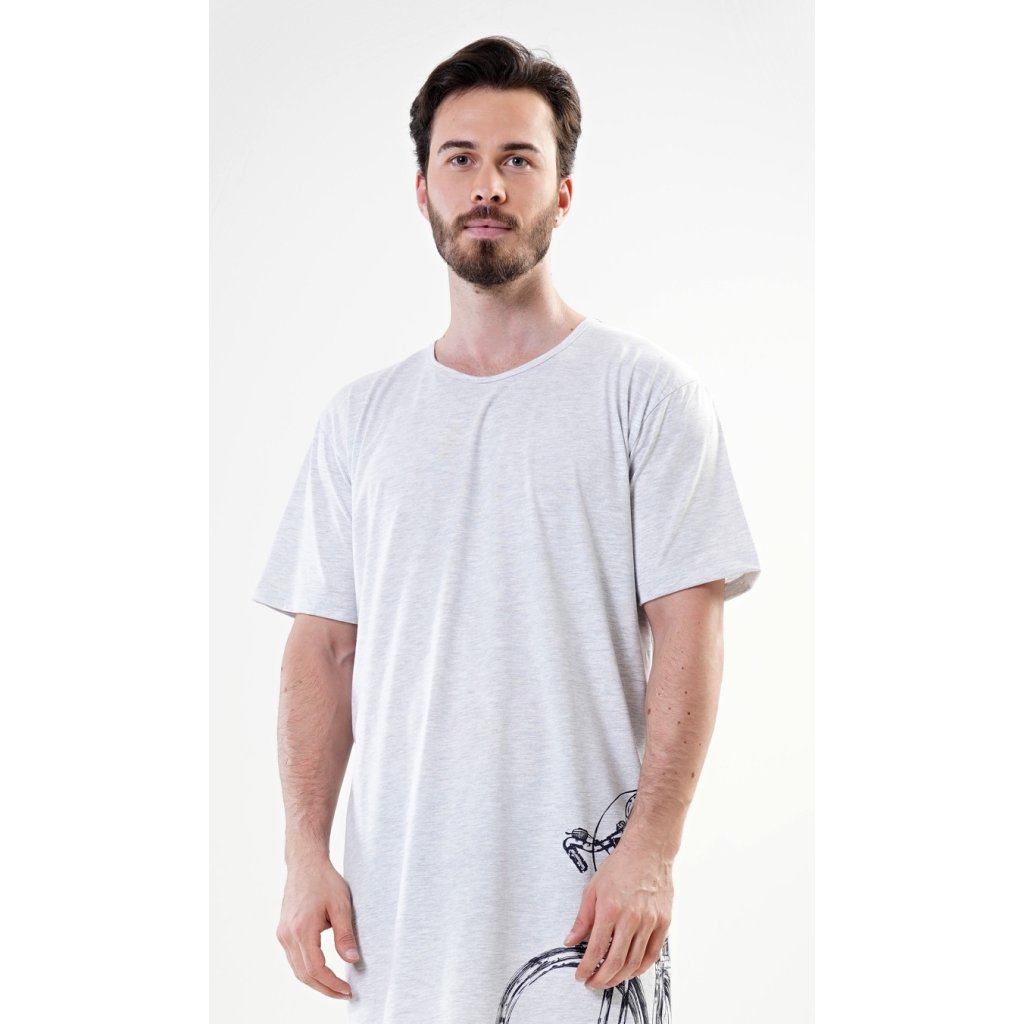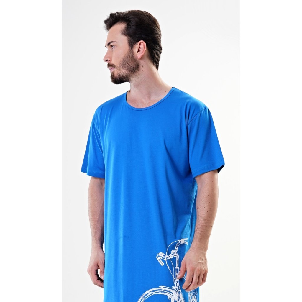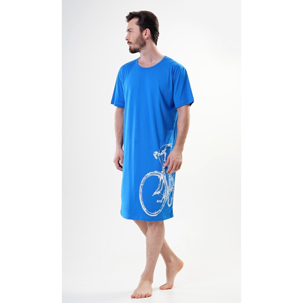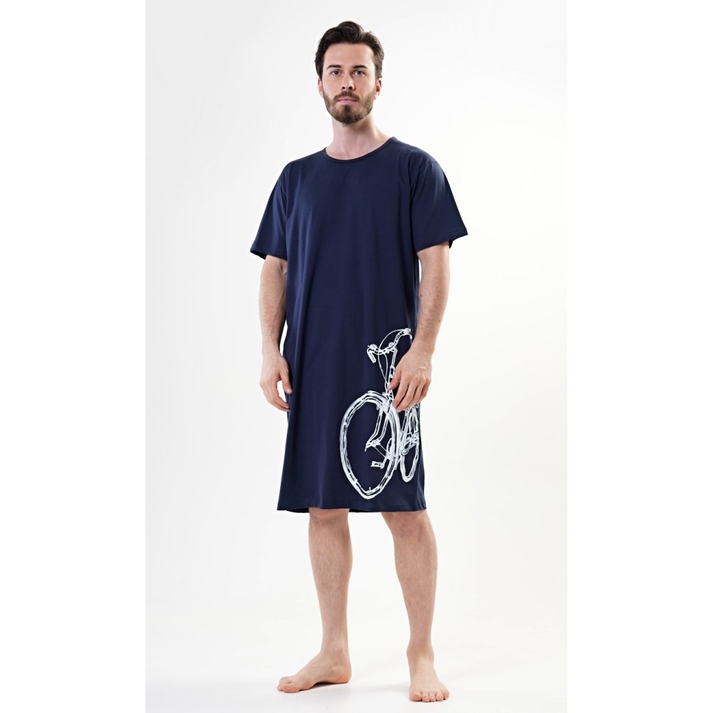 Pánska bavlnená nočná košeľa s krátkym rukávom a veľkým kolesom. Pánska nočná košeľa pre všetkých milovníkov pohodlia s obrázkom veľkého kolesa na leme. Použitý bavlnený materiál je príjemný a pružný na dotyk. Obsah bavlny je 100 %, len svetlosivá farba je 70 %.
