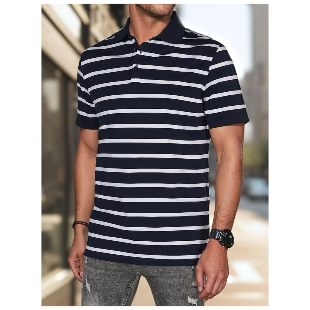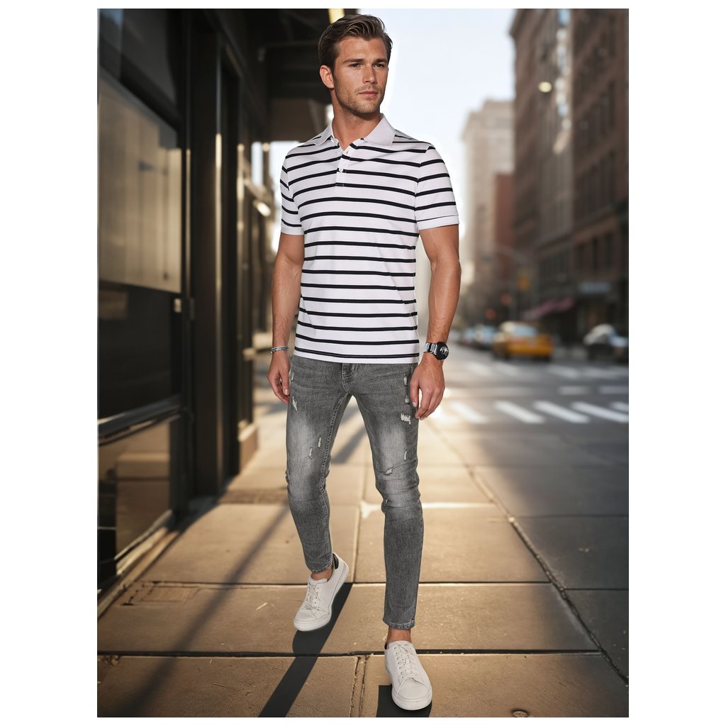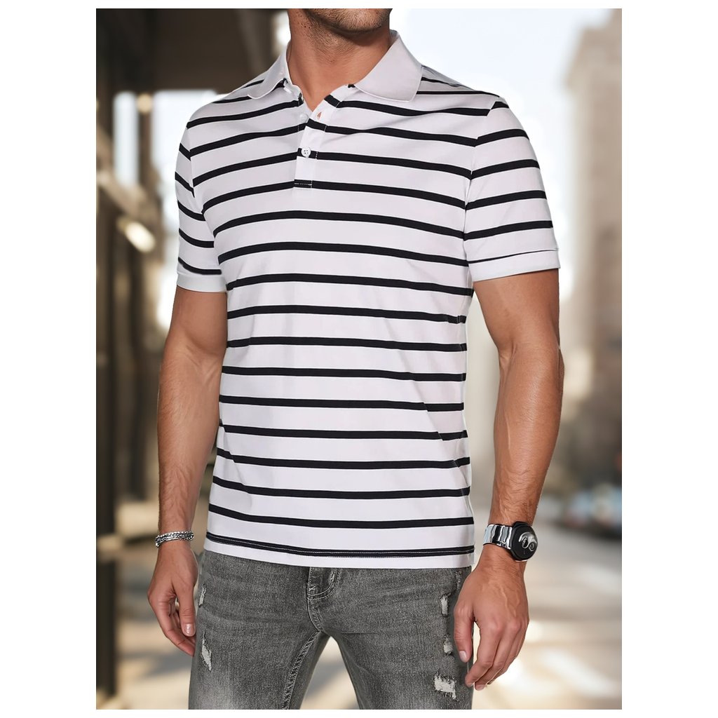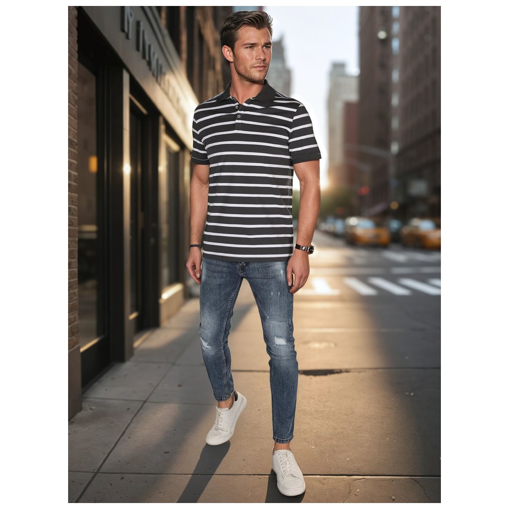 Toto pánske polo tričko sa vyznačuje nadčasovým dizajnom a je vyrobené z mäkkej a priedušnej látky, ideálne pre teplejšie dni. Klasický strih zaisťuje pohodlie, zatiaľ čo vodorovné pruhy a zapínanie na gombíky dodávajú moderný nádych. Ideálne na každodenné nosenie aj mestské outfity. Ideálne pre jarné obdobie.