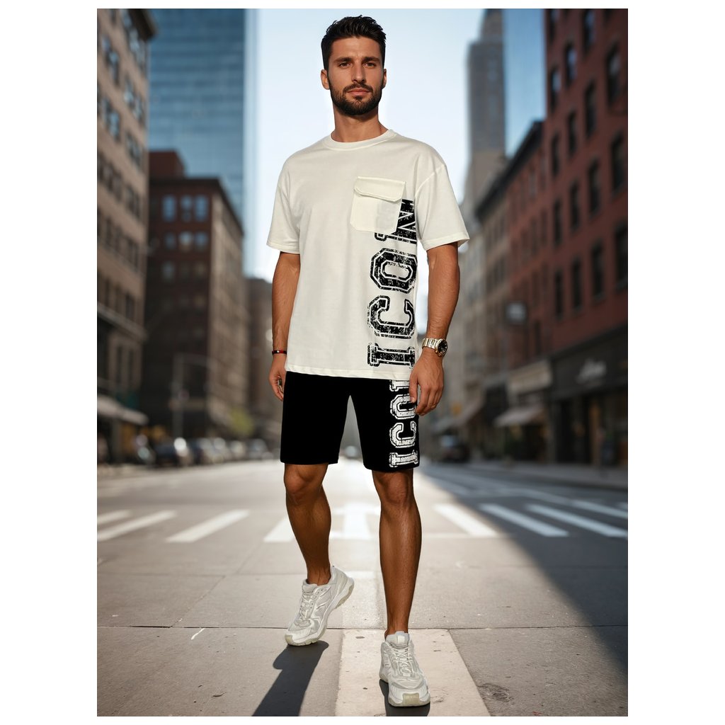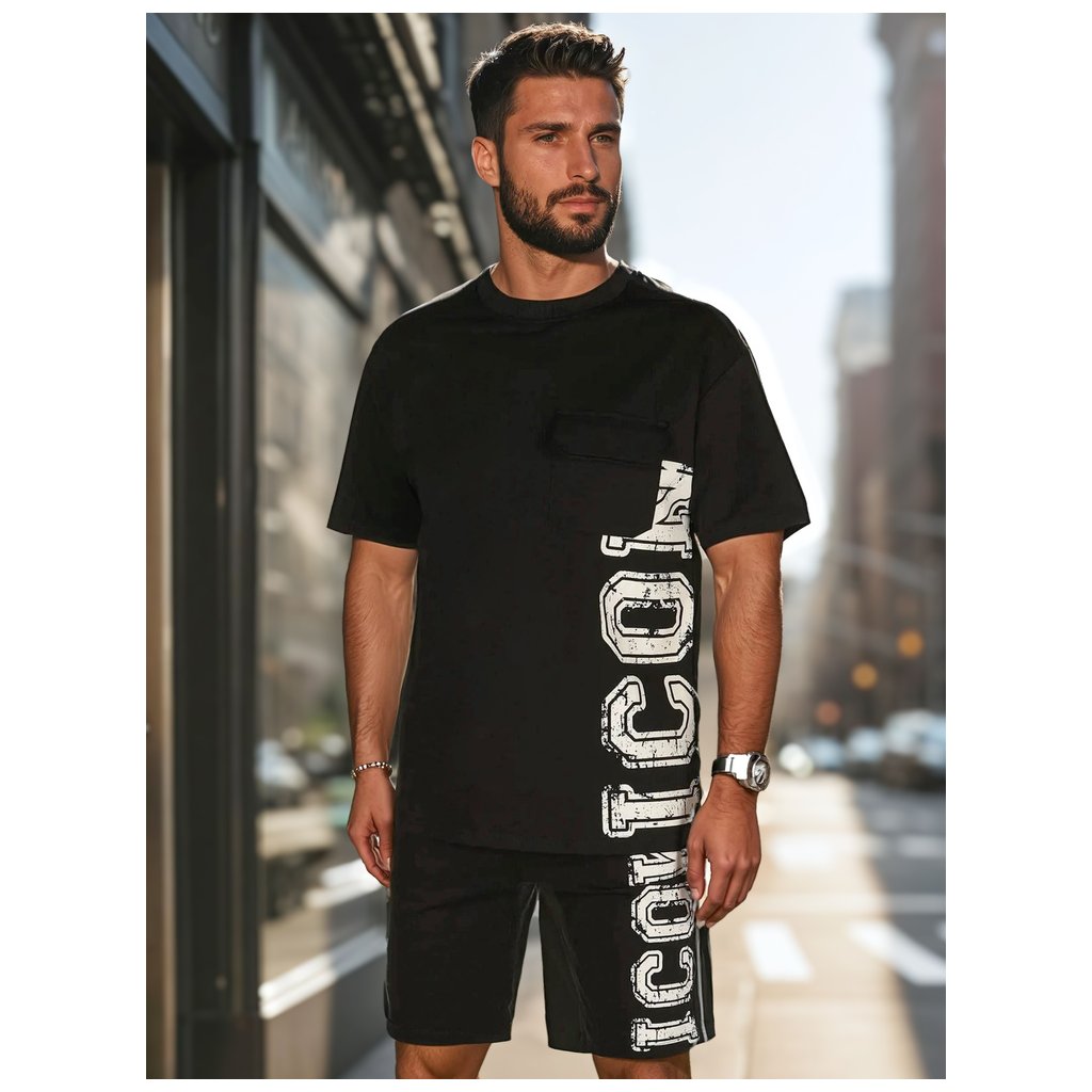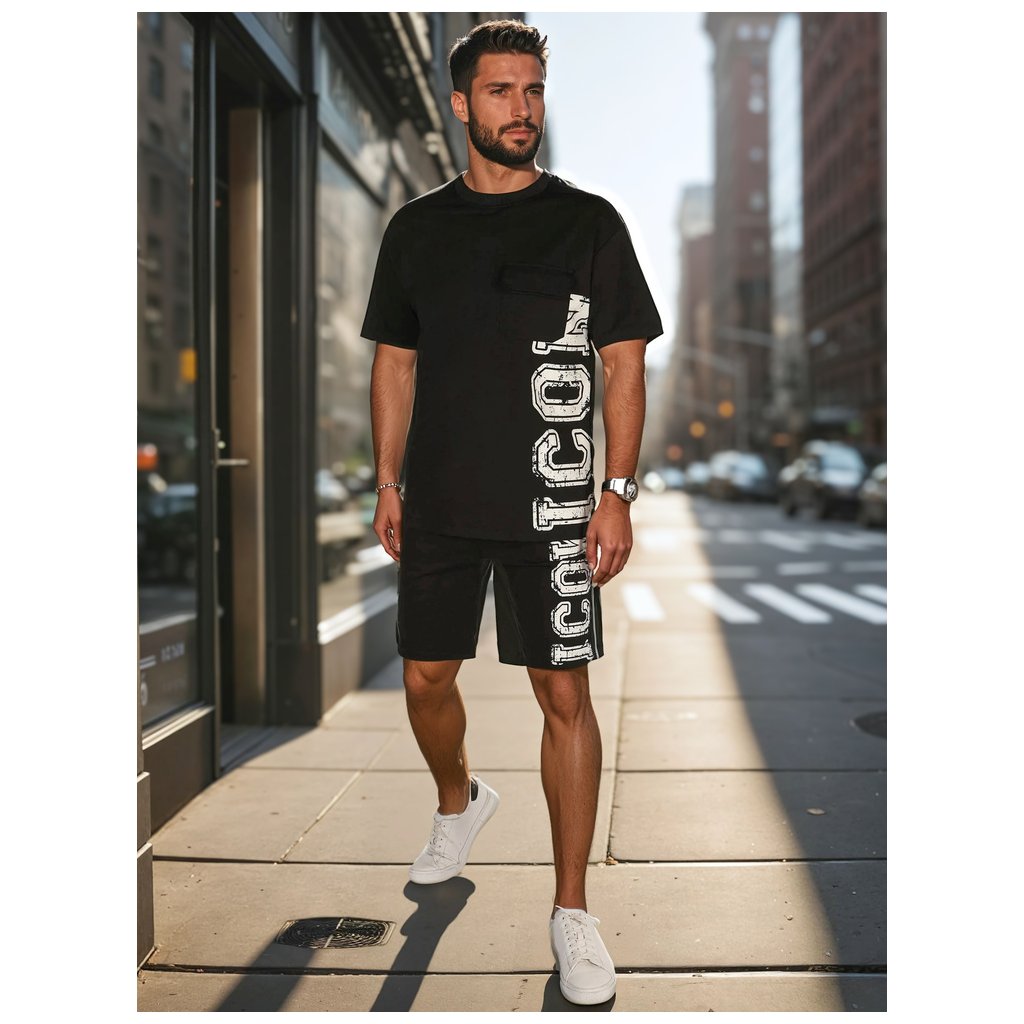 Táto pánska tepláková súprava, ktorá sa skladá z trička a šortiek, je modernou voľbou pre milovníkov pohodlného štýlu. Tričko má unikátnu potlač "ICON" a klopové vrecko, zatiaľ čo šortky majú elastický pás so sťahovacou šnúrkou a vrecká na zips. Táto súprava je ideálna pre mestské outfity v teplých jarných dňoch.