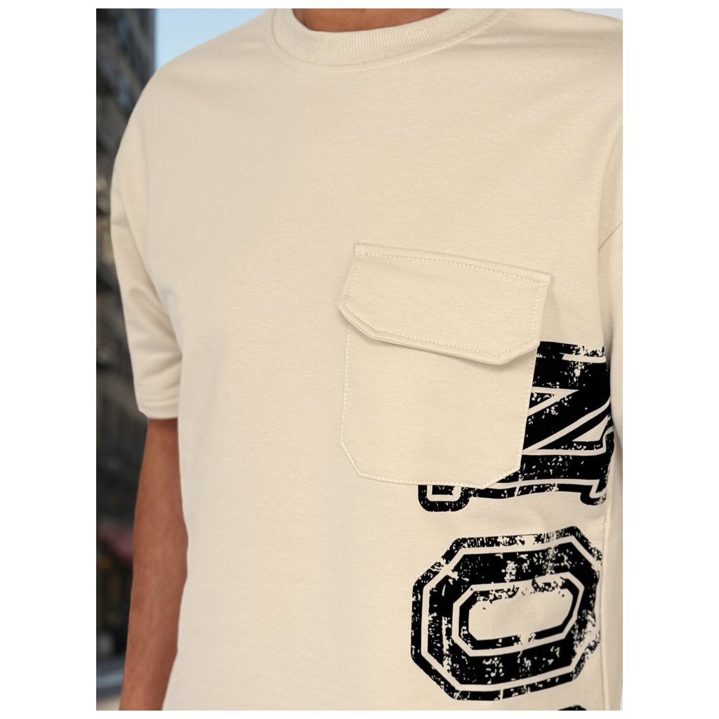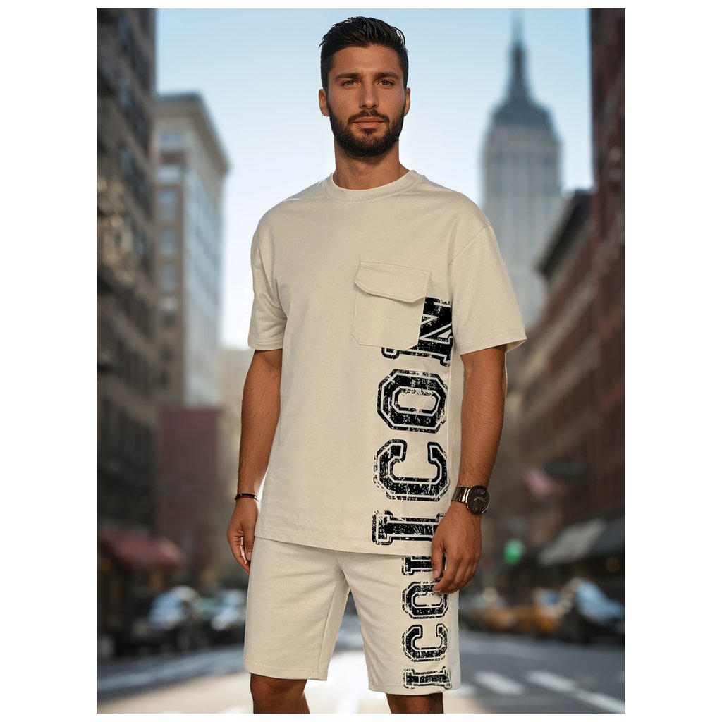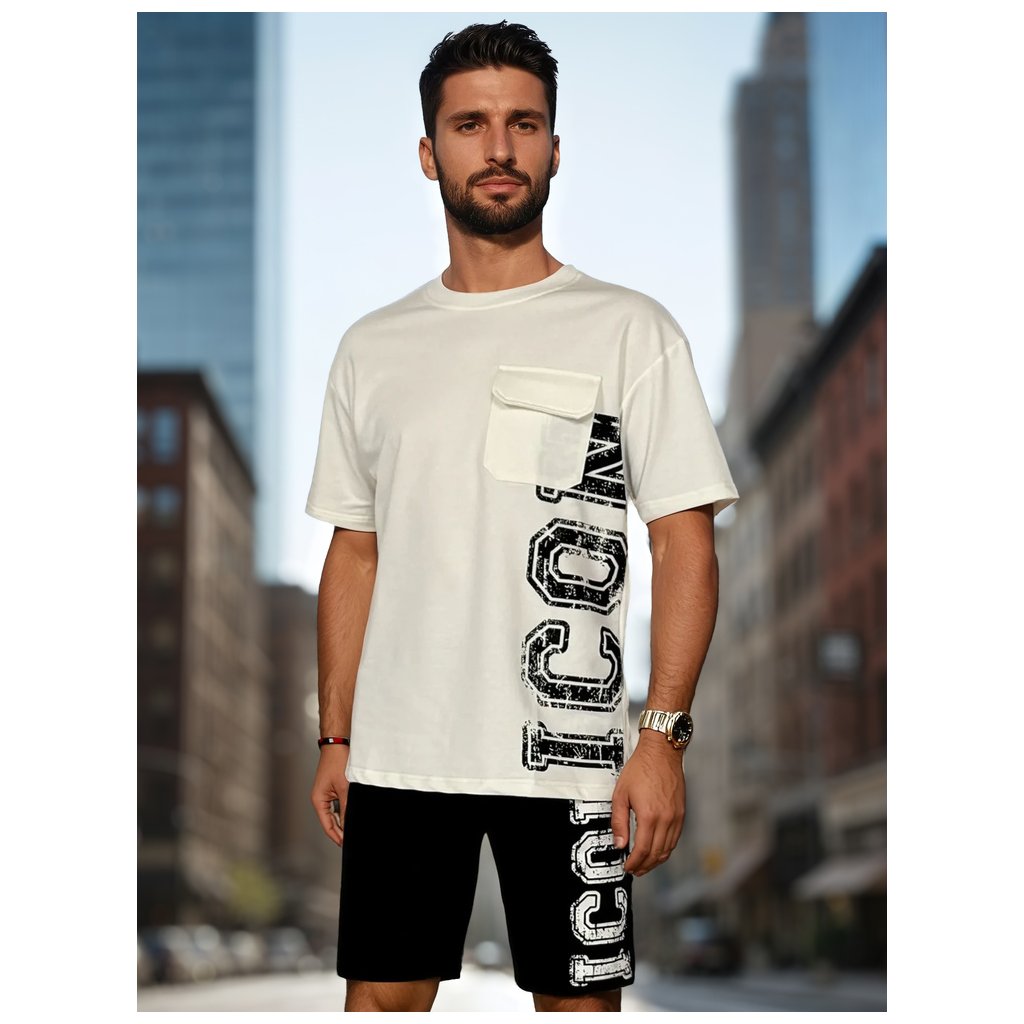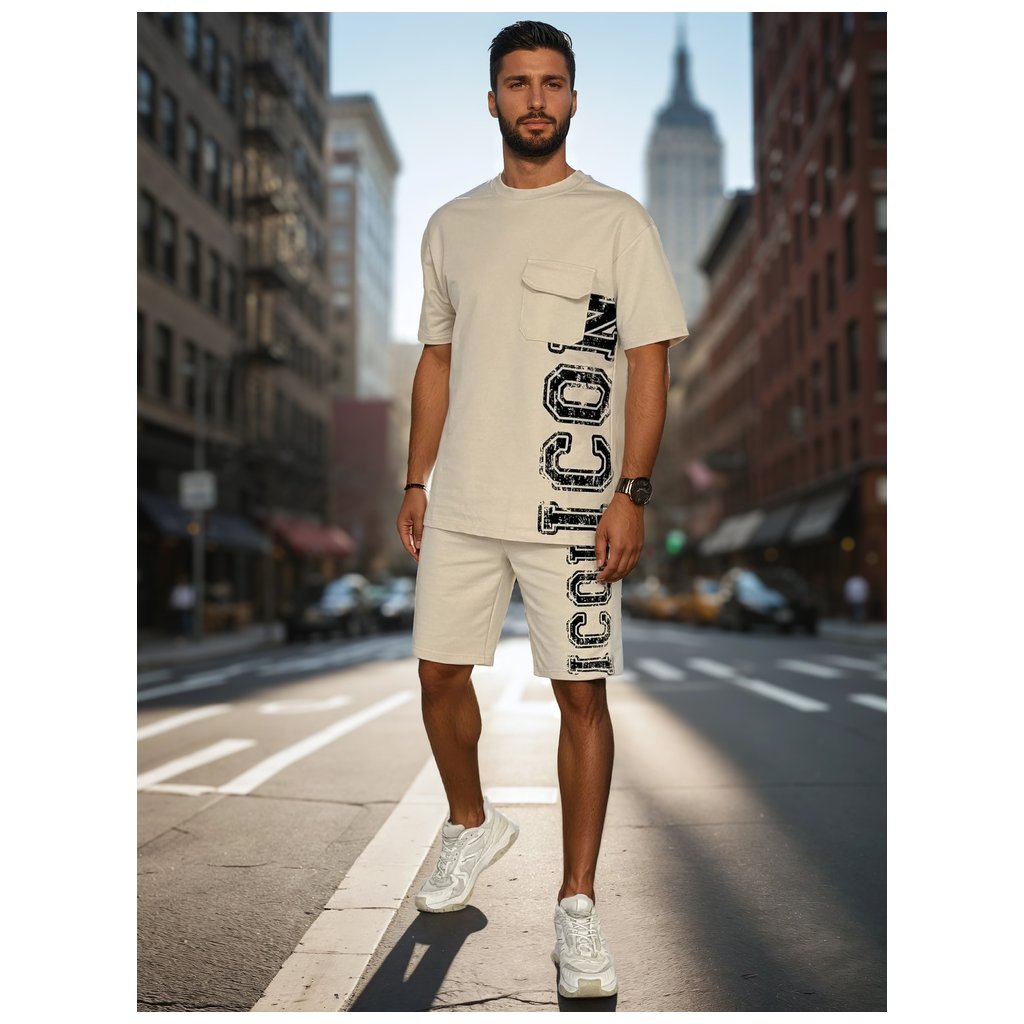 Táto pánska tepláková súprava, ktorá sa skladá z trička a šortiek, je modernou voľbou pre milovníkov pohodlného štýlu. Tričko má unikátnu potlač "ICON" a klopové vrecko, zatiaľ čo šortky majú elastický pás so sťahovacou šnúrkou a vrecká na zips. Táto súprava je ideálna pre mestské outfity v teplých jarných dňoch.