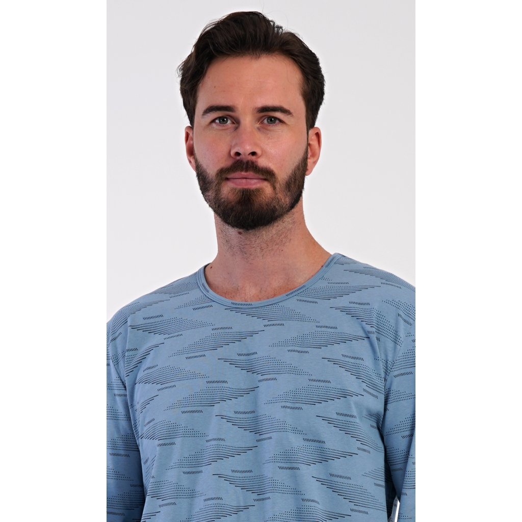 Pánske dlhé bavlnené pyžamo Arny. Pánske pyžamo pozostáva z košele s dlhým rukávom a dlhých nohavíc. Tričko s okrúhlym výstrihom je potlačené geometrickým vzorom. Jednofarebné nohavice majú elastický pás, šnúrku na stiahnutie a praktické vrecká. Materiál zo 100 % bavlny je pružný a príjemný na dotyk.
