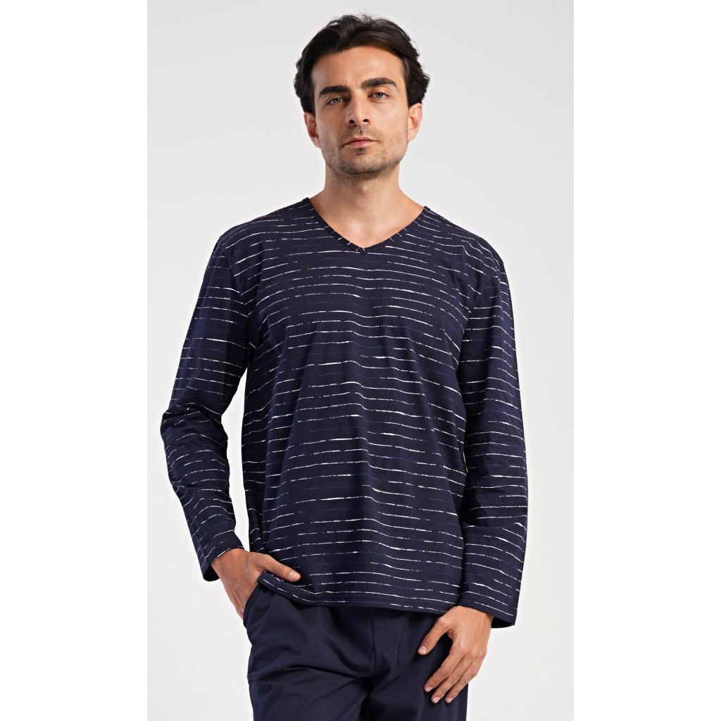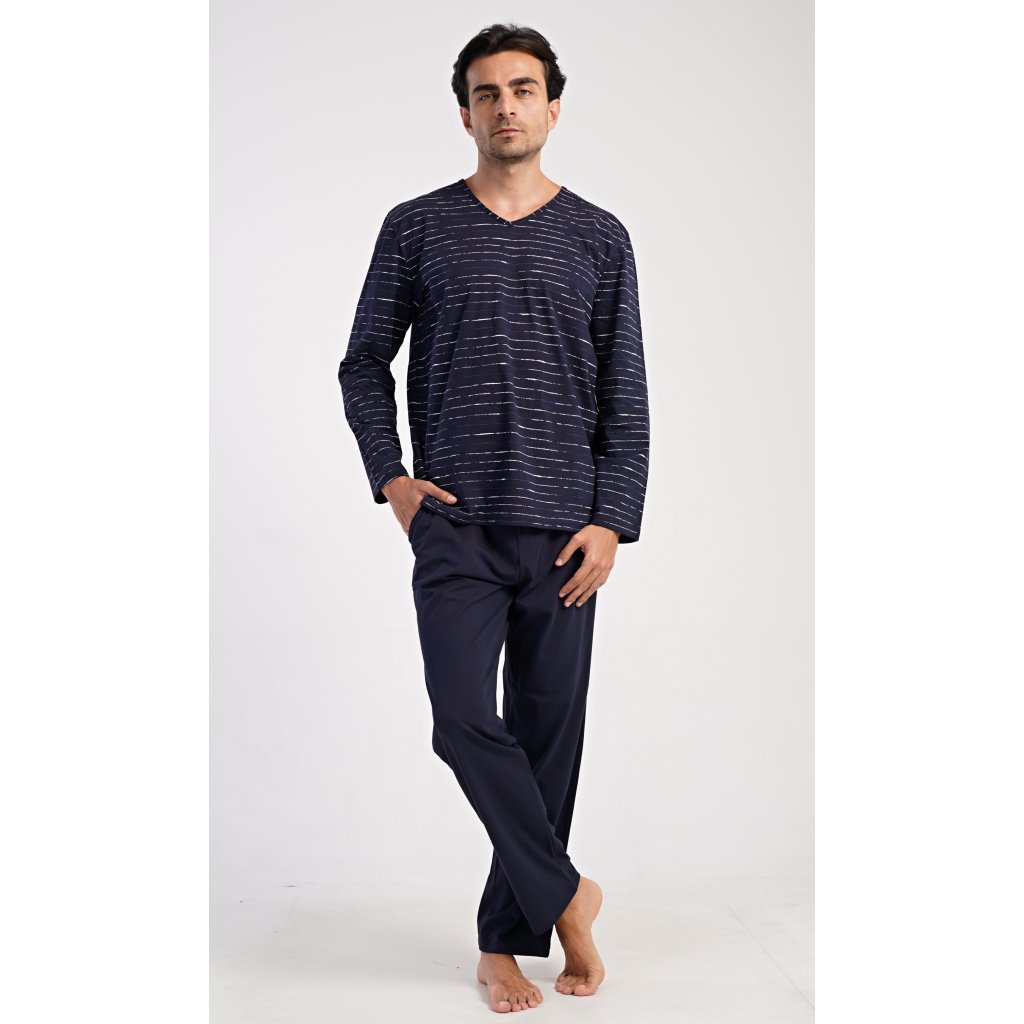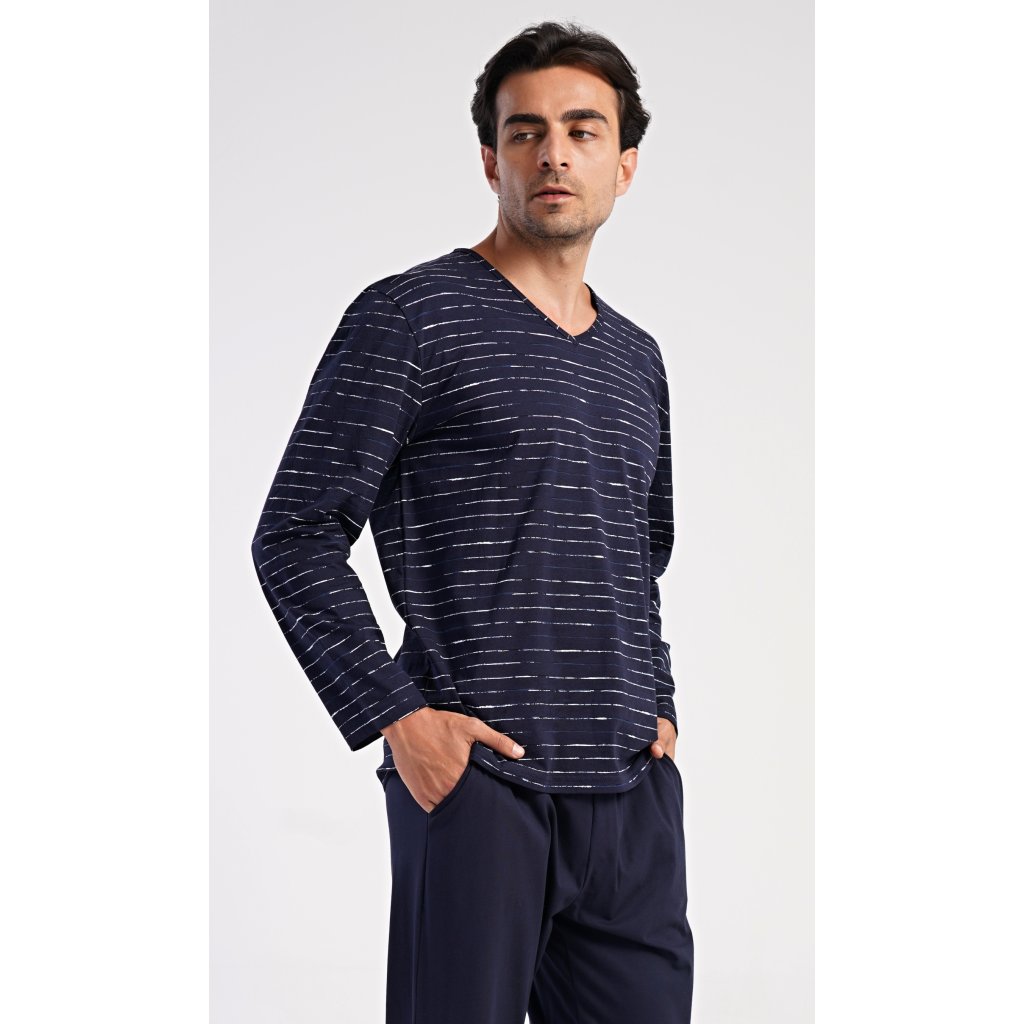 Pánske dlhé bavlnené pyžamo Bart. Pánske pyžamo pozostáva z košele s dlhým rukávom a dlhých nohavíc. Tričko s výstrihom do V zdobia nepravidelné prúžky. Jednofarebné nohavice majú elastický pás, šnúrku na stiahnutie a praktické vrecká. Materiál zo 100 % bavlny je pružný a príjemný na dotyk.