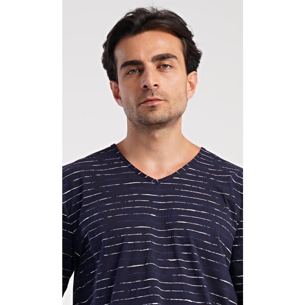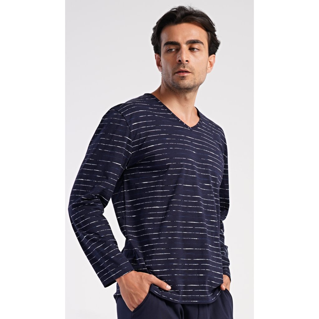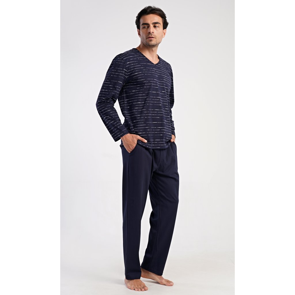 Pánske dlhé bavlnené pyžamo Bart. Pánske pyžamo pozostáva z košele s dlhým rukávom a dlhých nohavíc. Tričko s výstrihom do V zdobia nepravidelné prúžky. Jednofarebné nohavice majú elastický pás, šnúrku na stiahnutie a praktické vrecká. Materiál zo 100 % bavlny je pružný a príjemný na dotyk.
