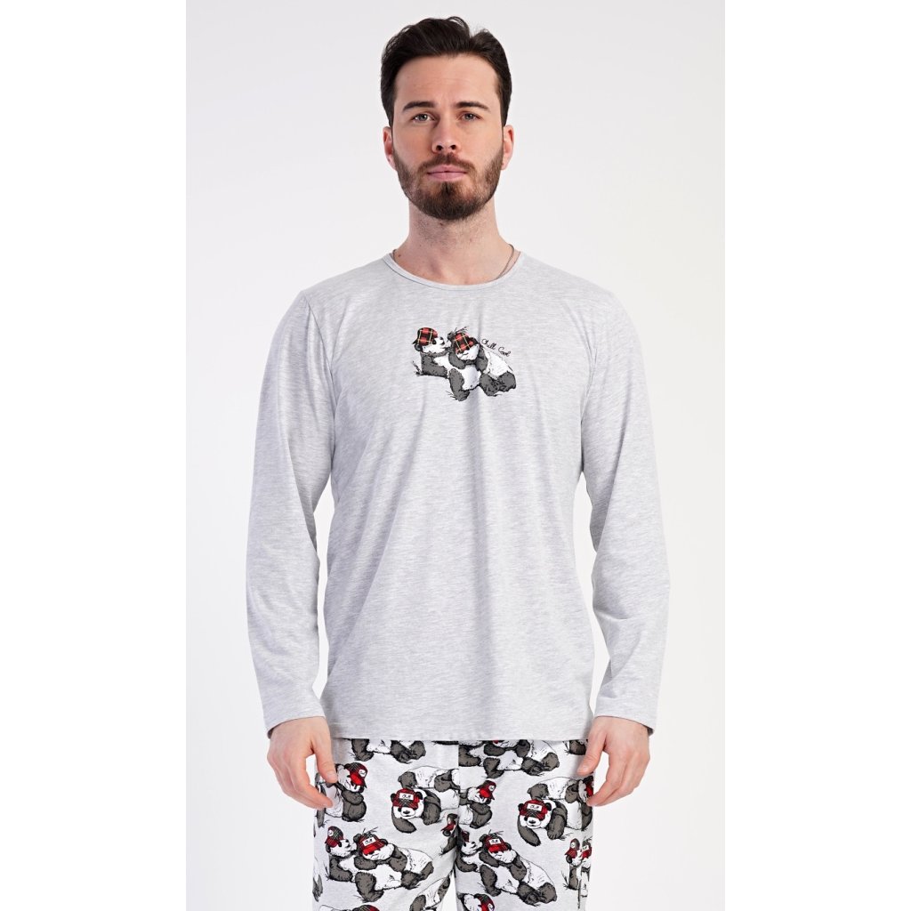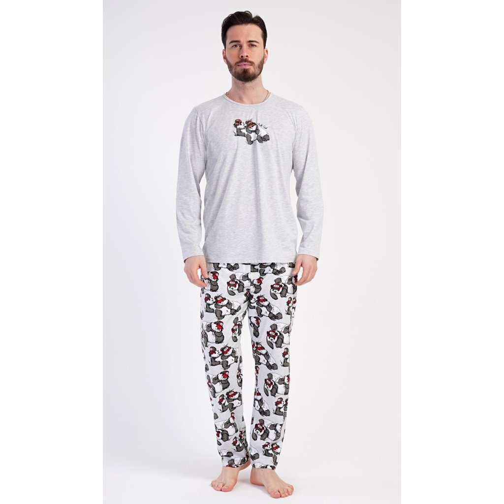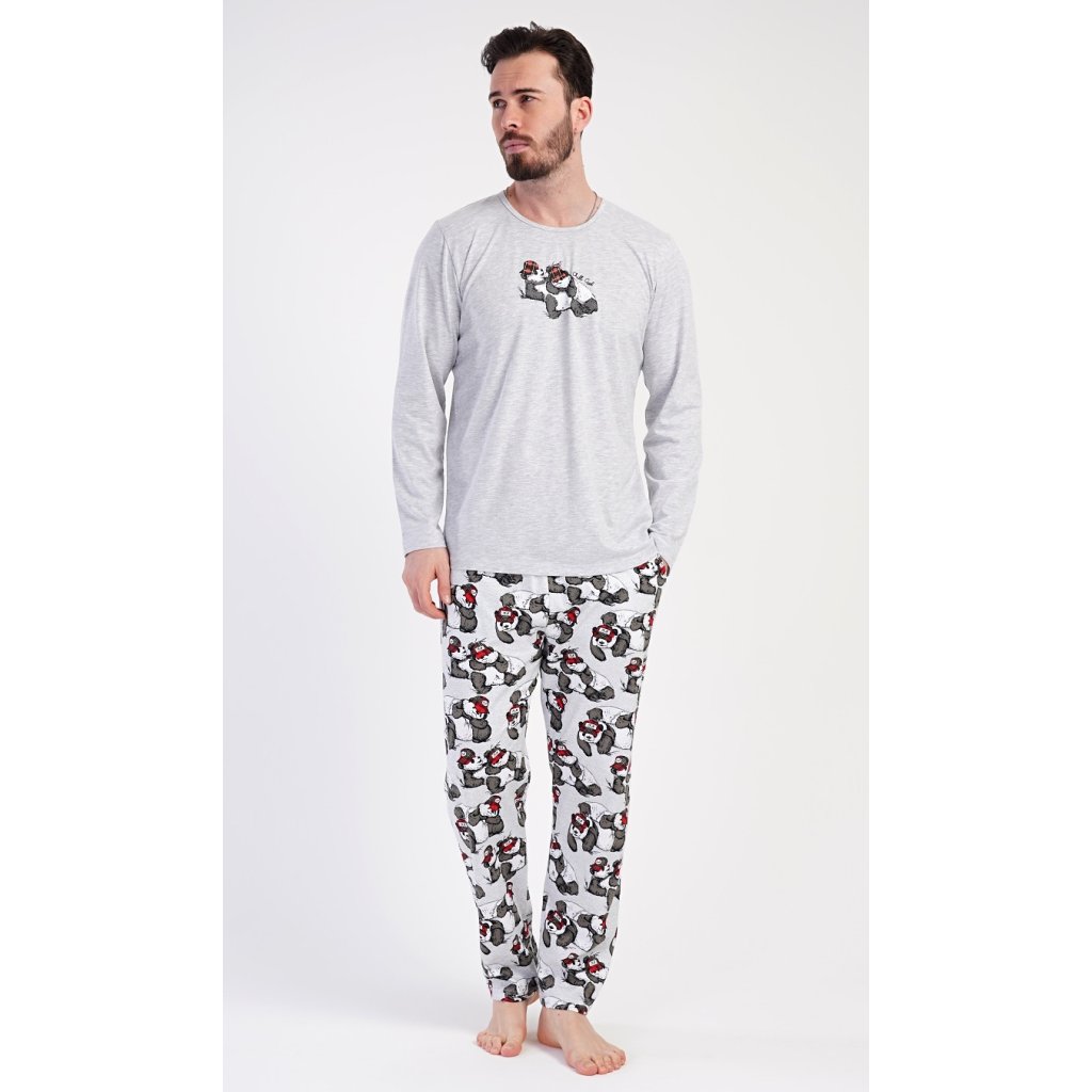 Pánske dlhé pyžamo Enjoy. Pánske pyžamo pozostáva z košele s dlhým rukávom a dlhých nohavíc. Tričko je jednofarebné, na hrudi zdobené malým nápisom a obrázkom spiacich medveďov. Rovnaký motív sa opakuje aj na nohaviciach, ktoré majú elastický pás, šnúrku a praktické vrecká. Materiál zo 70 % bavlny je pružný a príjemný na dotyk.