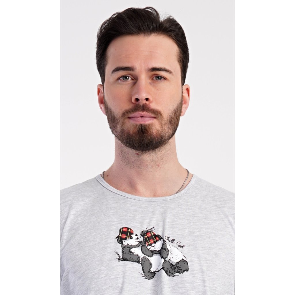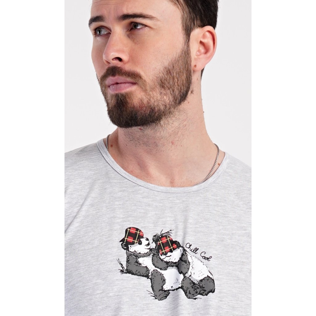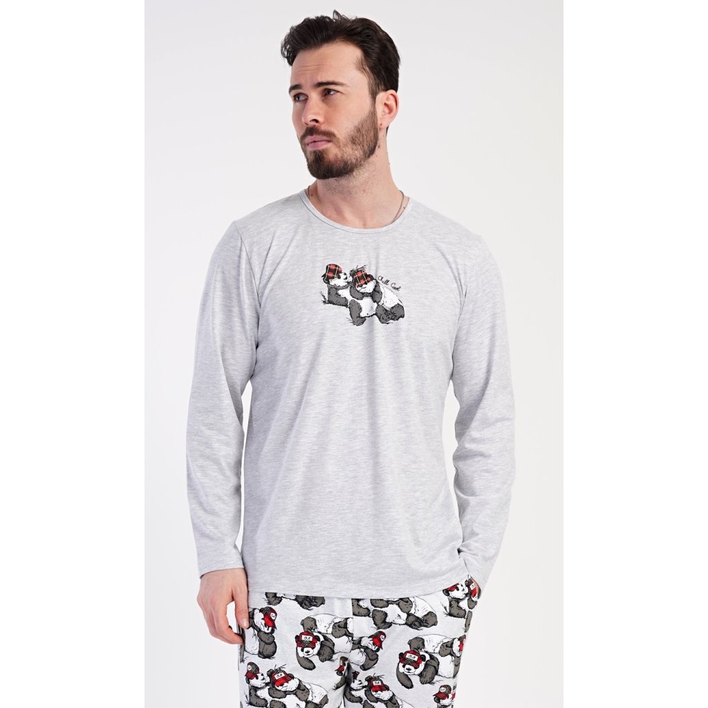 Pánske dlhé pyžamo Enjoy. Pánske pyžamo pozostáva z košele s dlhým rukávom a dlhých nohavíc. Tričko je jednofarebné, na hrudi zdobené malým nápisom a obrázkom spiacich medveďov. Rovnaký motív sa opakuje aj na nohaviciach, ktoré majú elastický pás, šnúrku a praktické vrecká. Materiál zo 70 % bavlny je pružný a príjemný na dotyk.
