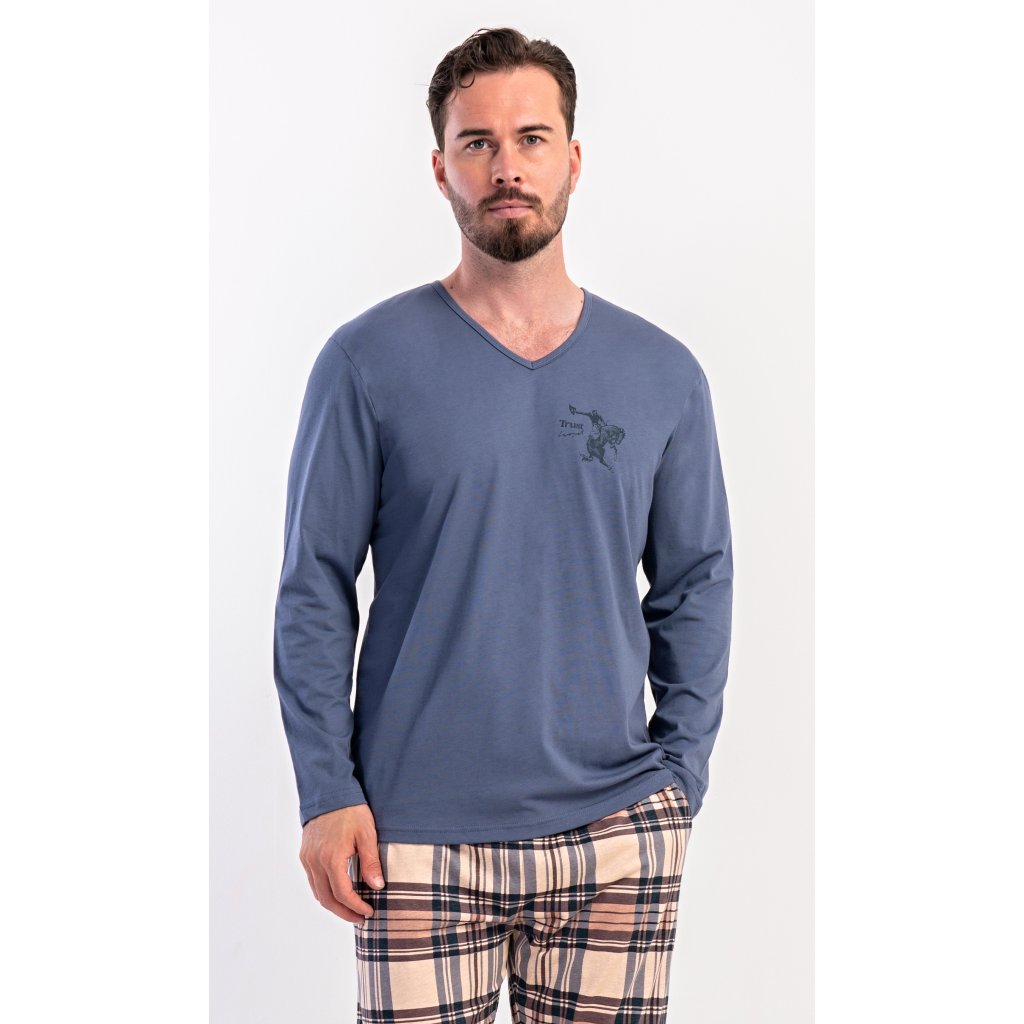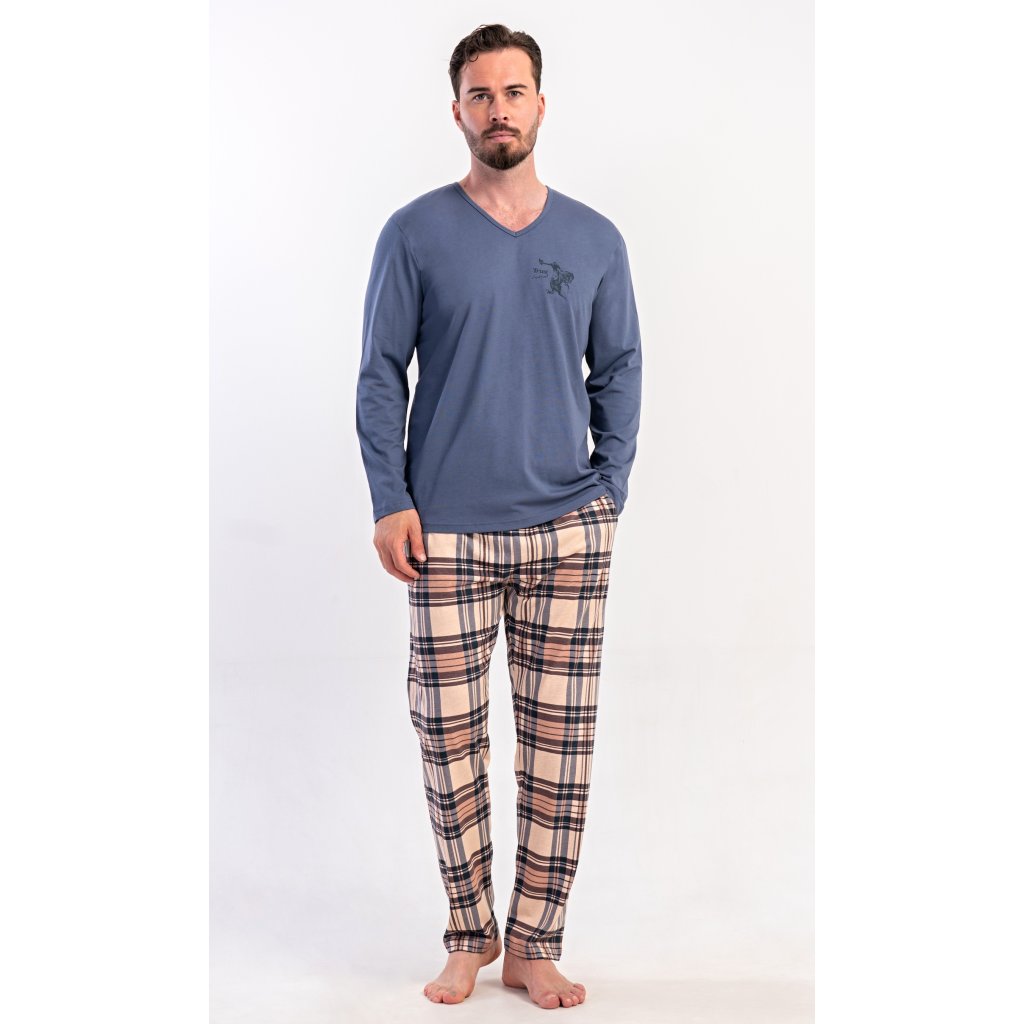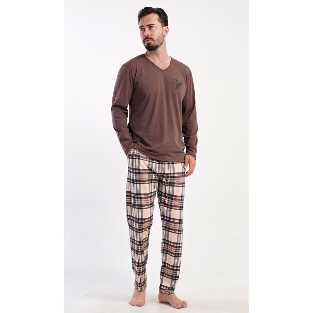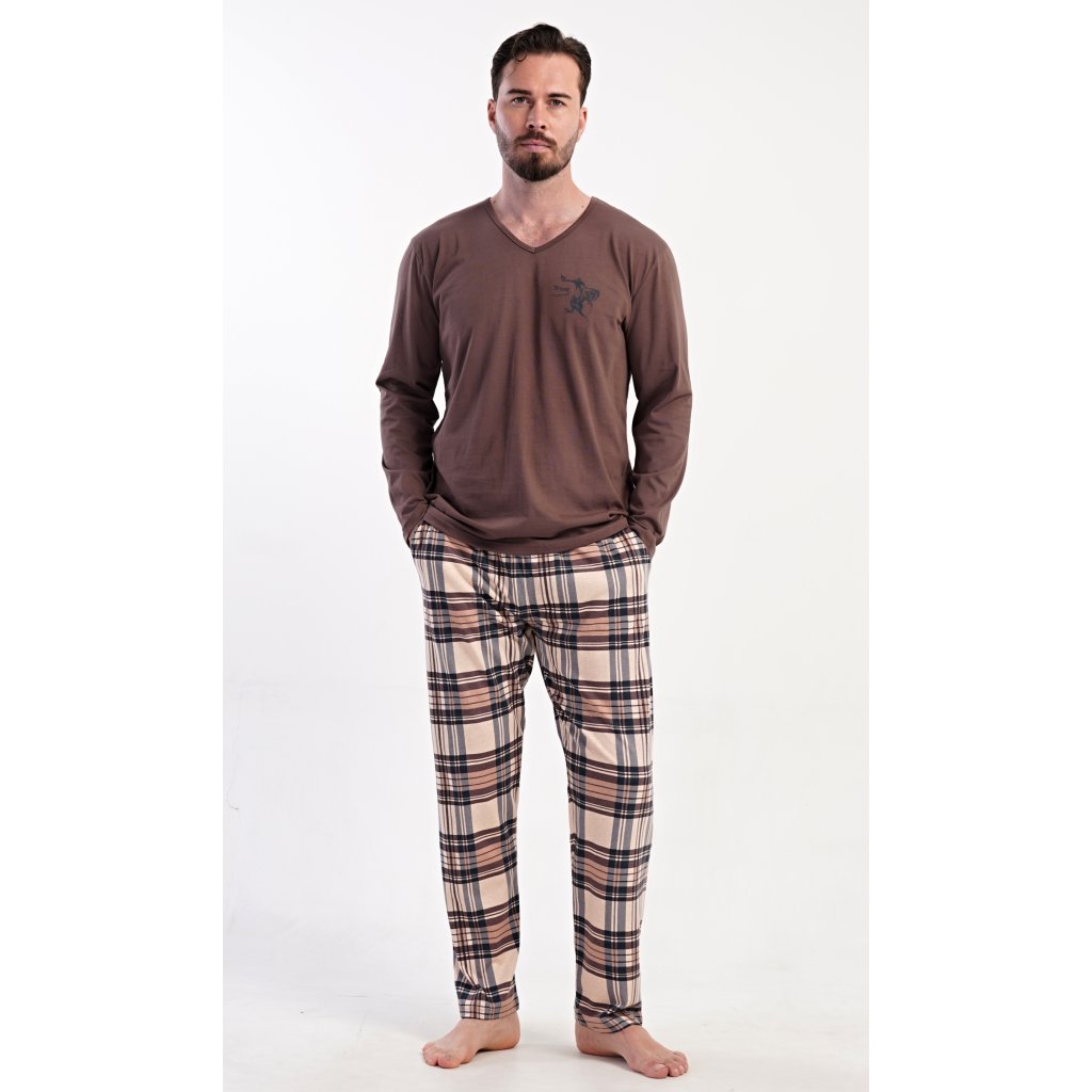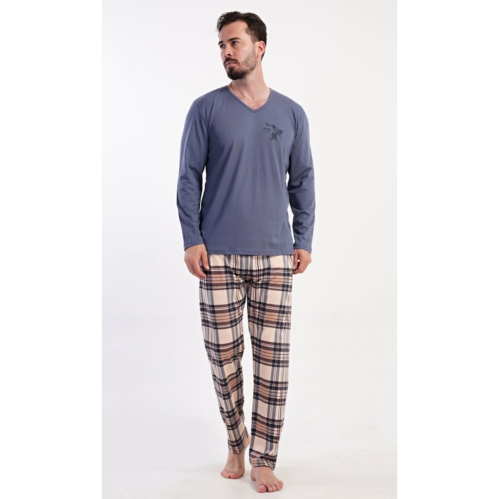 Pánske dlhé bavlnené pyžamo Paul. Pánske pyžamo pozostáva z košele s dlhým rukávom a dlhých nohavíc. Tričko je jednofarebné, zdobené na hrudi drobným obrázkom. Kárované nohavice majú elastický pás, šnúrku na stiahnutie a praktické vrecká. Materiál zo 100 % bavlny je pružný a príjemný na dotyk.