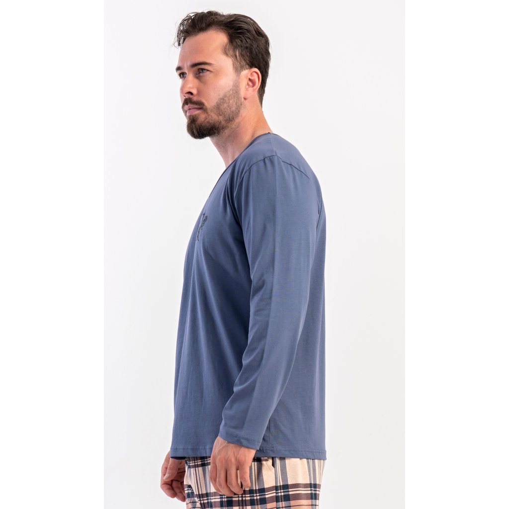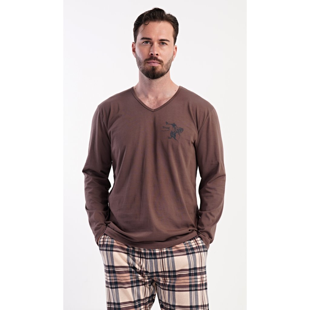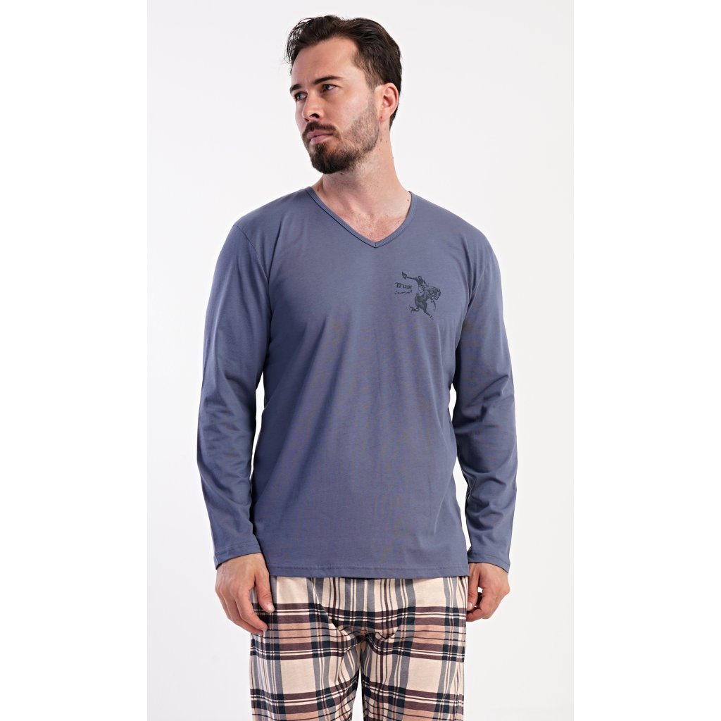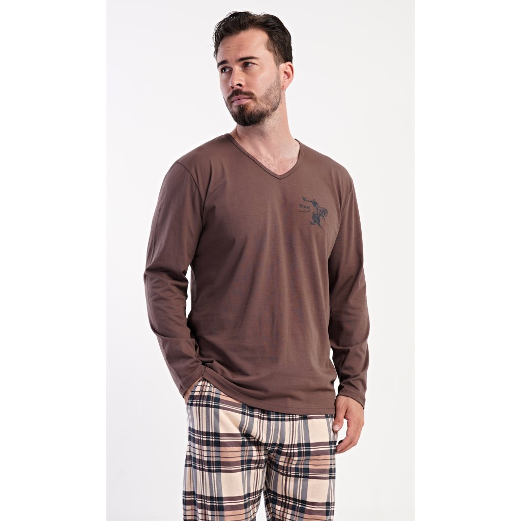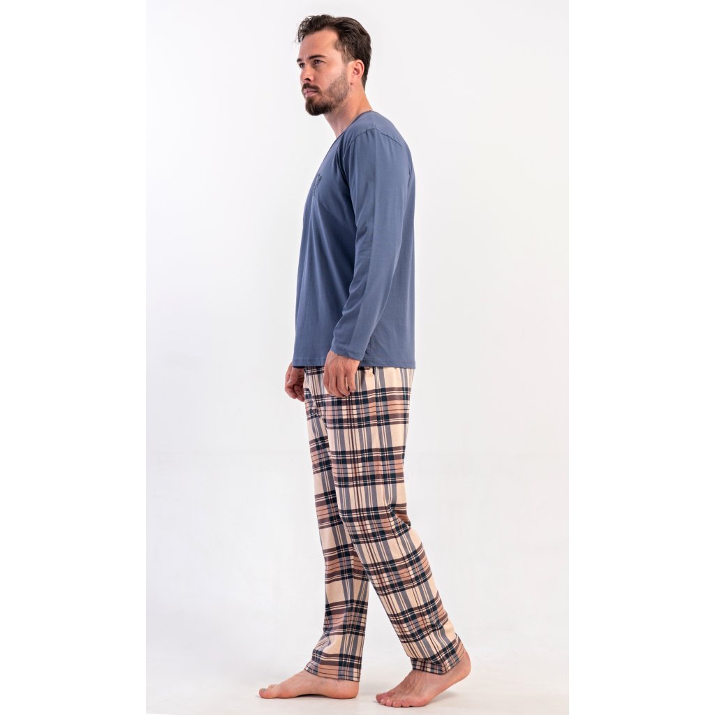 Pánske dlhé bavlnené pyžamo Paul. Pánske pyžamo pozostáva z košele s dlhým rukávom a dlhých nohavíc. Tričko je jednofarebné, zdobené na hrudi drobným obrázkom. Kárované nohavice majú elastický pás, šnúrku na stiahnutie a praktické vrecká. Materiál zo 100 % bavlny je pružný a príjemný na dotyk.
