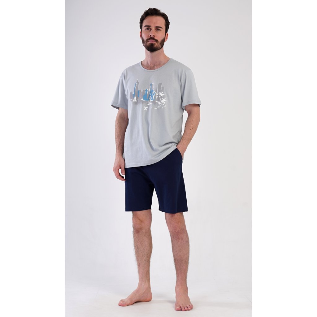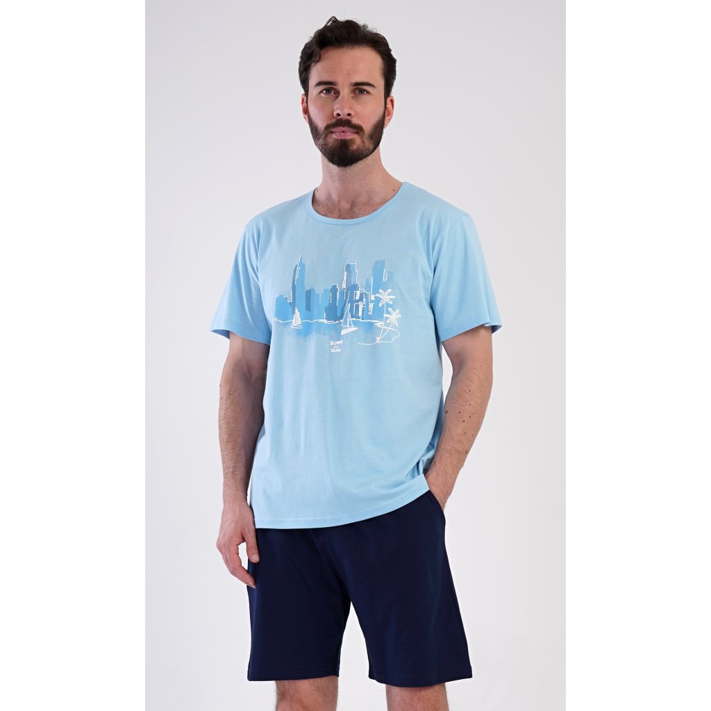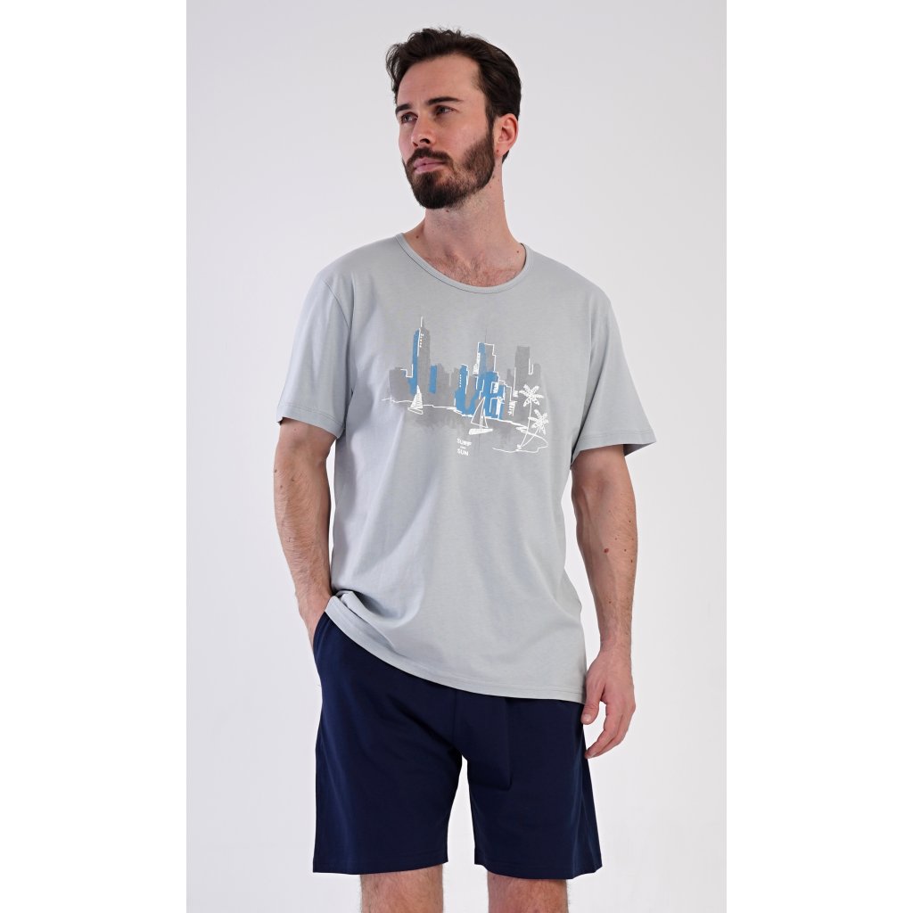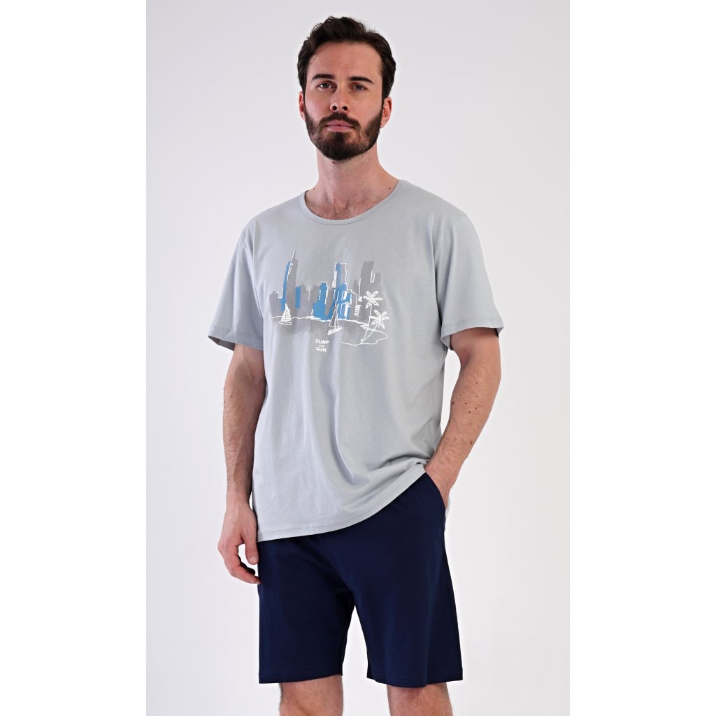 Pánske bavlnené šortkové pyžamo Bruno. Pánske pyžamo pozostáva z trička s krátkym rukávom a krátkych šortiek. Jednofarebné tričko zdobí obrázok zátoky vo veľkomeste. Šortky majú praktické vrecká, elastický pás a šnúrku na stiahnutie. Materiál zo 100 % bavlny je príjemný a mäkký na dotyk. Pyžamo oceníte obzvlášť v horúcich letných dňoch.