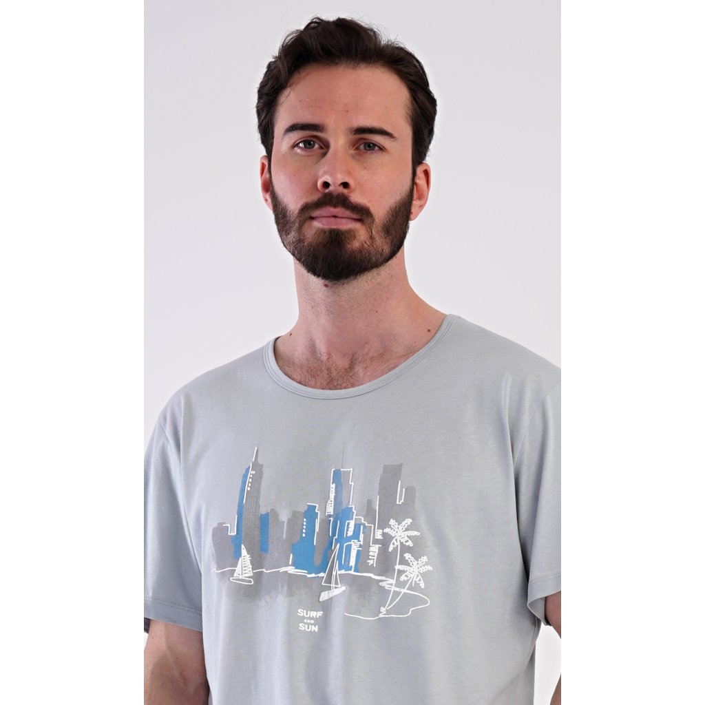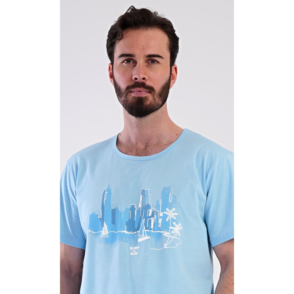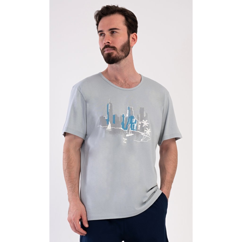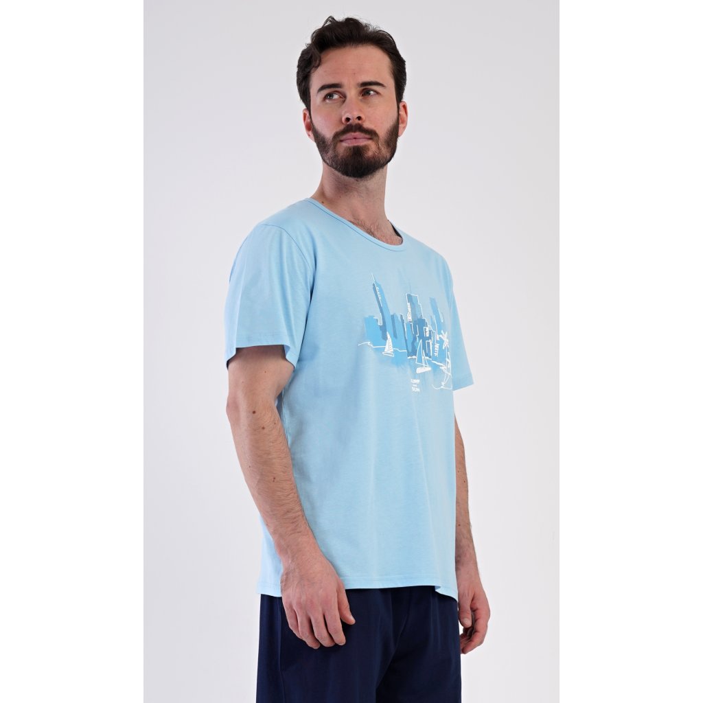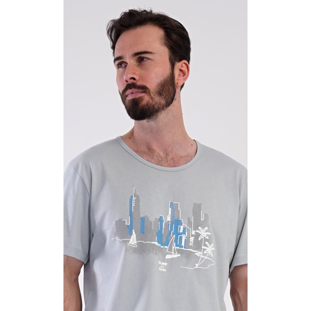 Pánske bavlnené šortkové pyžamo Bruno. Pánske pyžamo pozostáva z trička s krátkym rukávom a krátkych šortiek. Jednofarebné tričko zdobí obrázok zátoky vo veľkomeste. Šortky majú praktické vrecká, elastický pás a šnúrku na stiahnutie. Materiál zo 100 % bavlny je príjemný a mäkký na dotyk. Pyžamo oceníte obzvlášť v horúcich letných dňoch.