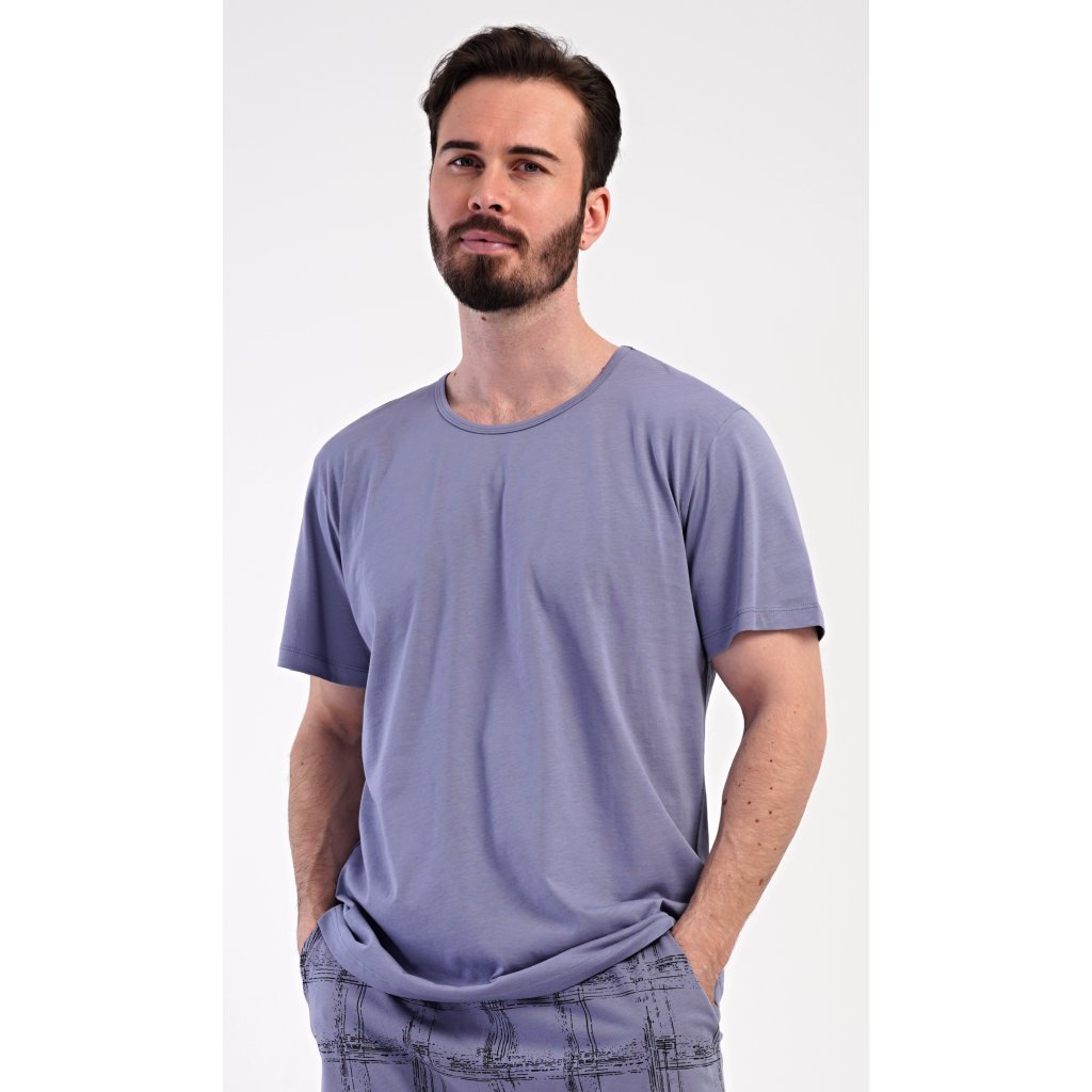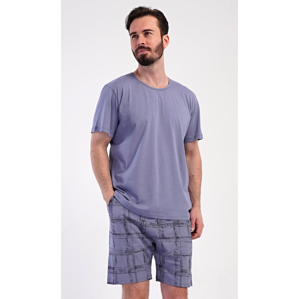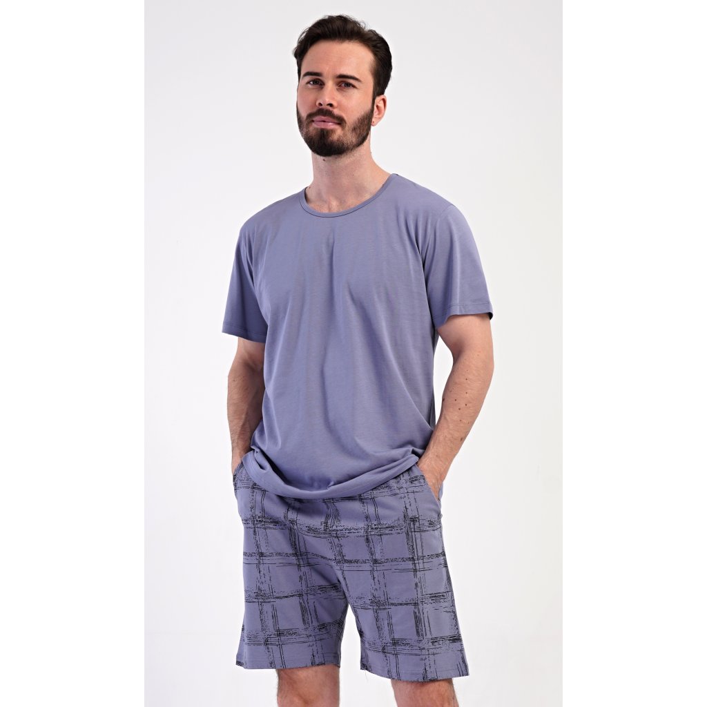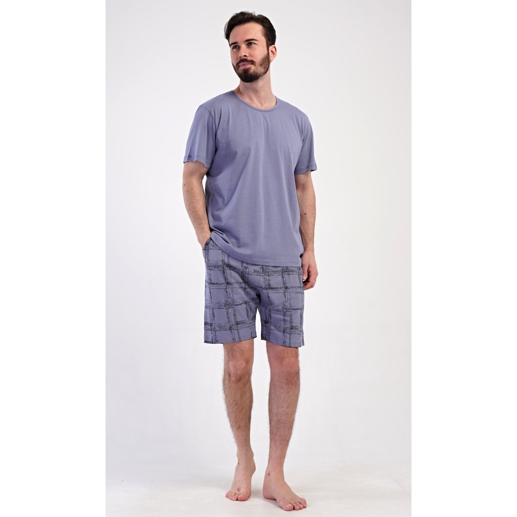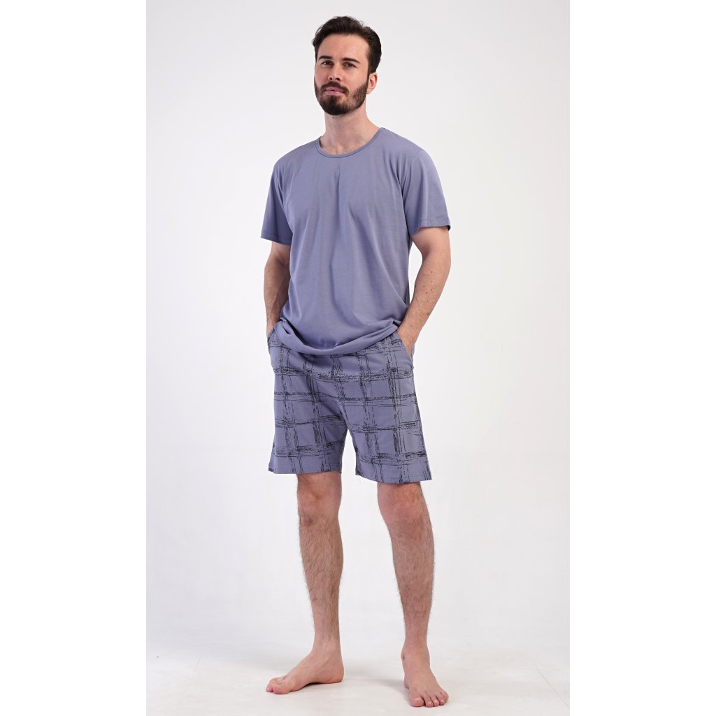Pánske bavlnené pyžamové šortky Jakub. Pánske pyžamo pozostáva z trička s krátkym rukávom a krátkych šortiek. Jednofarebné tričko má okrúhly výstrih a je vhodné pre všetkých milovníkov pohodlnej módy bez potlače. Tričko dopĺňajú kockované šortky, ktoré majú elastický pás, šnúrku na stiahnutie a praktické vrecká. Materiál zo 100 % bavlny je príjemný a hebký na dotyk.