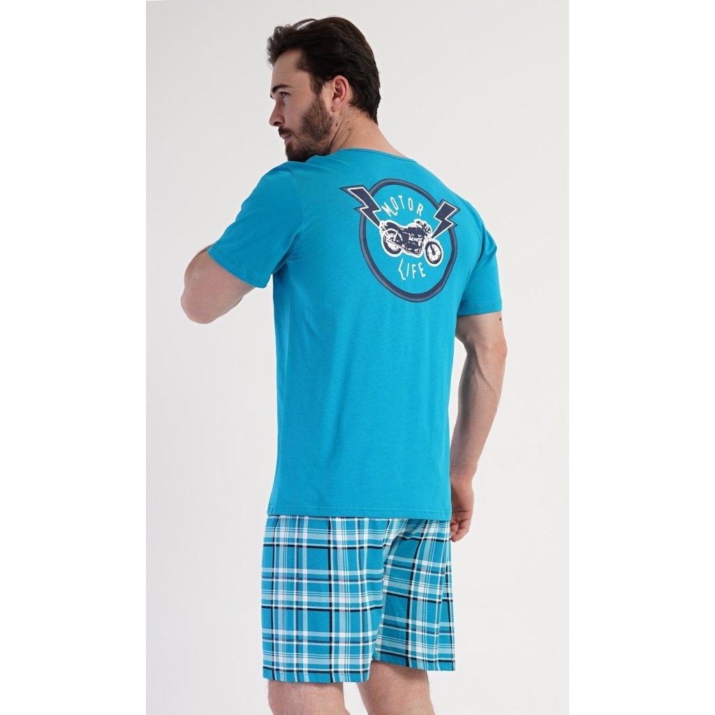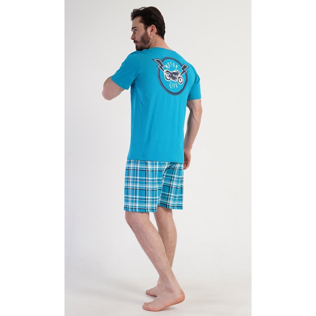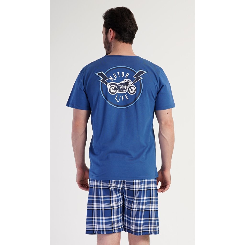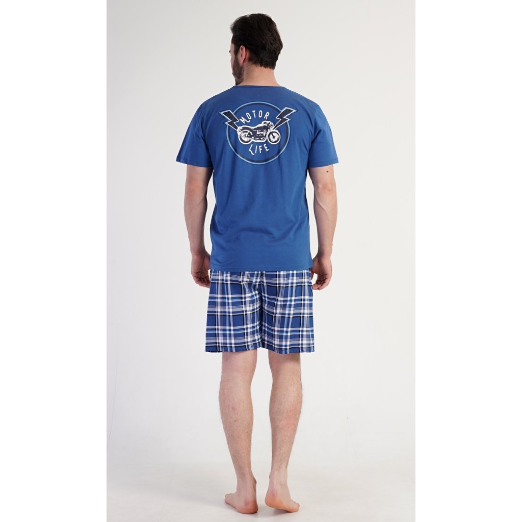 Pánske bavlnené šortky Motocykel. Pánske pyžamo pozostáva z trička s krátkym rukávom a krátkych šortiek. Tričko má na zadnej strane obrázok motocykla a nápis "Motor life". Tričko je doplnené károvanými šortkami, ktoré majú elastický pás a šnúrku, ale nemajú vrecká. Materiál zo 100 % bavlny je príjemný a hebký na dotyk.