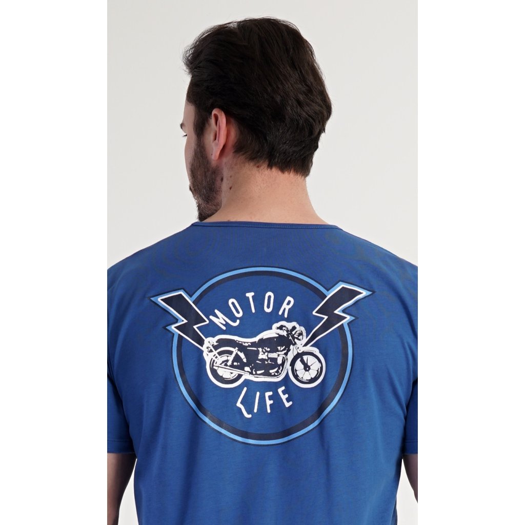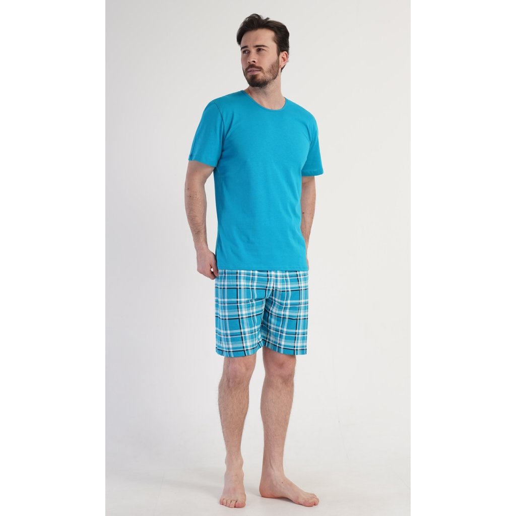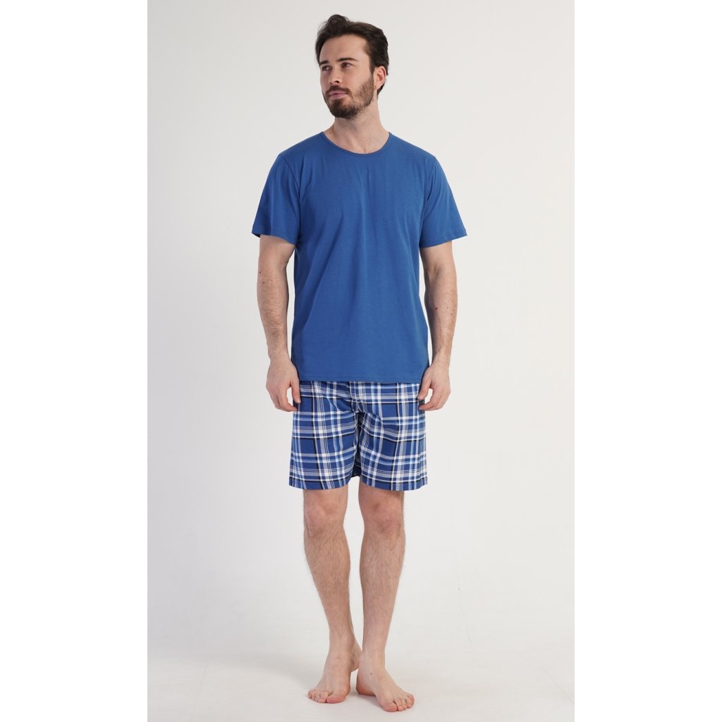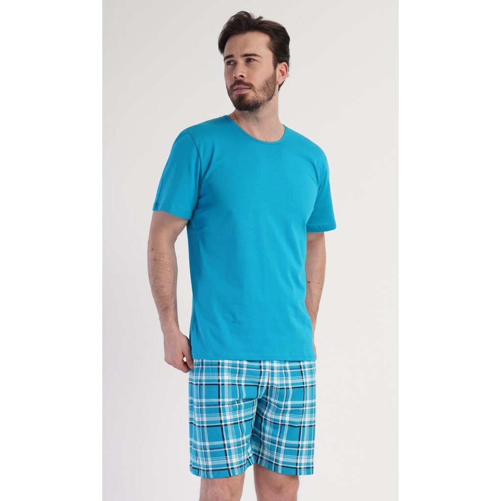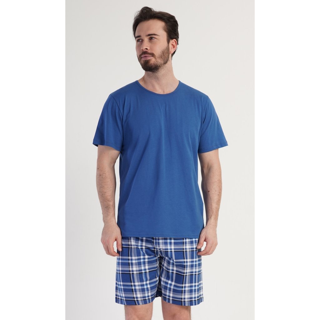 Pánske bavlnené šortky Motocykel. Pánske pyžamo pozostáva z trička s krátkym rukávom a krátkych šortiek. Tričko má na zadnej strane obrázok motocykla a nápis "Motor life". Tričko je doplnené károvanými šortkami, ktoré majú elastický pás a šnúrku, ale nemajú vrecká. Materiál zo 100 % bavlny je príjemný a hebký na dotyk.
