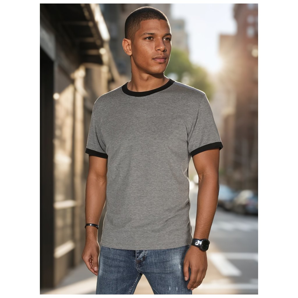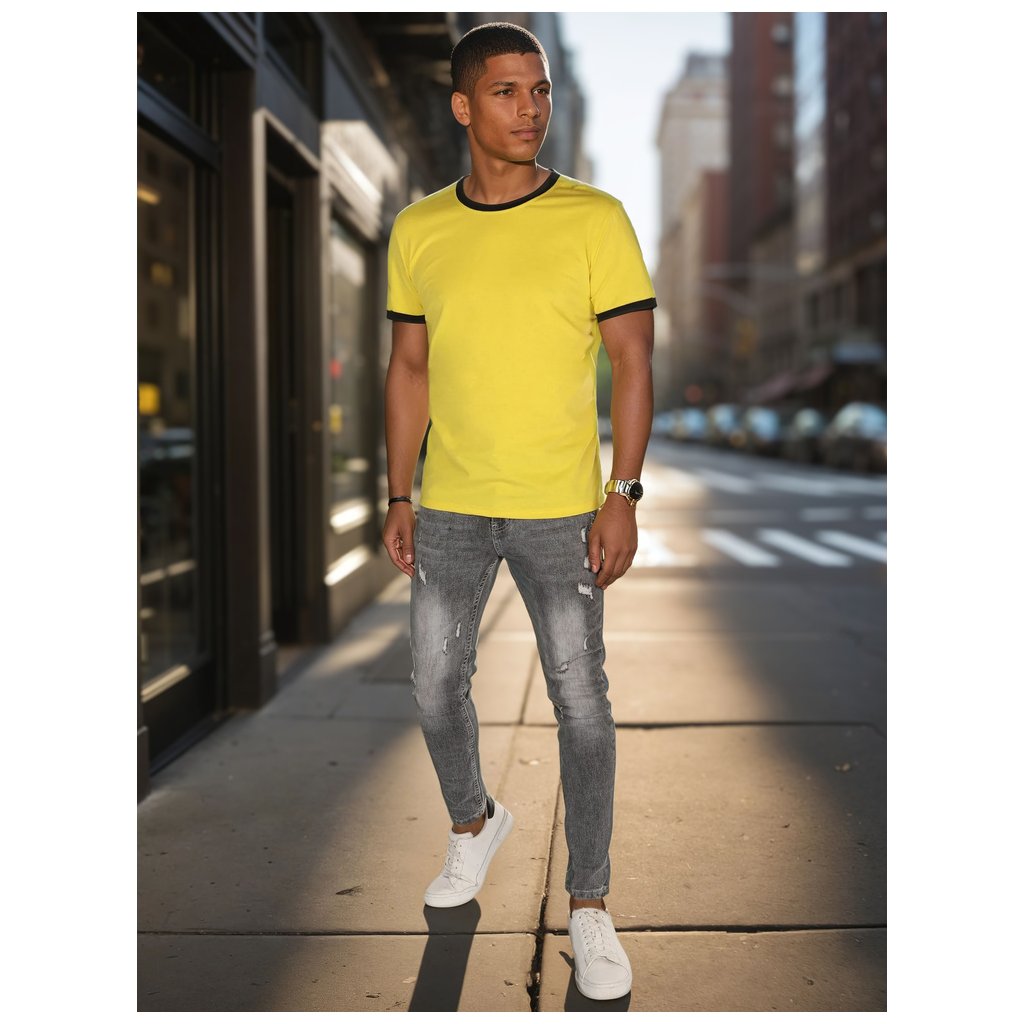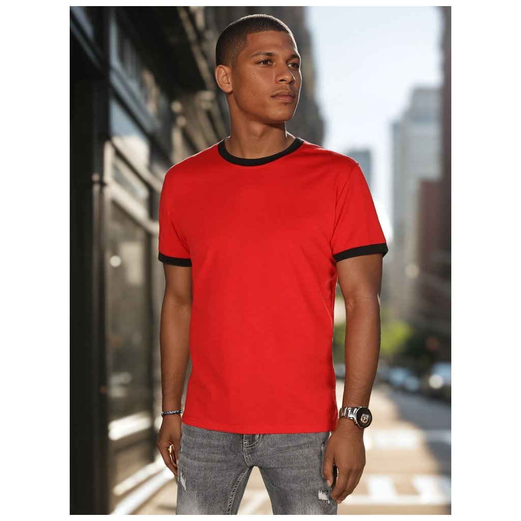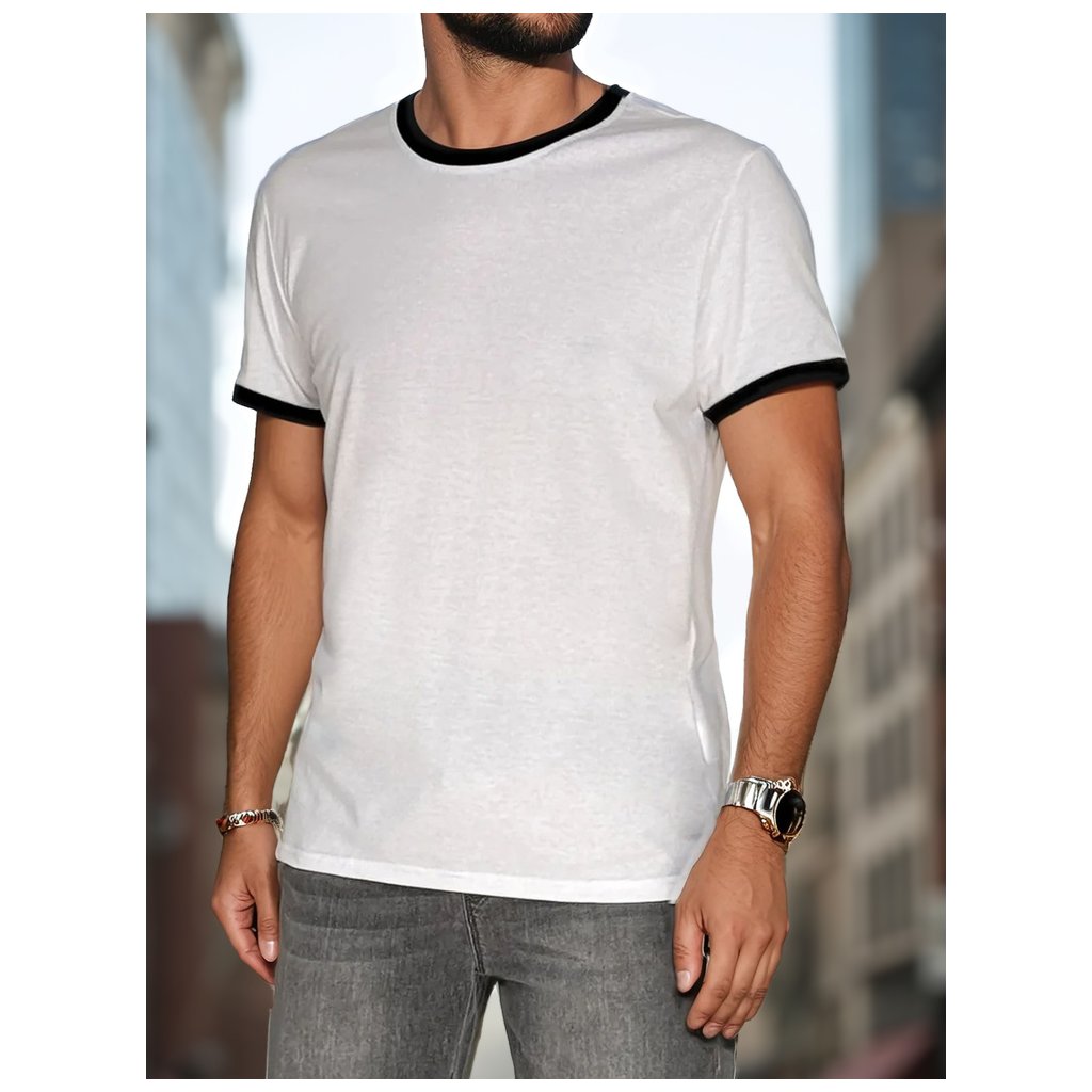 Toto základné pánske tričko s univerzálnym strihom je ideálne pre tých, ktorí oceňujú jednoduchosť a pohodlie. Výstrih a manžety rukávov sú zdobené kontrastnými pruhmi, ktoré dodávajú tričku osobitý charakter. Je vyrobené z mäkkej, priedušnej látky, je ideálne pre teplejšie dni. Hodí sa k mestskému aj ležérnemu jarnému outfitu.