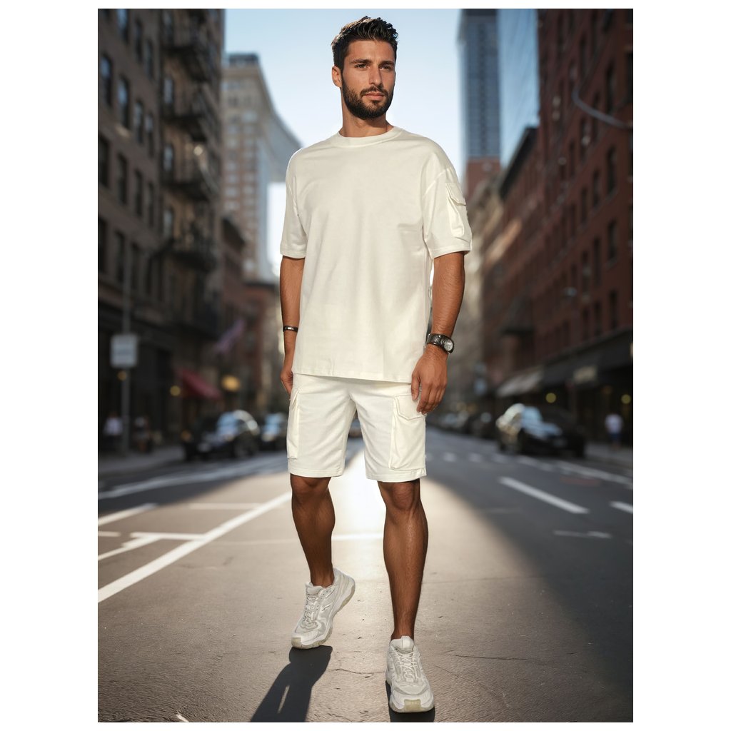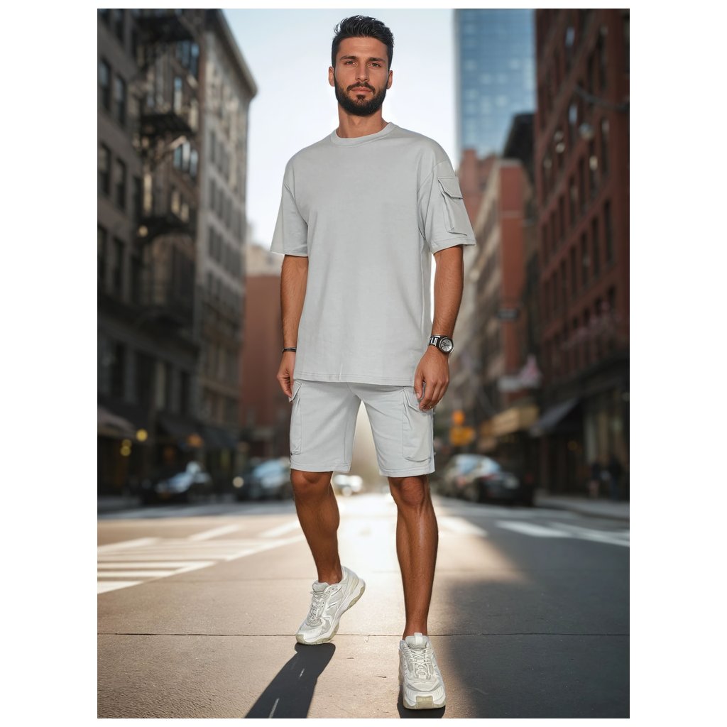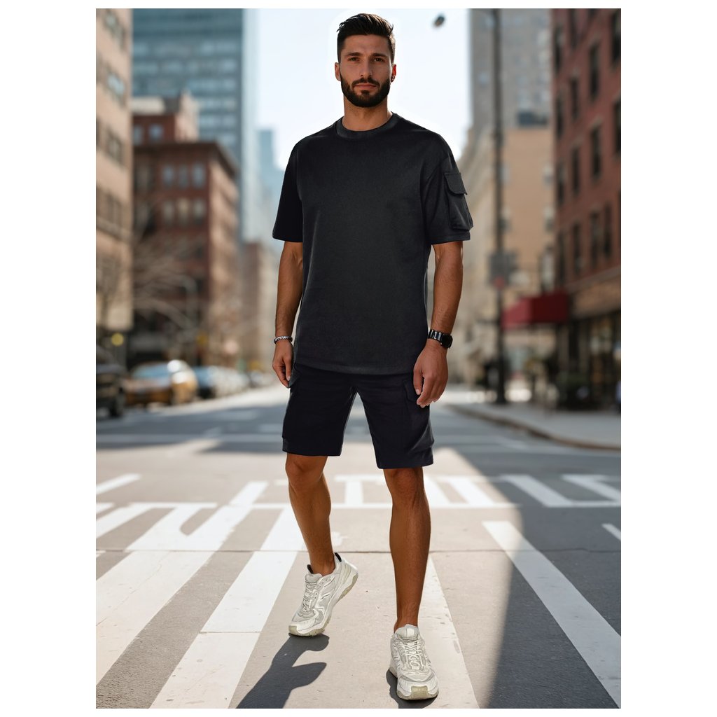 Táto pánska tepláková súprava kombinuje pohodlie s módnym mestským štýlom. Tričko s krátkym rukávom má ozdobné vrecko na ramene, zatiaľ čo cargo kraťasy majú štyri vrecká a elastický pás s nastaviteľnou šnúrkou. Vyrobené z mäkkej látky, ideálne pre jarné dni a každodenné mestské aktivity.