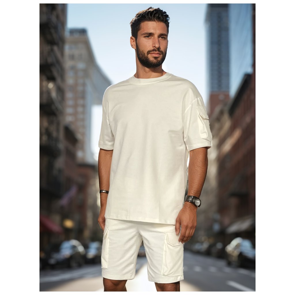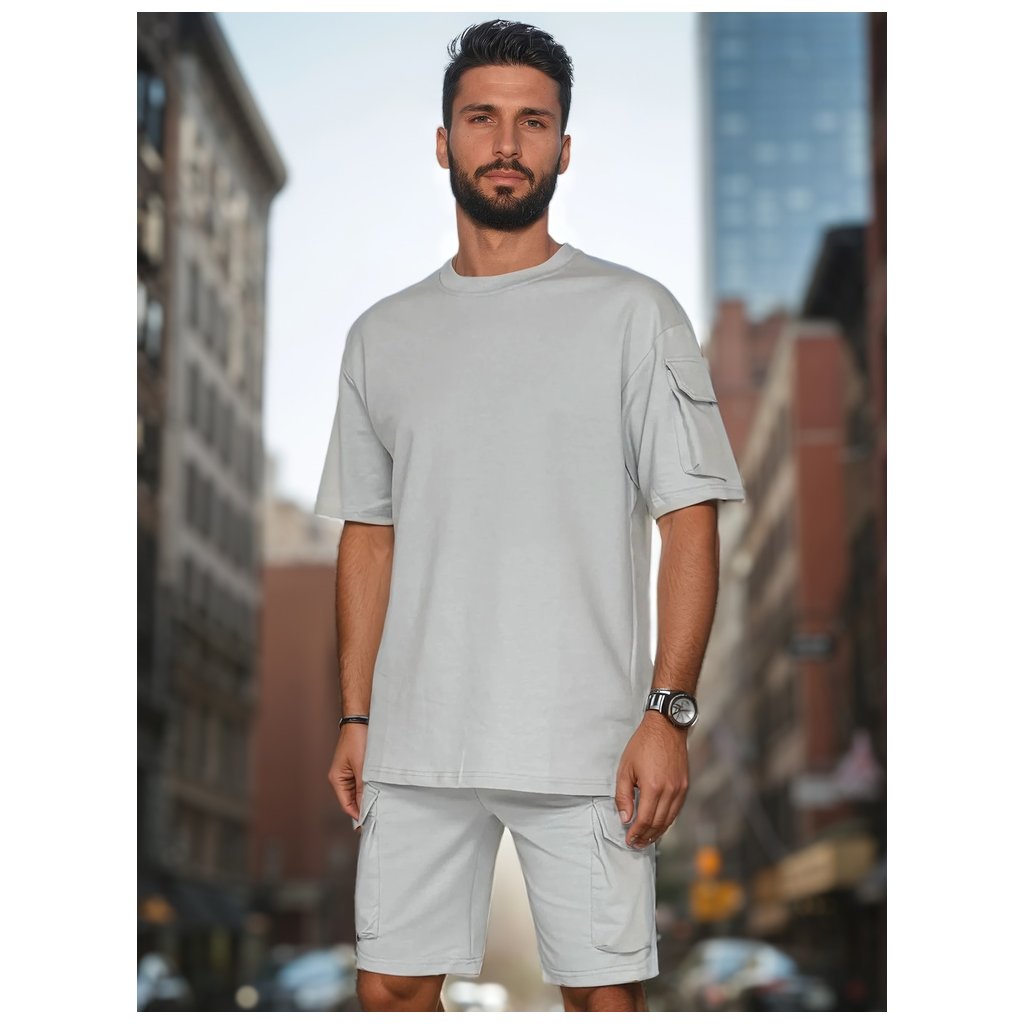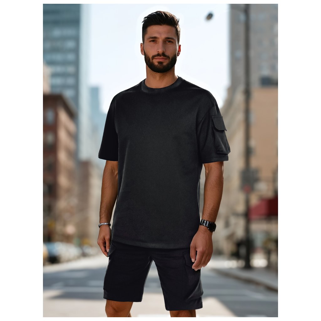 Táto pánska tepláková súprava kombinuje pohodlie s módnym mestským štýlom. Tričko s krátkym rukávom má ozdobné vrecko na ramene, zatiaľ čo cargo kraťasy majú štyri vrecká a elastický pás s nastaviteľnou šnúrkou. Vyrobené z mäkkej látky, ideálne pre jarné dni a každodenné mestské aktivity.