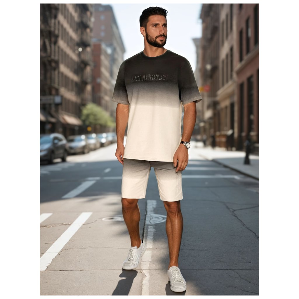 Táto dvojdielna pánska súprava je ideálna na každodenné nosenie. Obsahuje tričko s krátkym rukávom a okrúhlym výstrihom a rovno strihané kraťasy. Oba kusy majú ombré efekt, ktorý prechádza z tmavších do svetlejších tónov. Tričko zdobí reliéfny nápis „LOS ANGELES“ a kraťasy majú elastický pás so sťahovacou šnúrkou a dve predné vrecká.