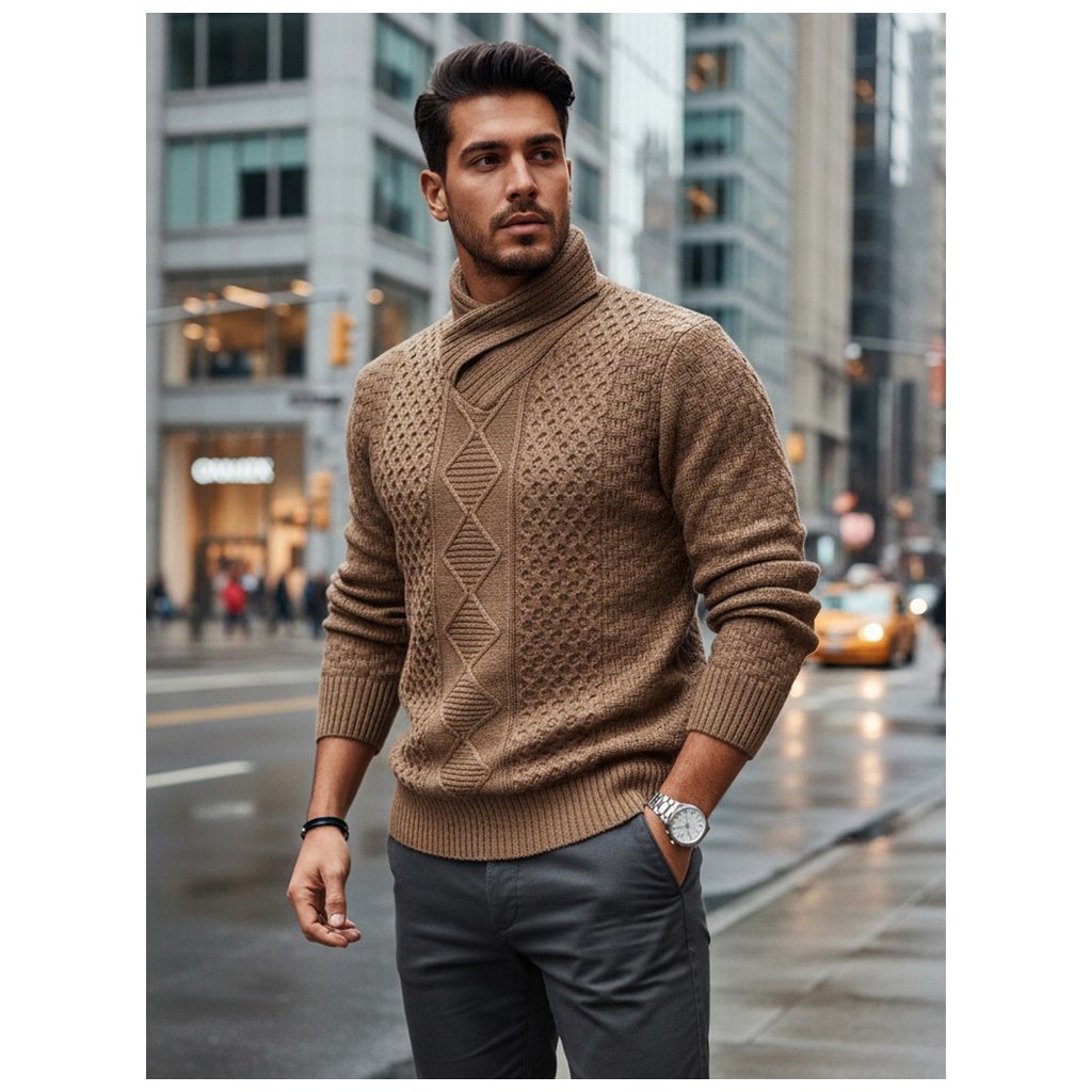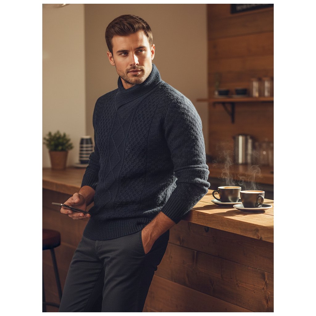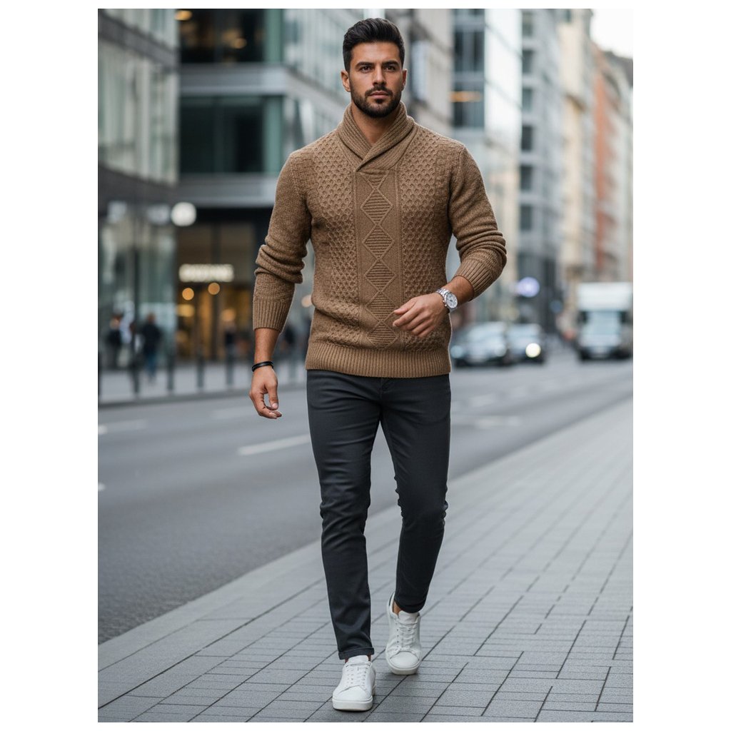 Štýlový pánsky sveter s výraznou textúrou a výrazným šálovým golierom. Vyrobený z vysoko kvalitného materiálu, poskytuje teplo a pohodlie. Ideálny pre chladnejšie dni, keď je dôležité pohodlie aj štýlový vzhľad. Hodí sa k džínsom a elegantným nohaviciam.