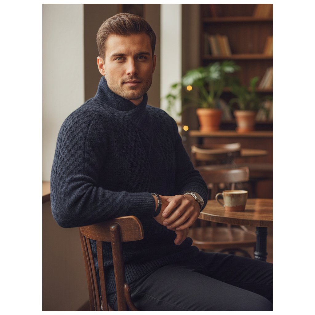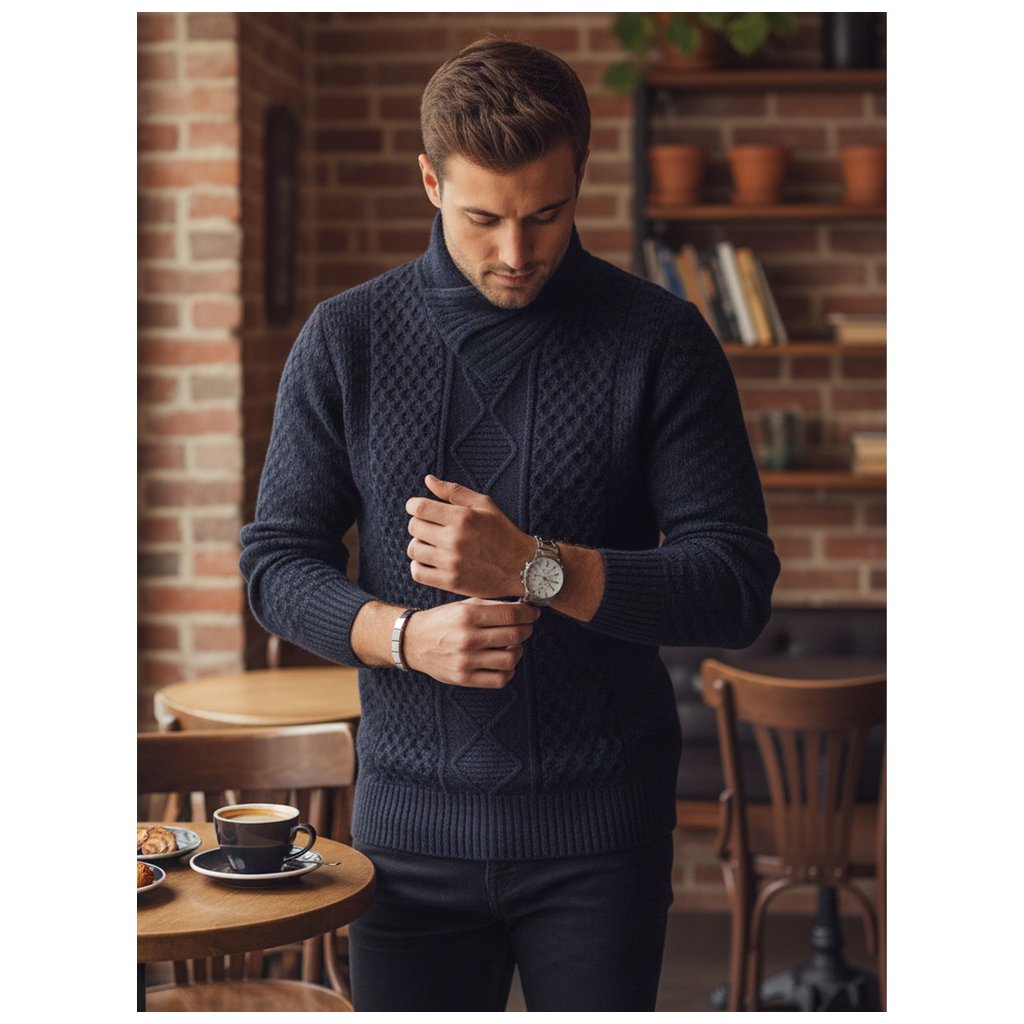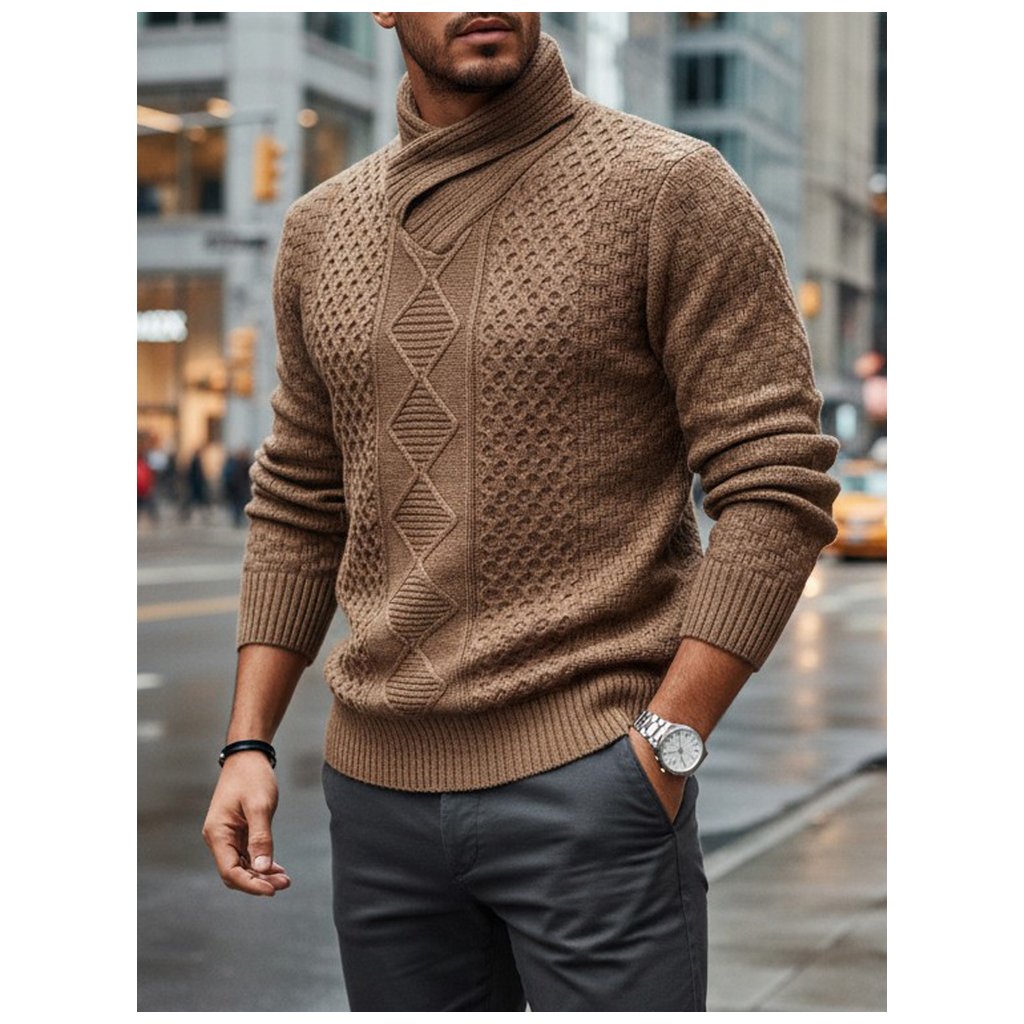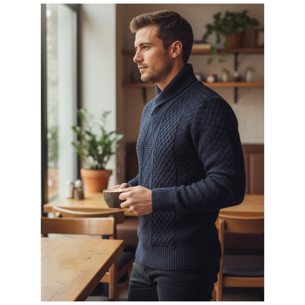 Štýlový pánsky sveter s výraznou textúrou a výrazným šálovým golierom. Vyrobený z vysoko kvalitného materiálu, poskytuje teplo a pohodlie. Ideálny pre chladnejšie dni, keď je dôležité pohodlie aj štýlový vzhľad. Hodí sa k džínsom a elegantným nohaviciam.