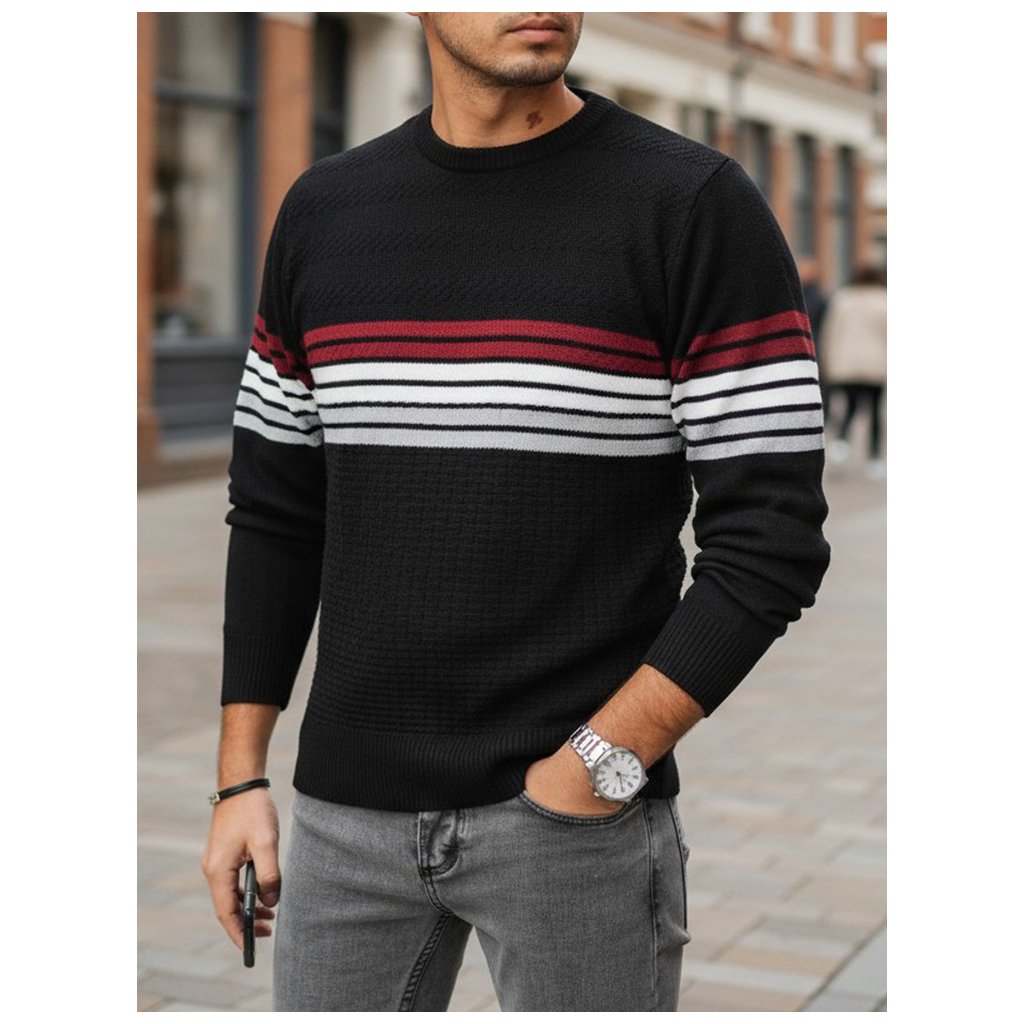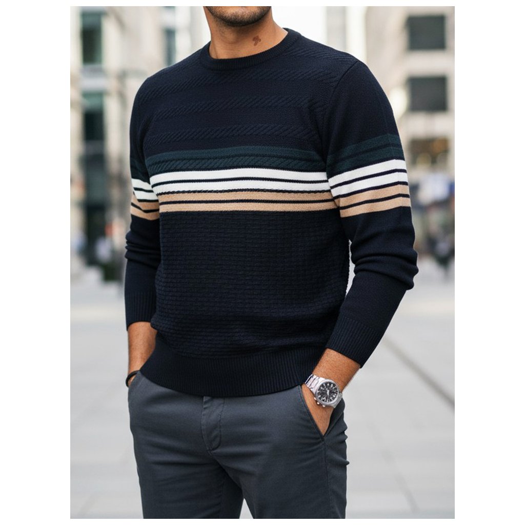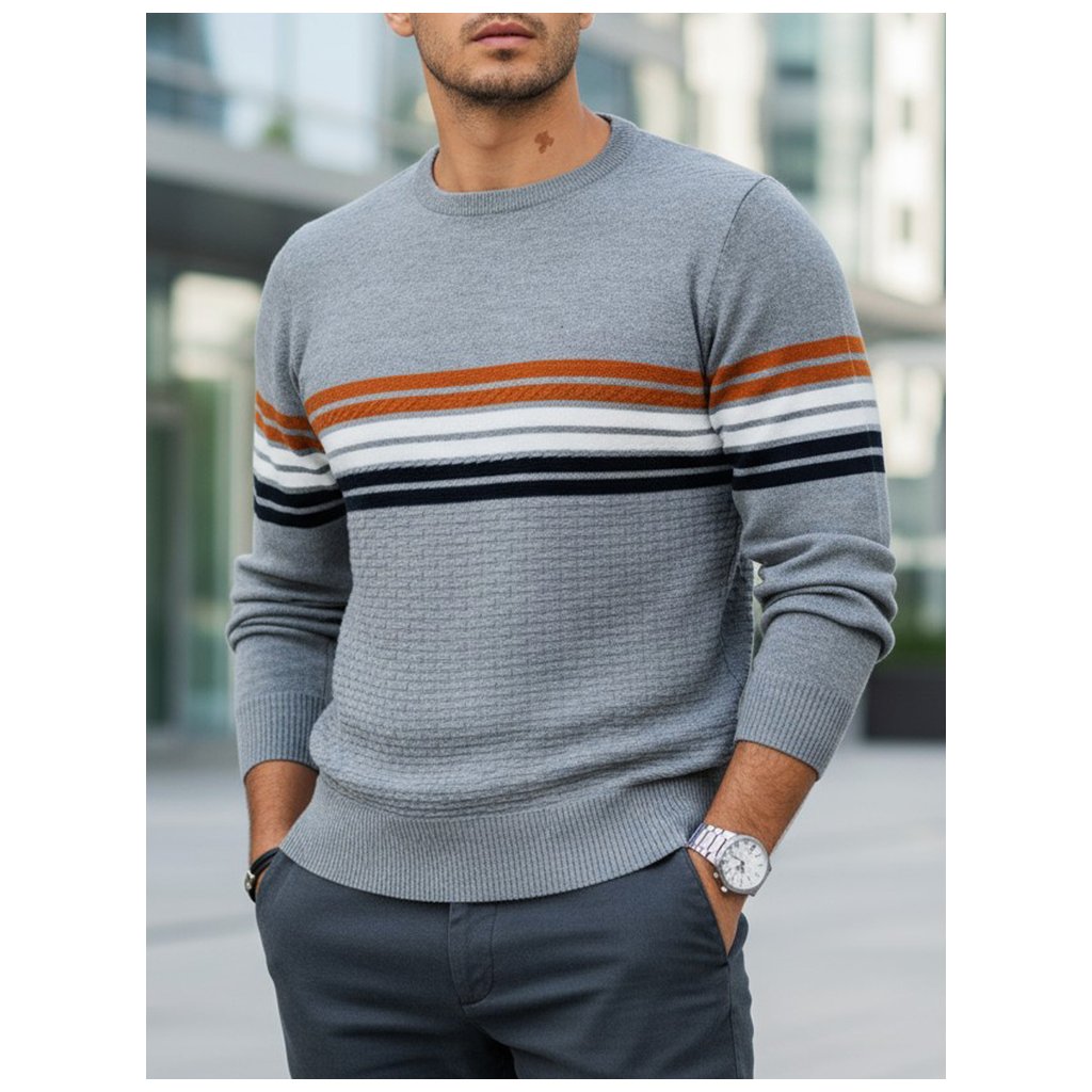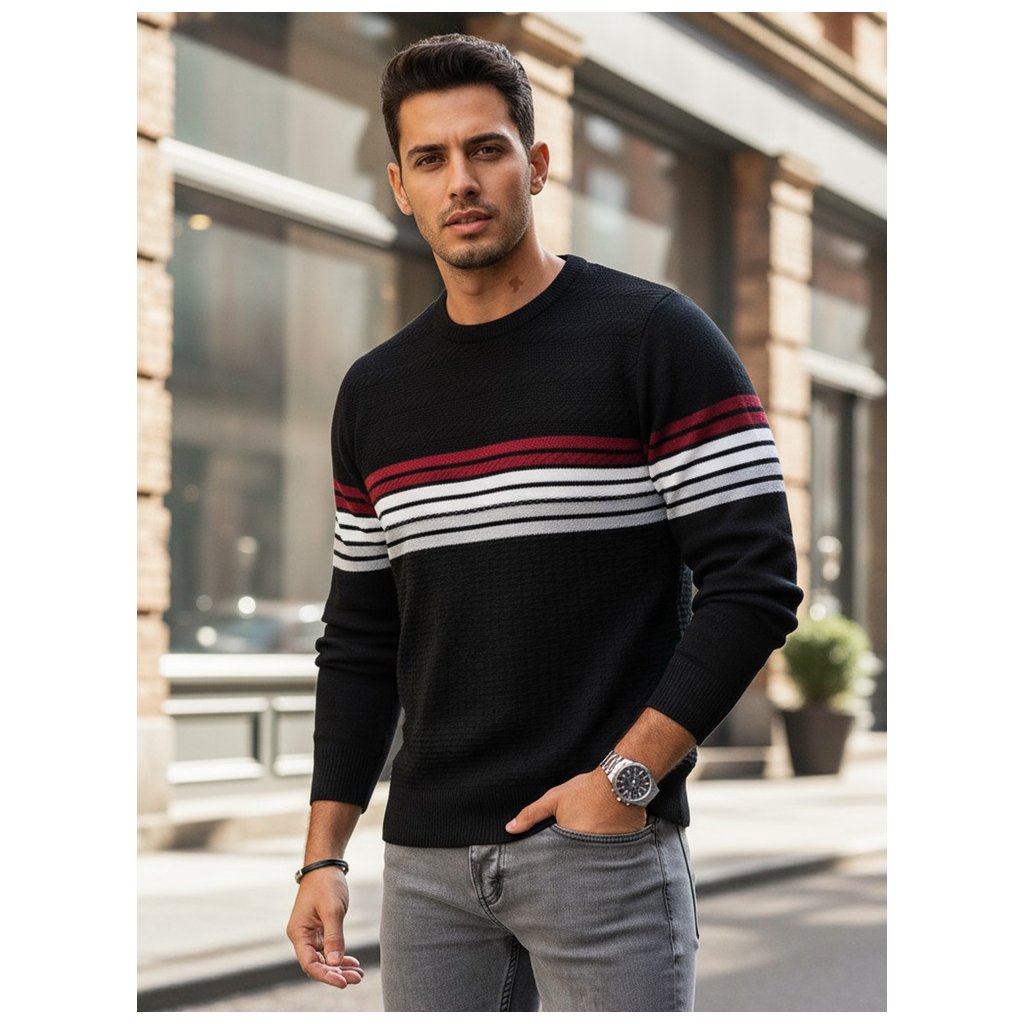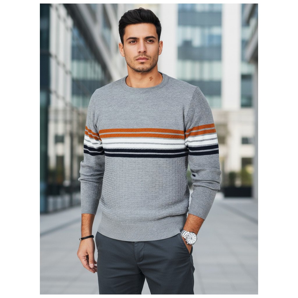 Tento štýlový pánsky sveter s vodorovnými pruhmi je kombináciou klasiky a moderného. Vyrobený z mäkkej pleteniny s vysokým obsahom vlny, zaručuje teplo a pohodlie. Jemná textúra látky a kontrastné pruhy na hrudi mu dodávajú osobitý mestský charakter.